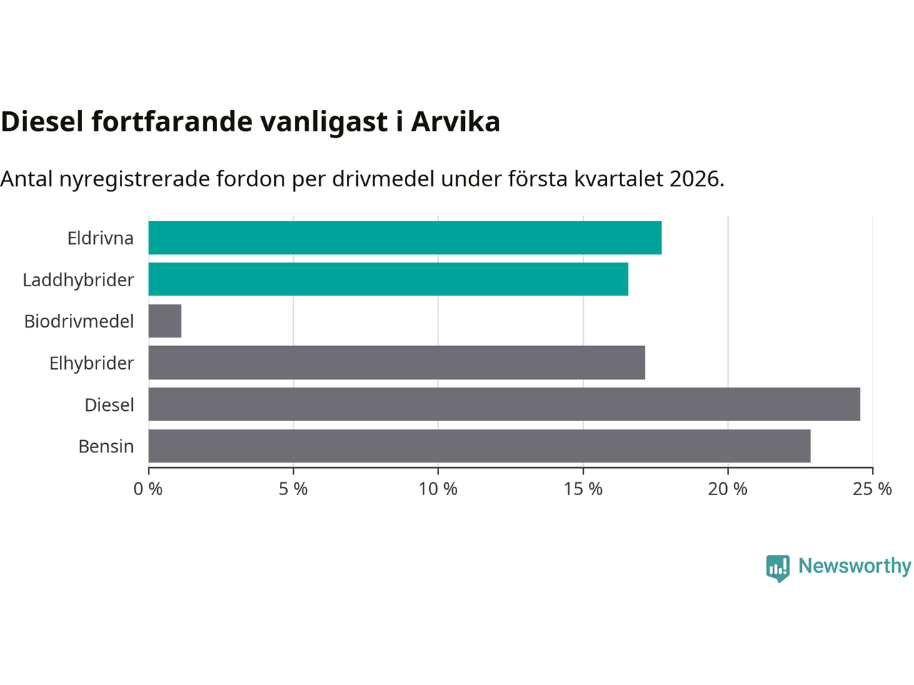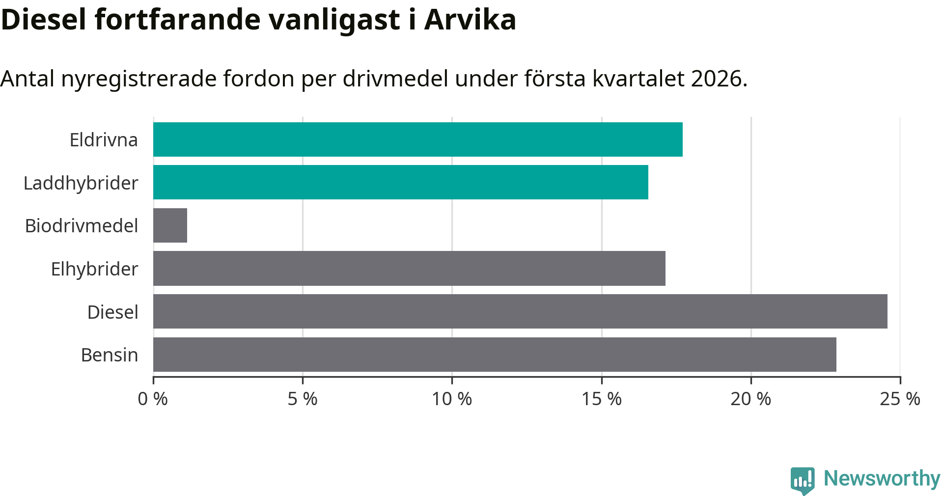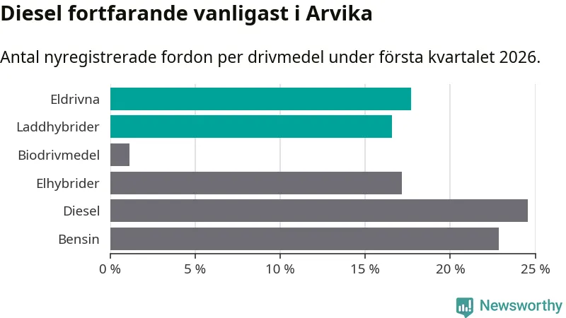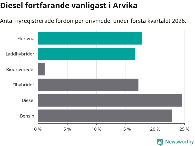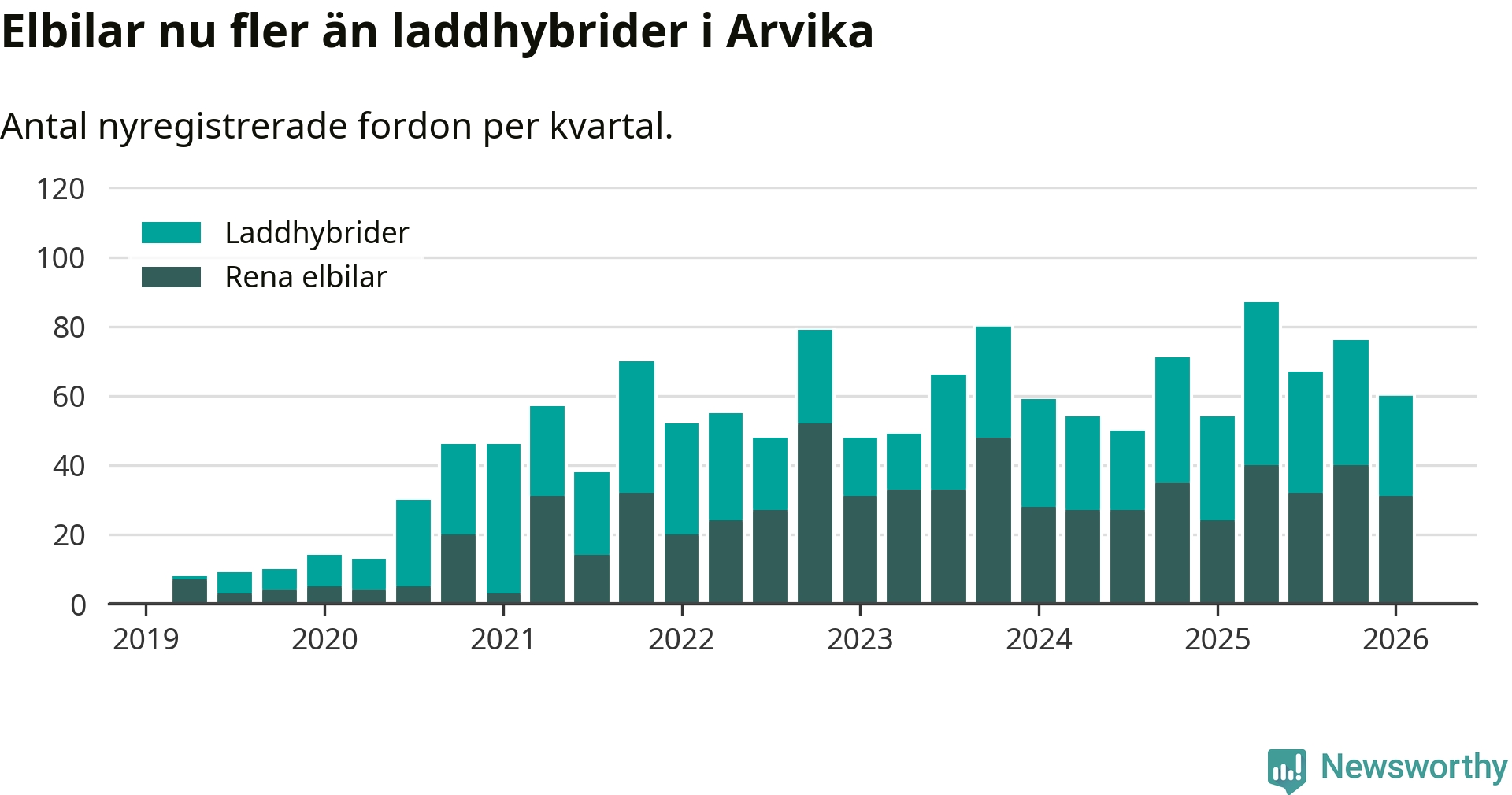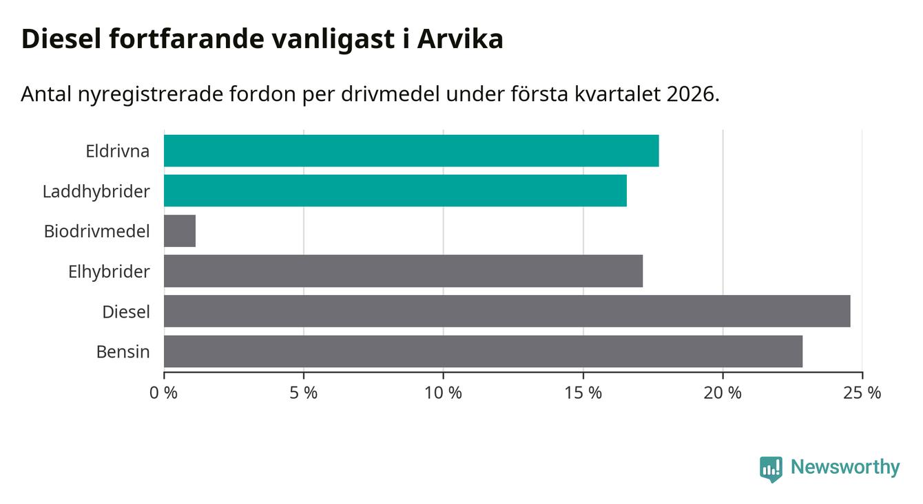 Under första kvartalet 2026 var 34 procent av alla nyregistrerade personbilar i Arvika laddbara (sammanlagt registrerades 175 nya bilar). Merparten av de laddbara bilarna var rena elbilar (18 procent av alla).