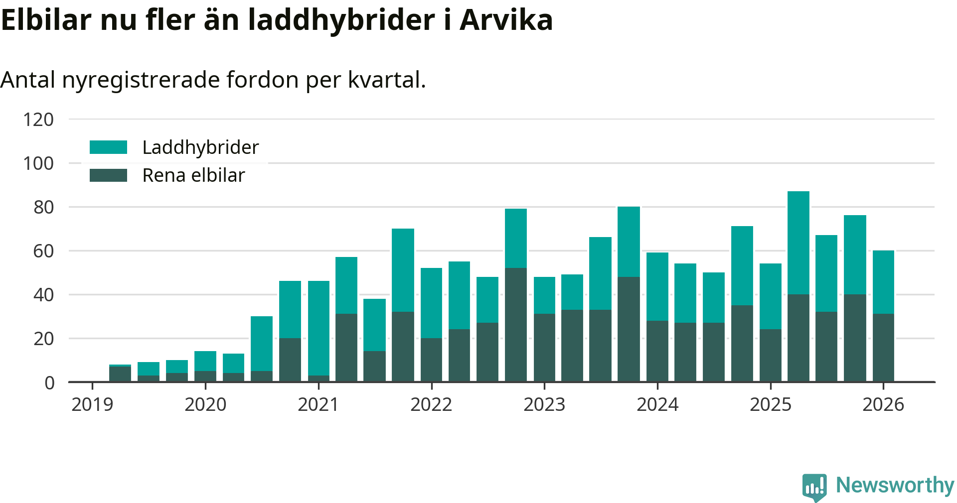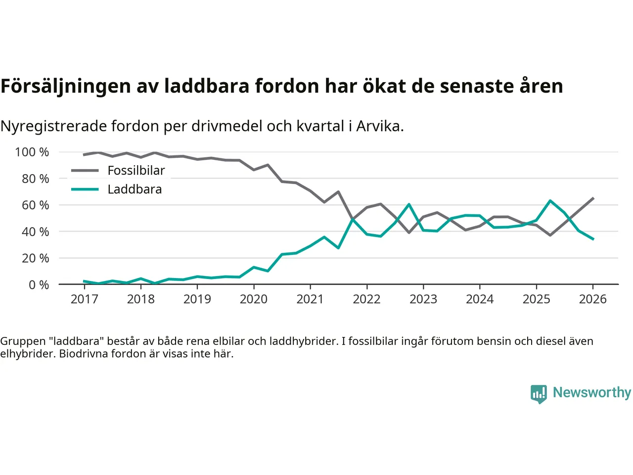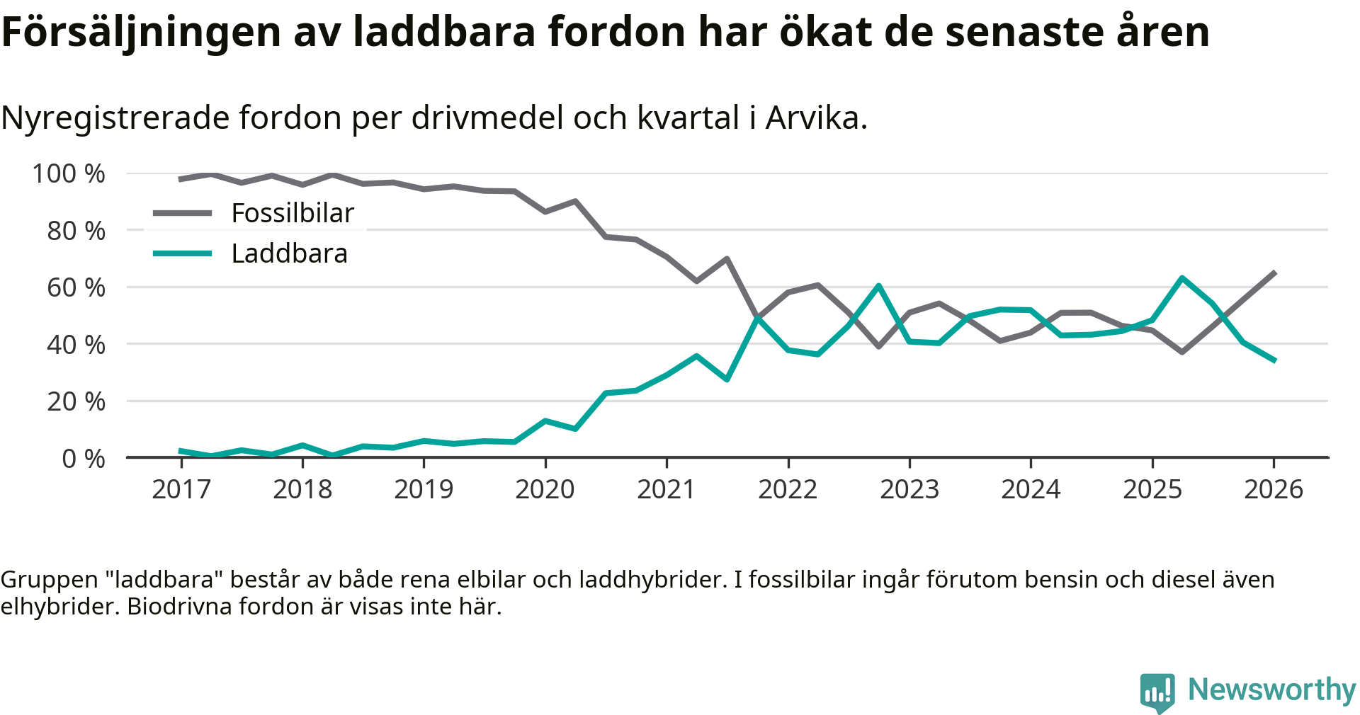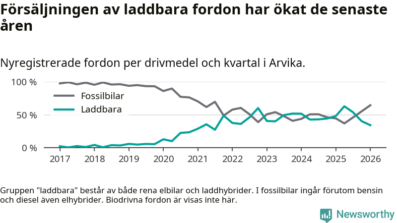 I Arvika minskade andelen laddbara bilar under första kvartalet jämfört med kvartalet innan (−6,1 procentenheter). Nyregistreringen peakade under andra kvartalet 2025 då 63 procent av de nya bilarna var laddbara.