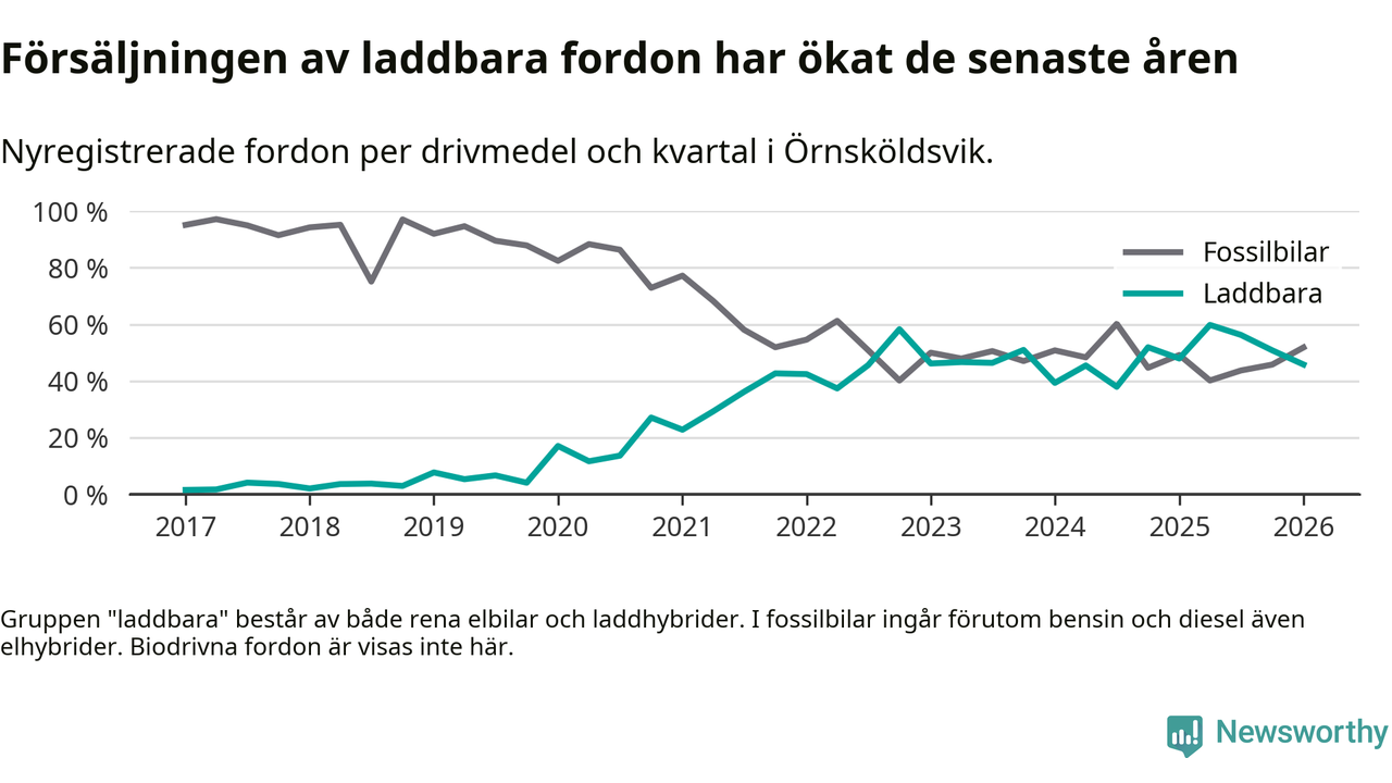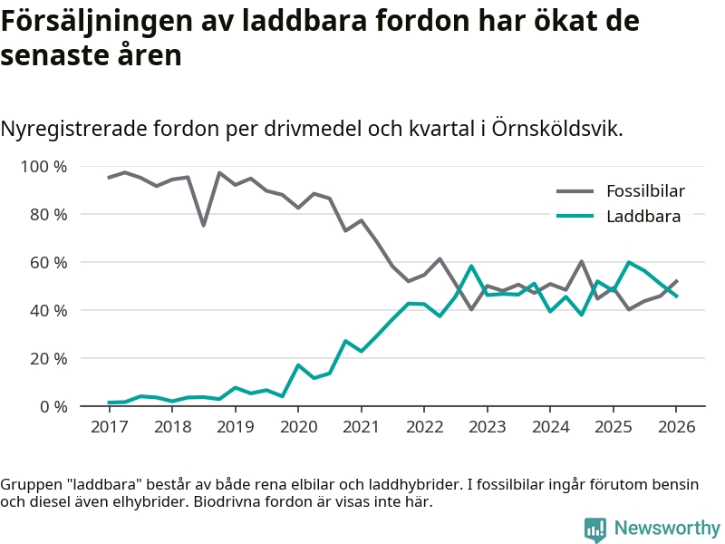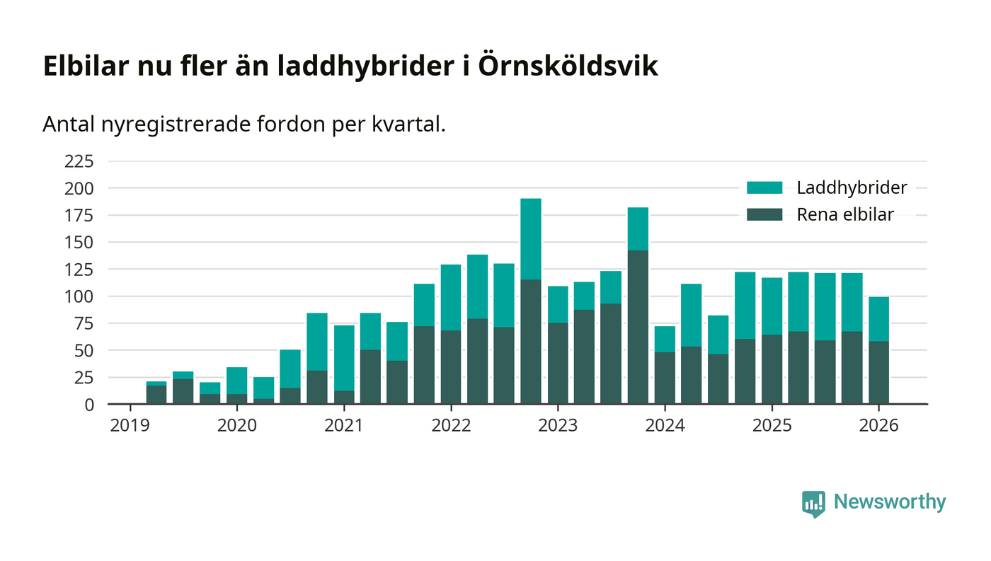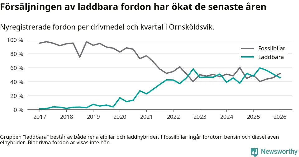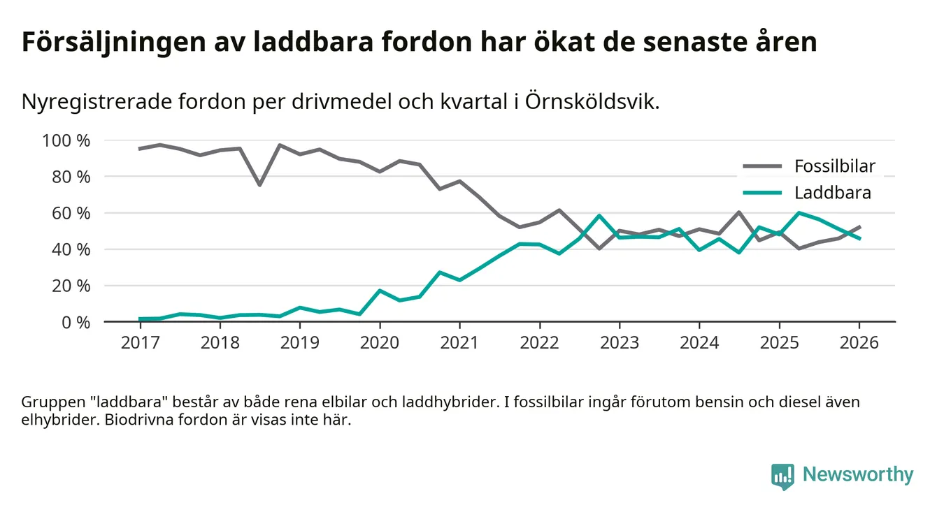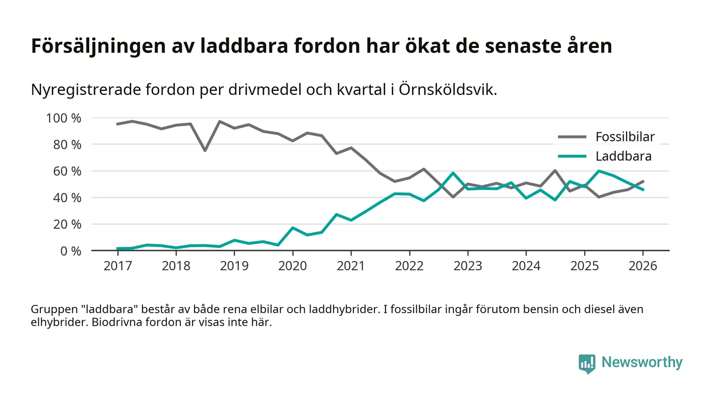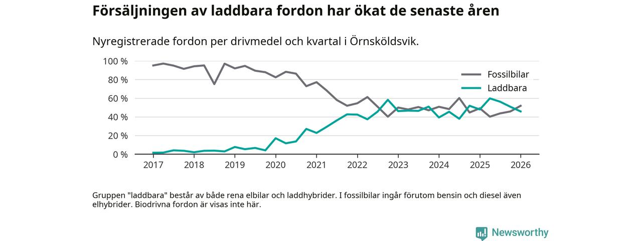 Under första kvartalet 2026 var 46 procent av alla nyregistrerade personbilar i Örnsköldsvik laddbara (sammanlagt registrerades 216 nya bilar). Merparten av de laddbara bilarna var rena elbilar (27 procent av alla).
