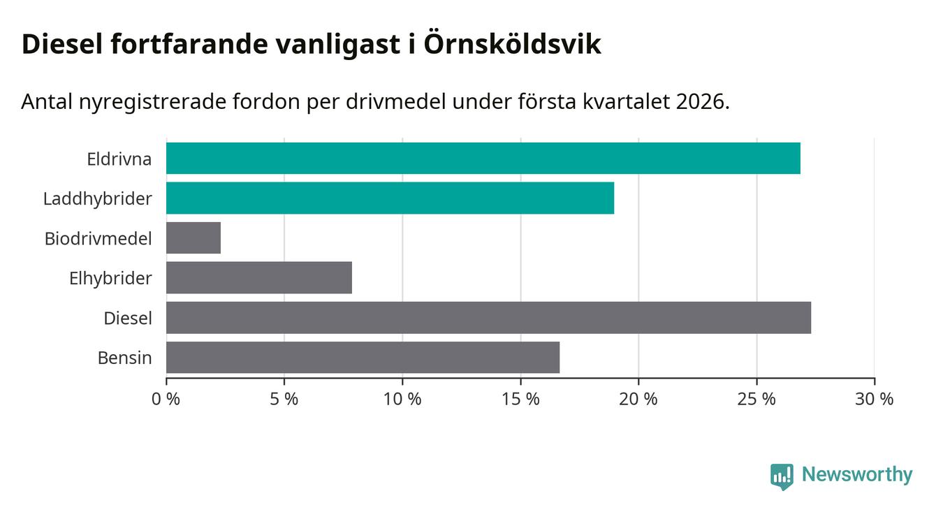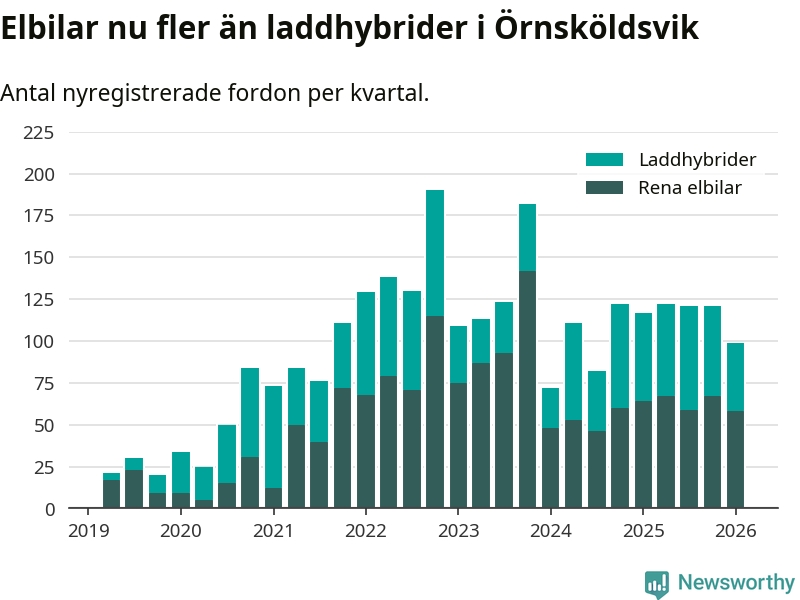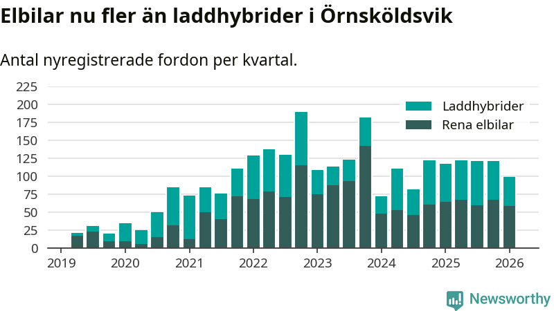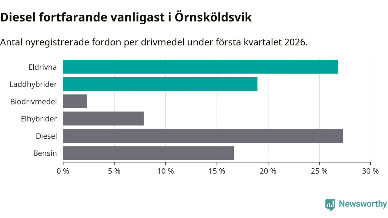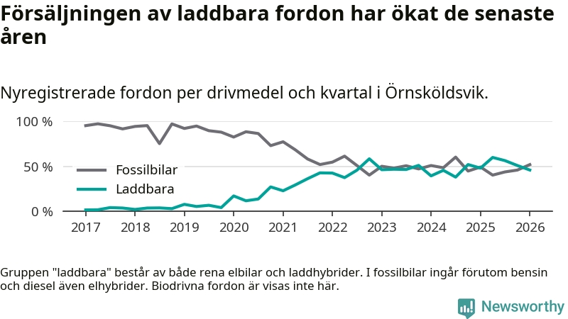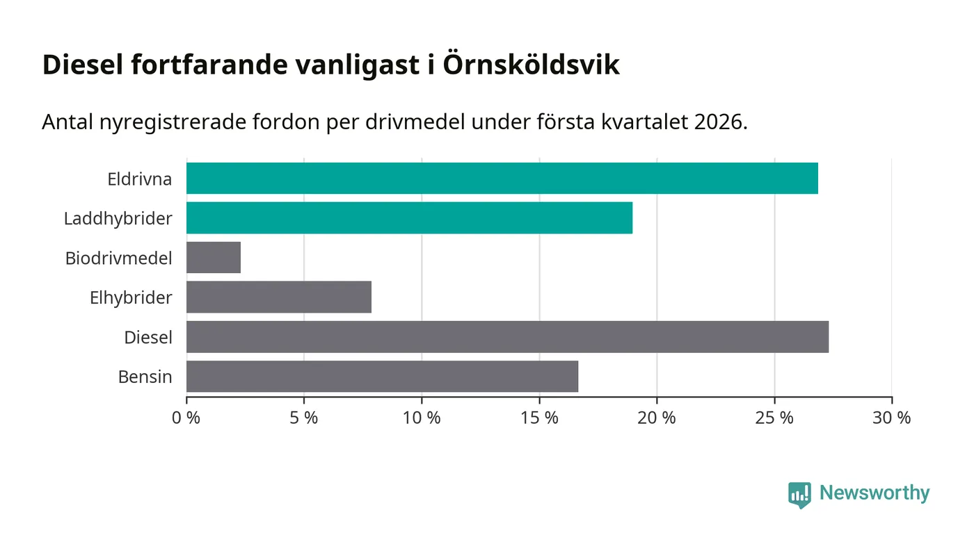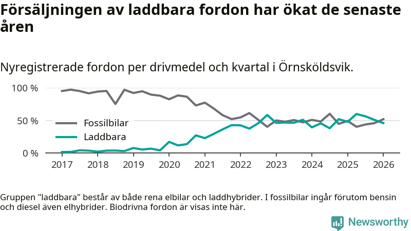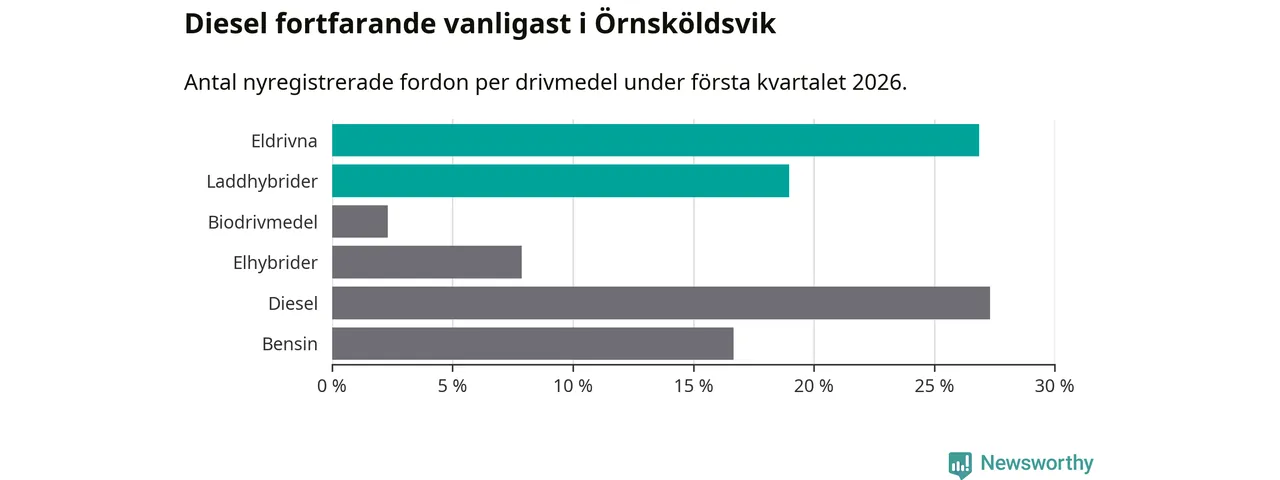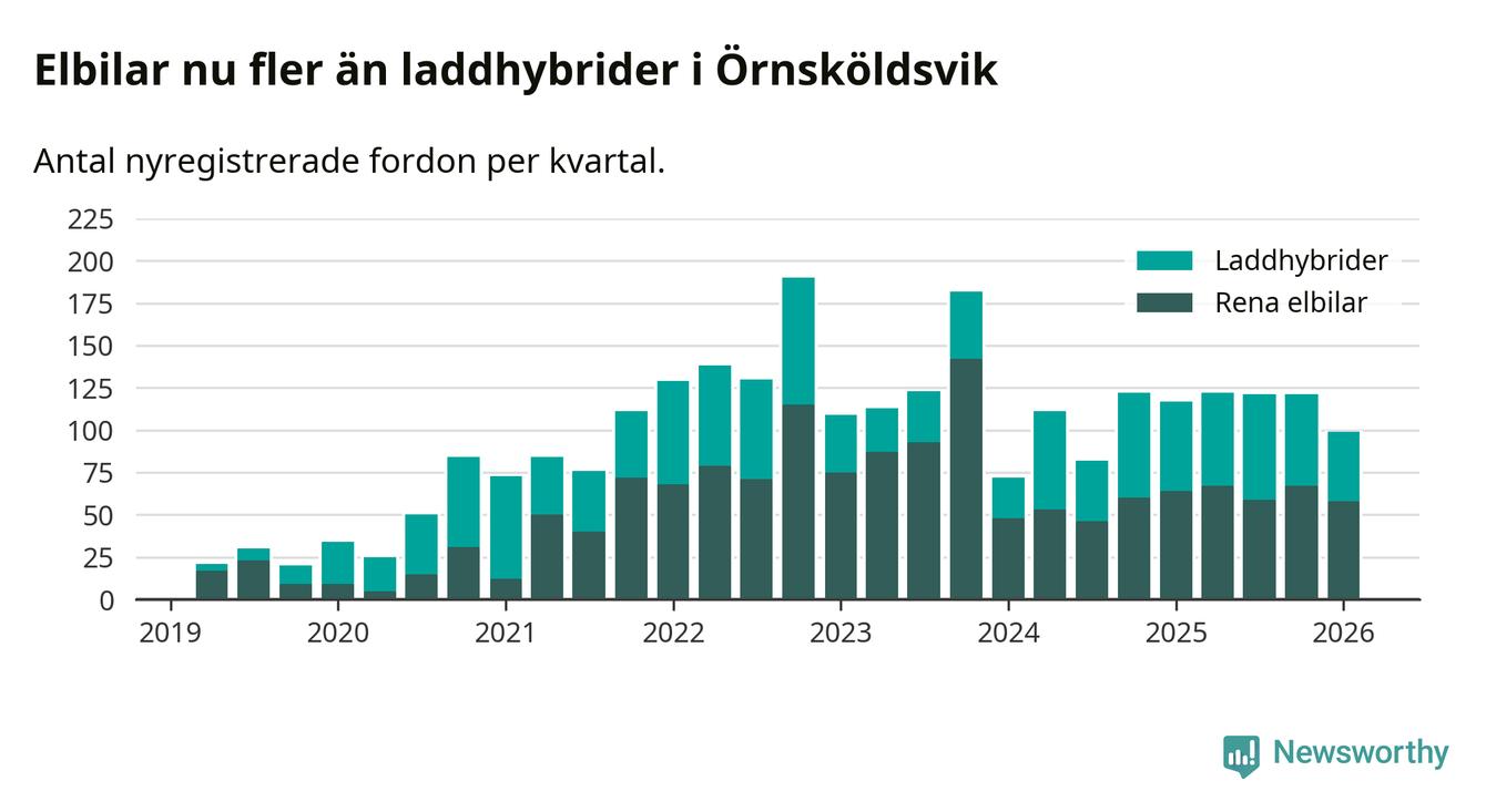 Under första kvartalet 2026 var 46 procent av alla nyregistrerade personbilar i Örnsköldsvik laddbara (sammanlagt registrerades 216 nya bilar). Merparten av de laddbara bilarna var rena elbilar (27 procent av alla).