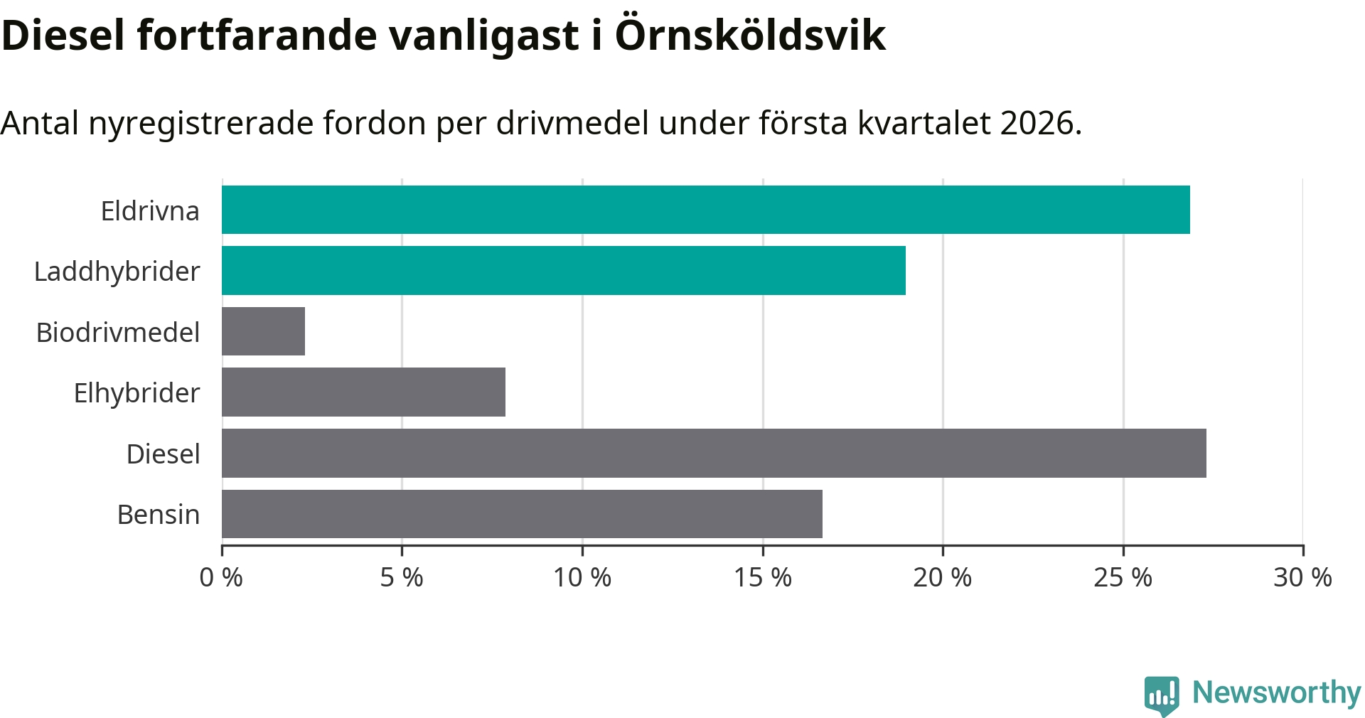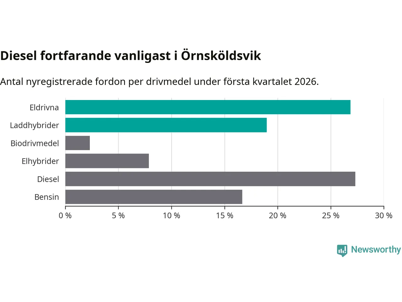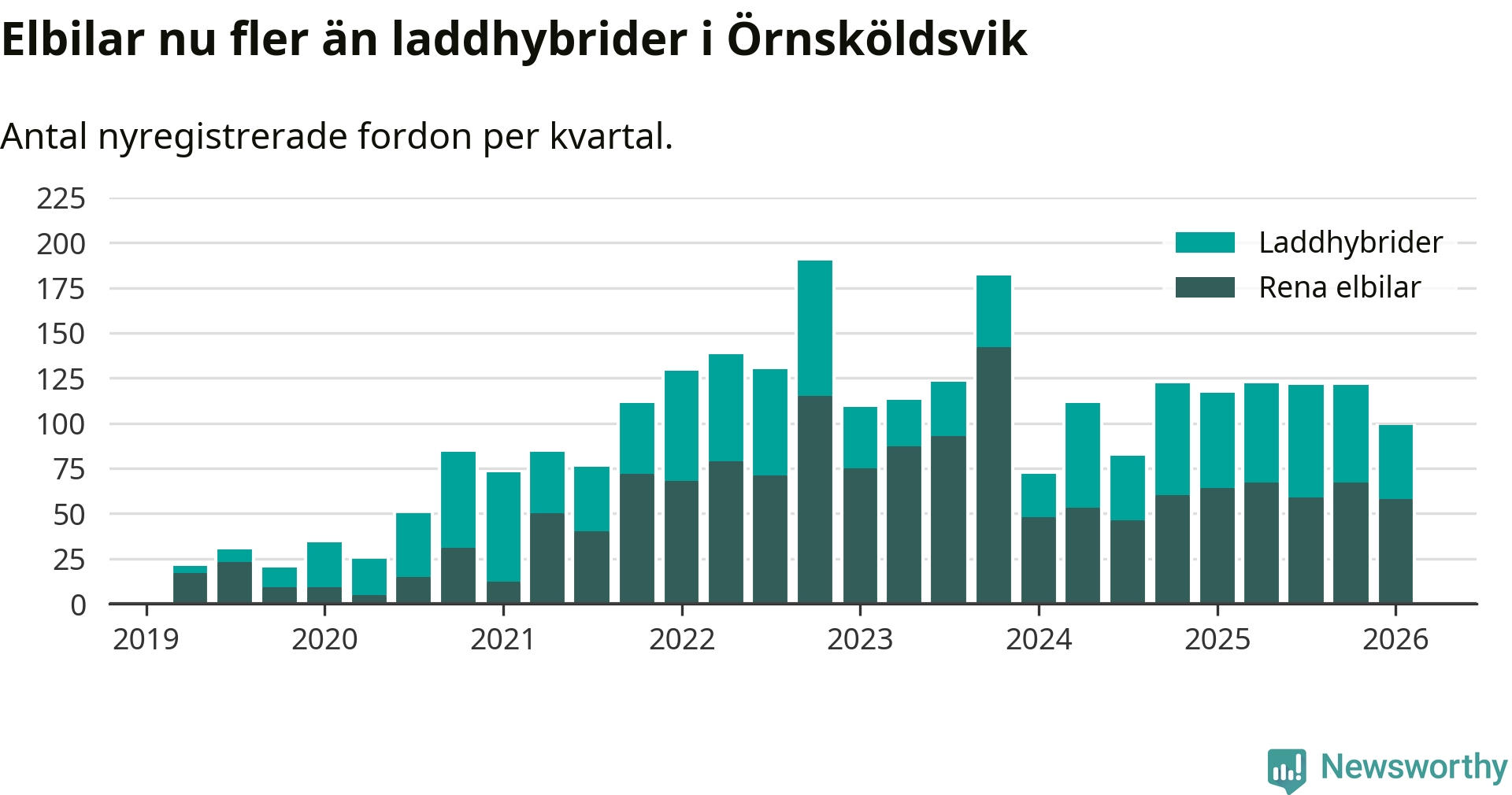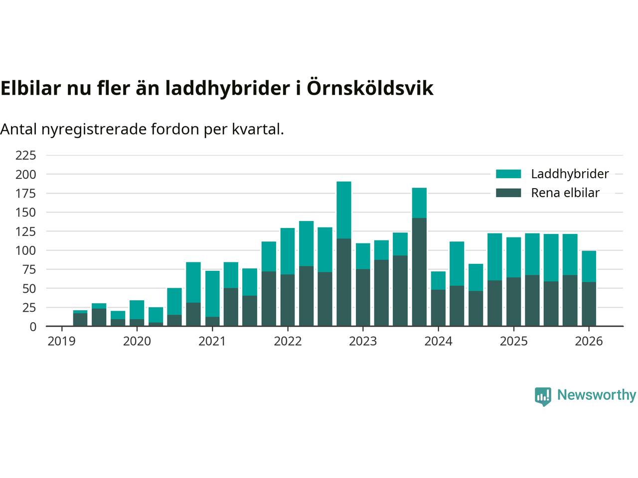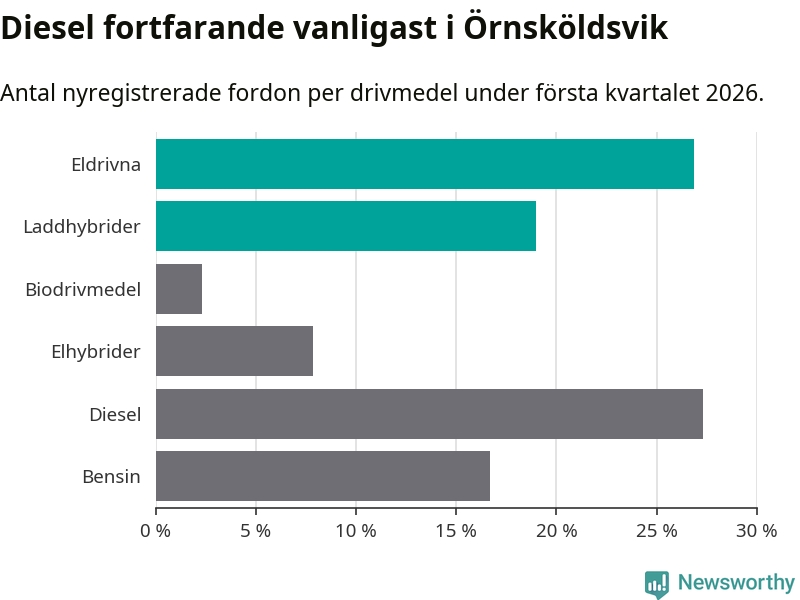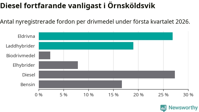 Under första kvartalet 2026 var 46 procent av alla nyregistrerade personbilar i Örnsköldsvik laddbara (sammanlagt registrerades 216 nya bilar). Merparten av de laddbara bilarna var rena elbilar (27 procent av alla).