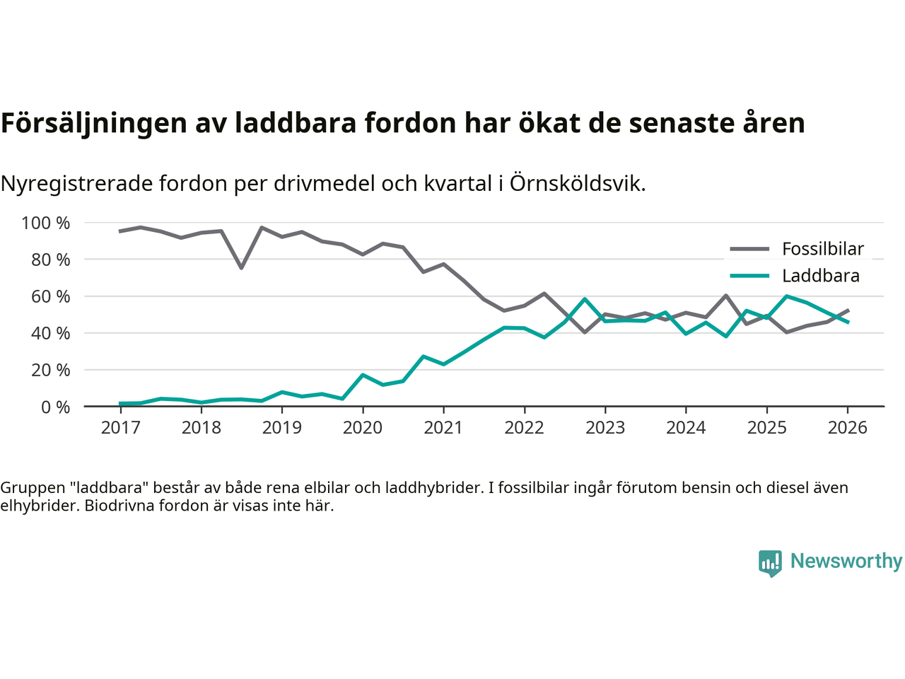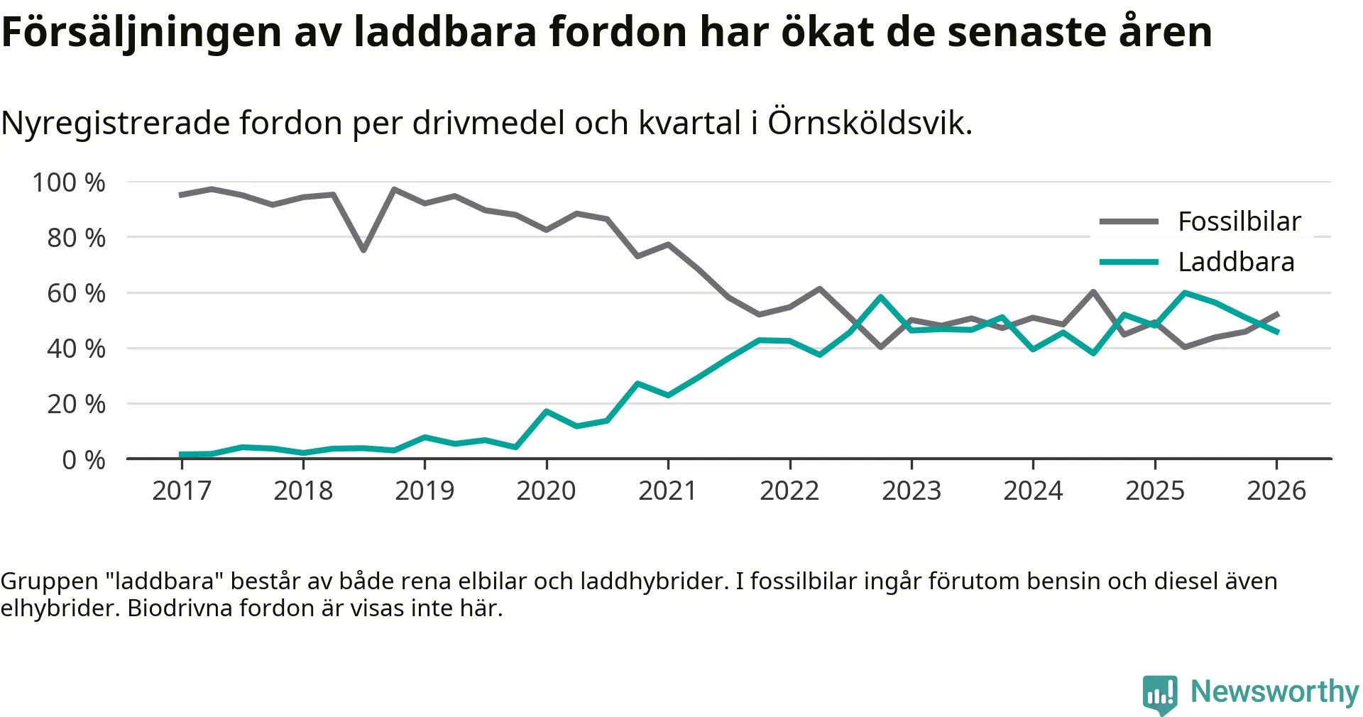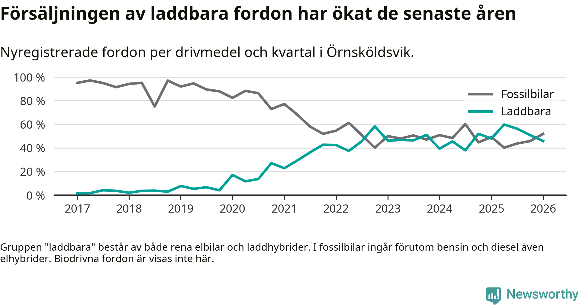 I Örnsköldsvik minskade andelen laddbara bilar under första kvartalet jämfört med kvartalet innan (−5 procentenheter). Nyregistreringen peakade under andra kvartalet 2025 då 60 procent av de nya bilarna var laddbara.