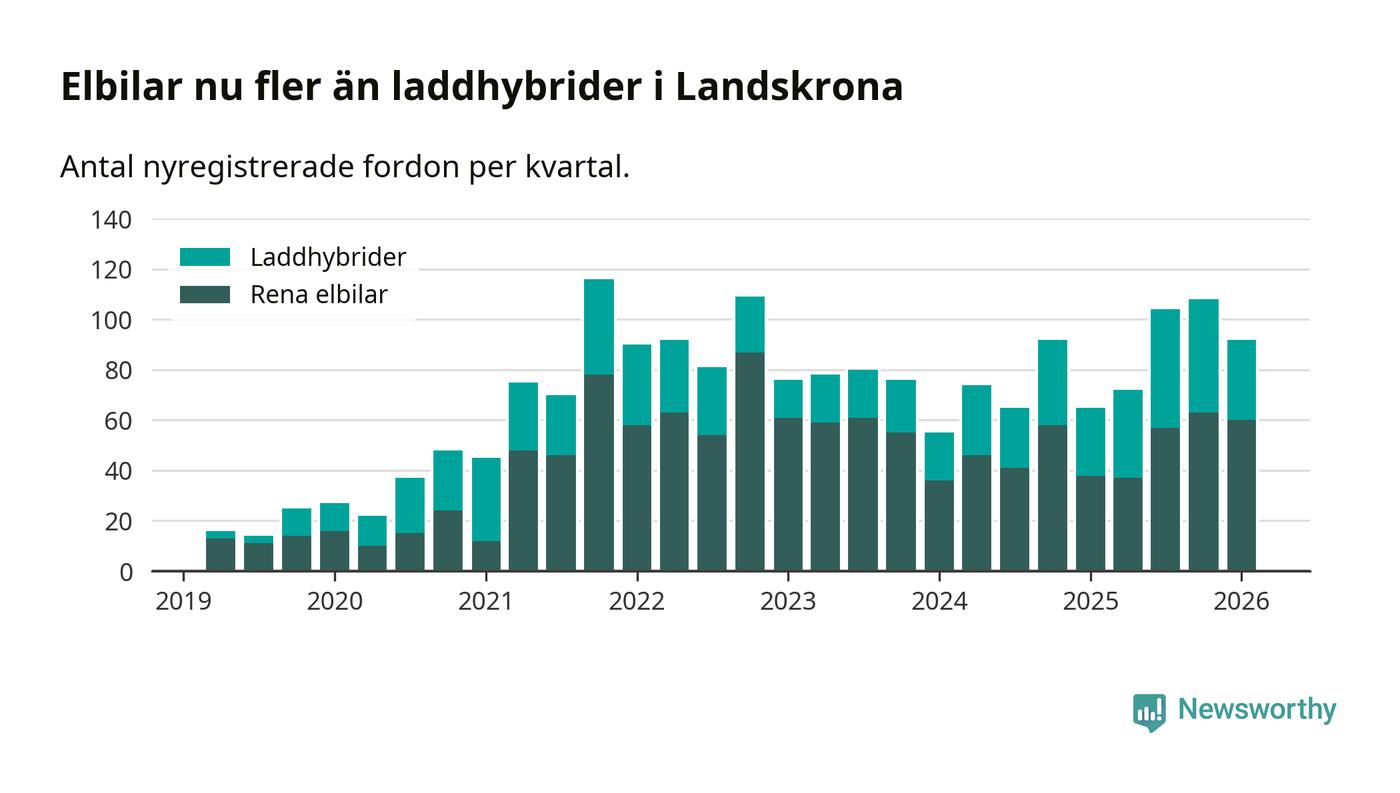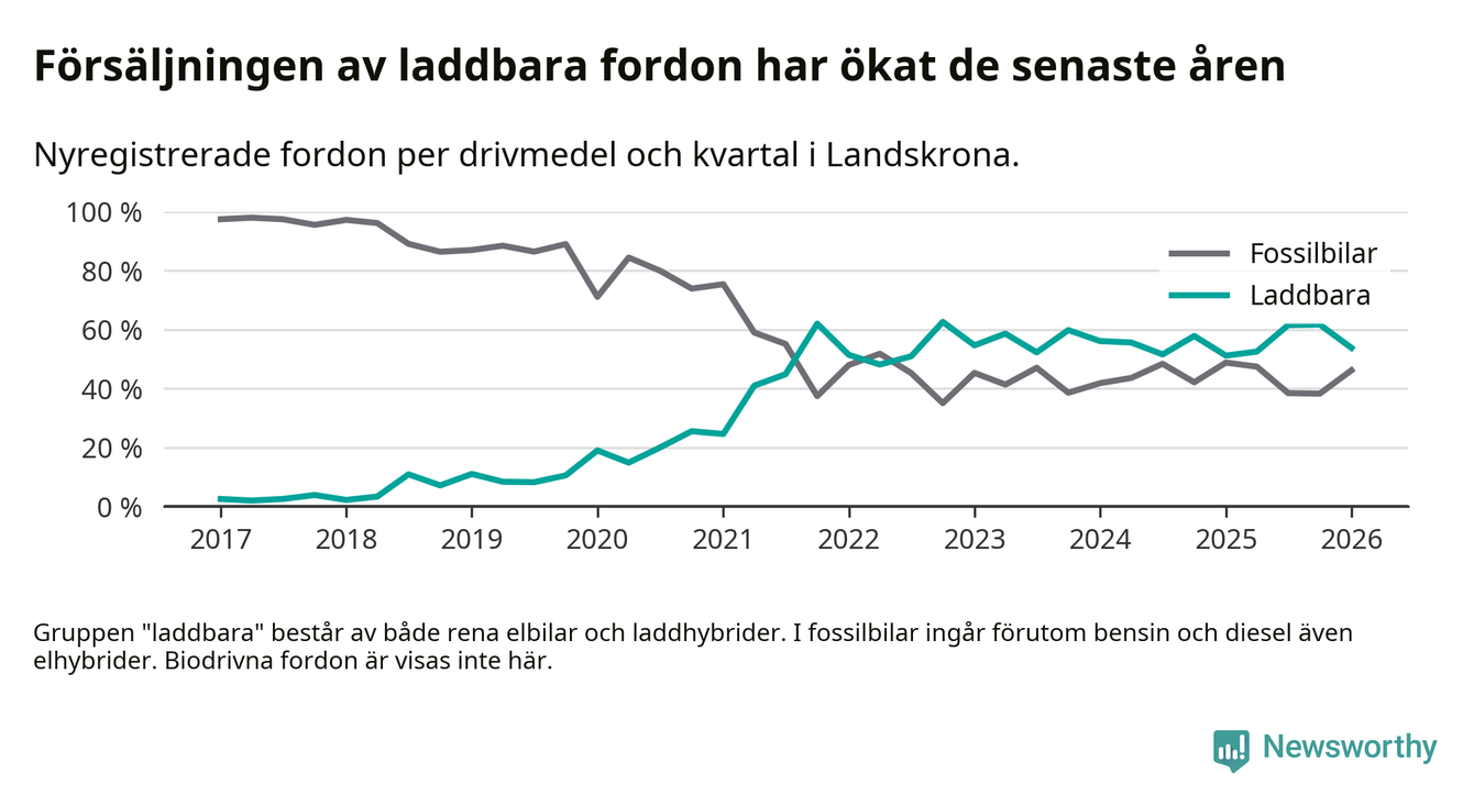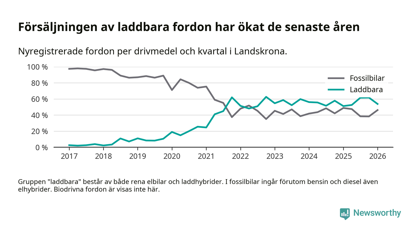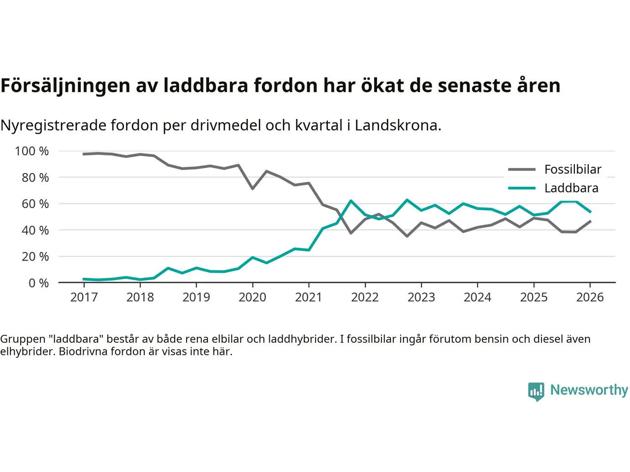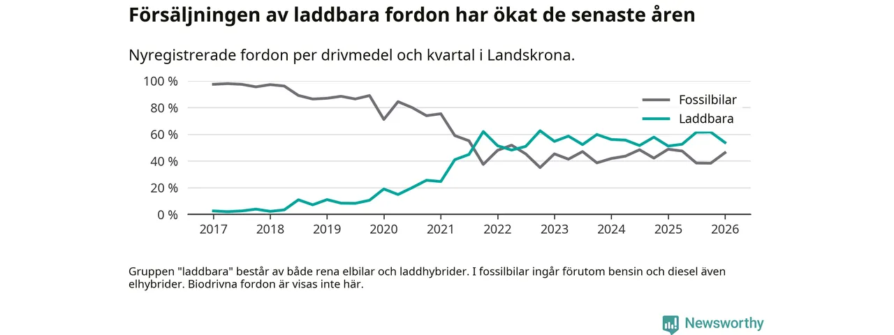Under första kvartalet 2026 var 54 procent av alla nyregistrerade personbilar i Landskrona laddbara (sammanlagt registrerades 171 nya bilar). Merparten av de laddbara bilarna var rena elbilar (35 procent av alla).