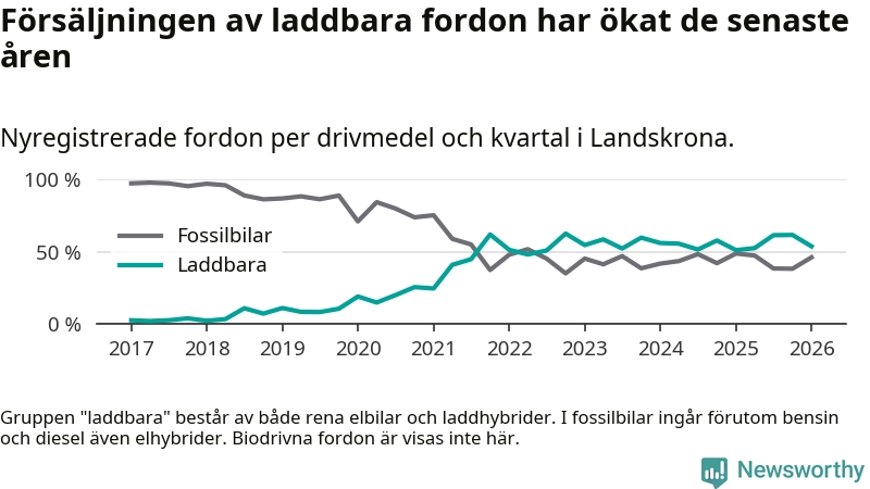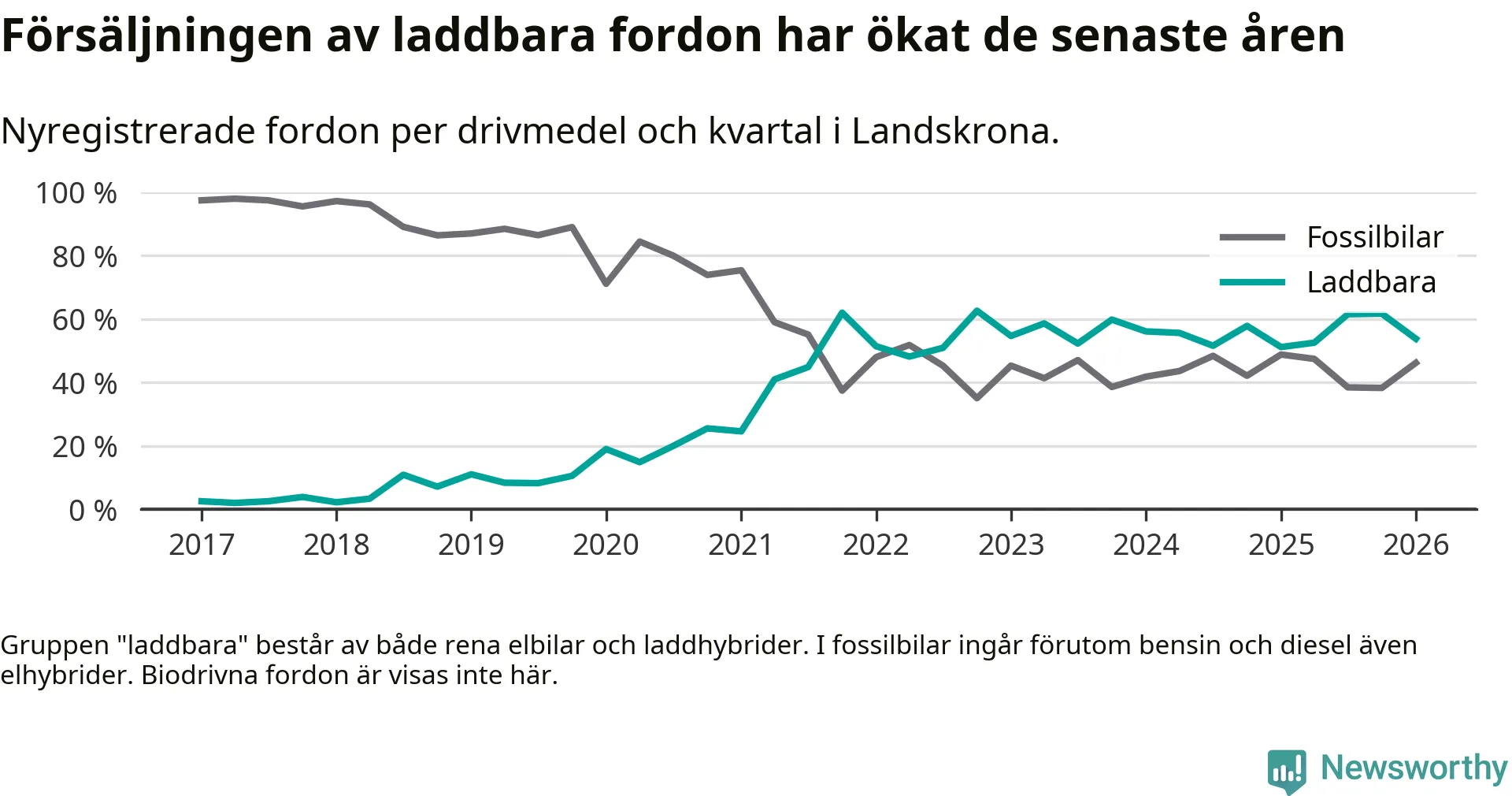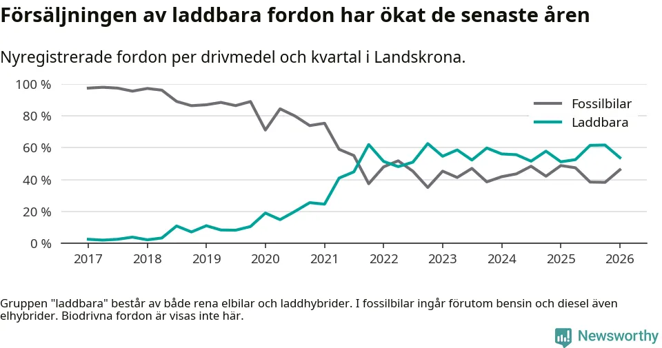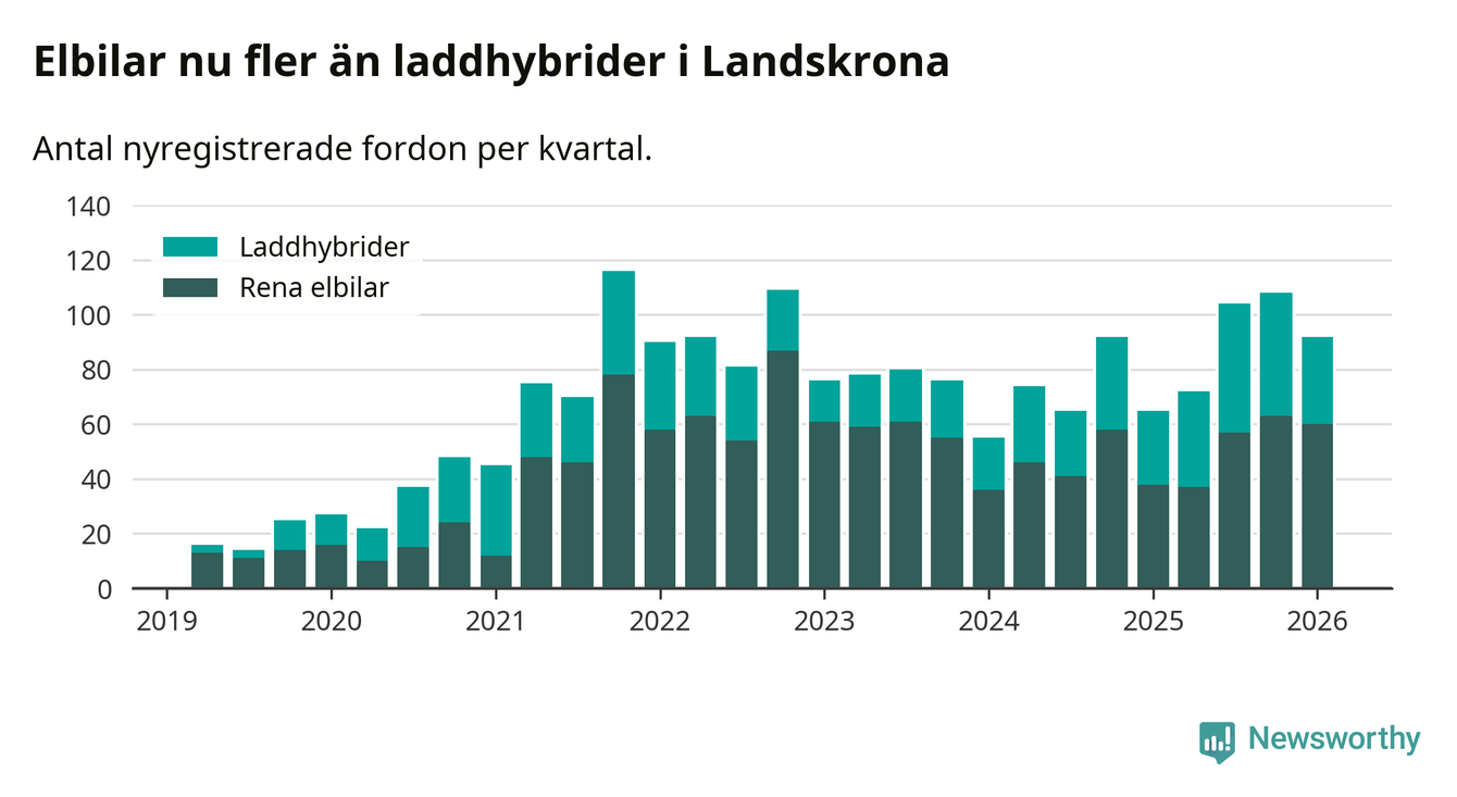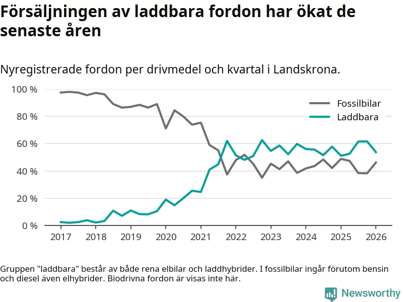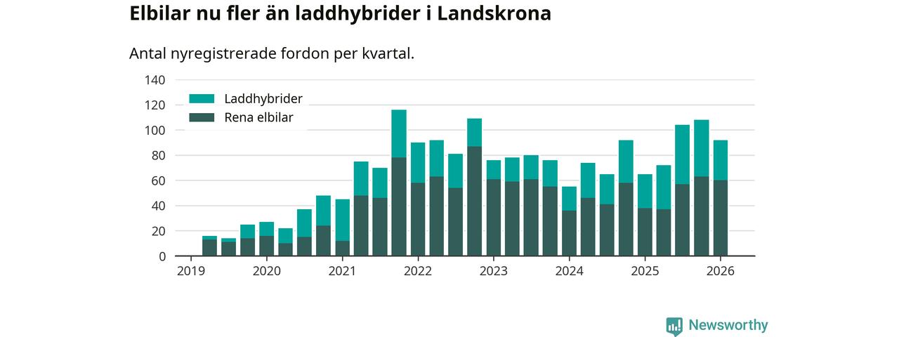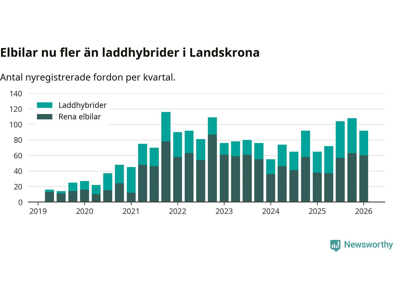 Under första kvartalet 2026 var 54 procent av alla nyregistrerade personbilar i Landskrona laddbara (sammanlagt registrerades 171 nya bilar). Merparten av de laddbara bilarna var rena elbilar (35 procent av alla).