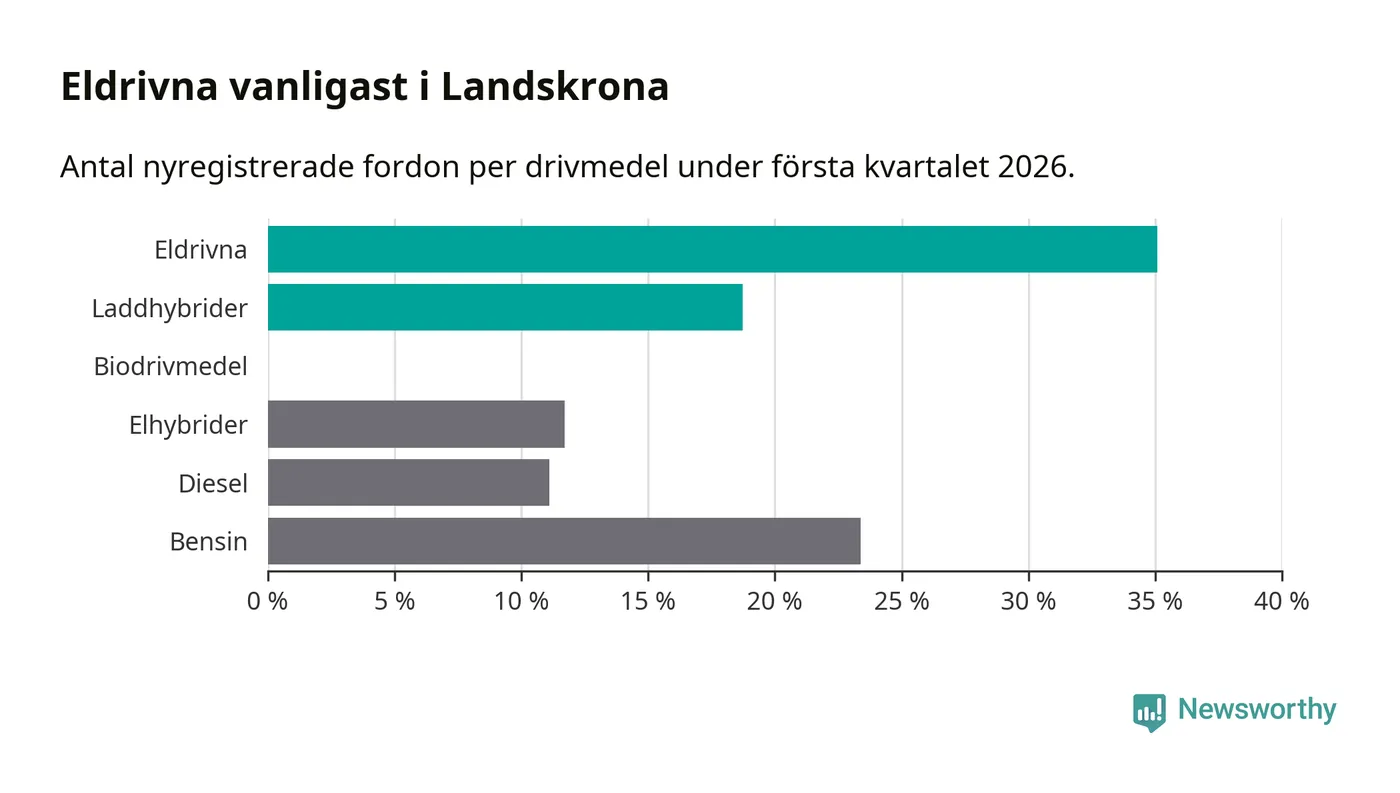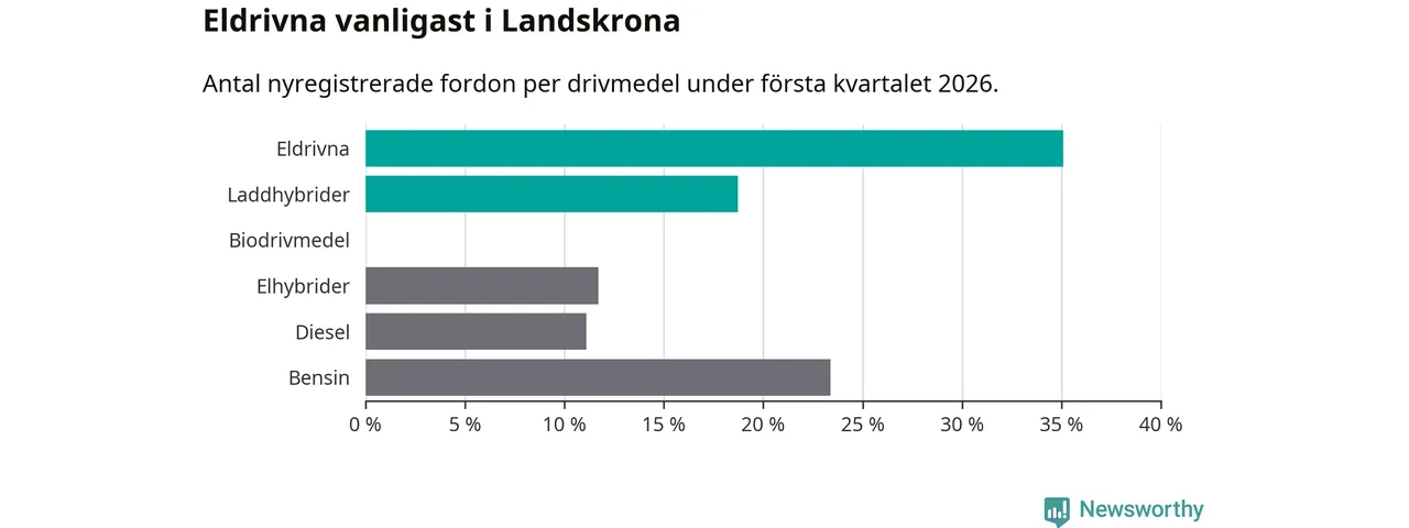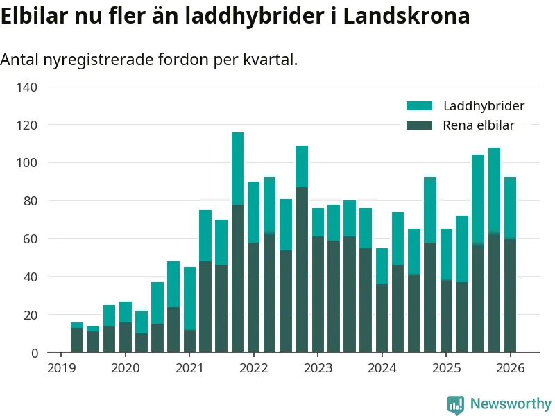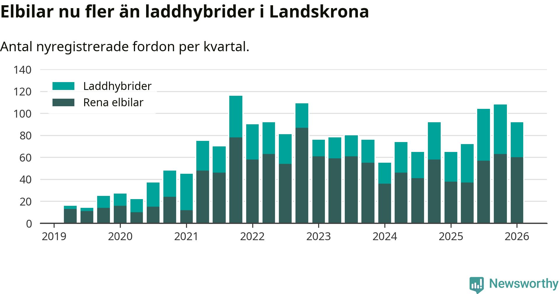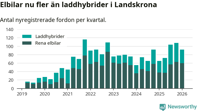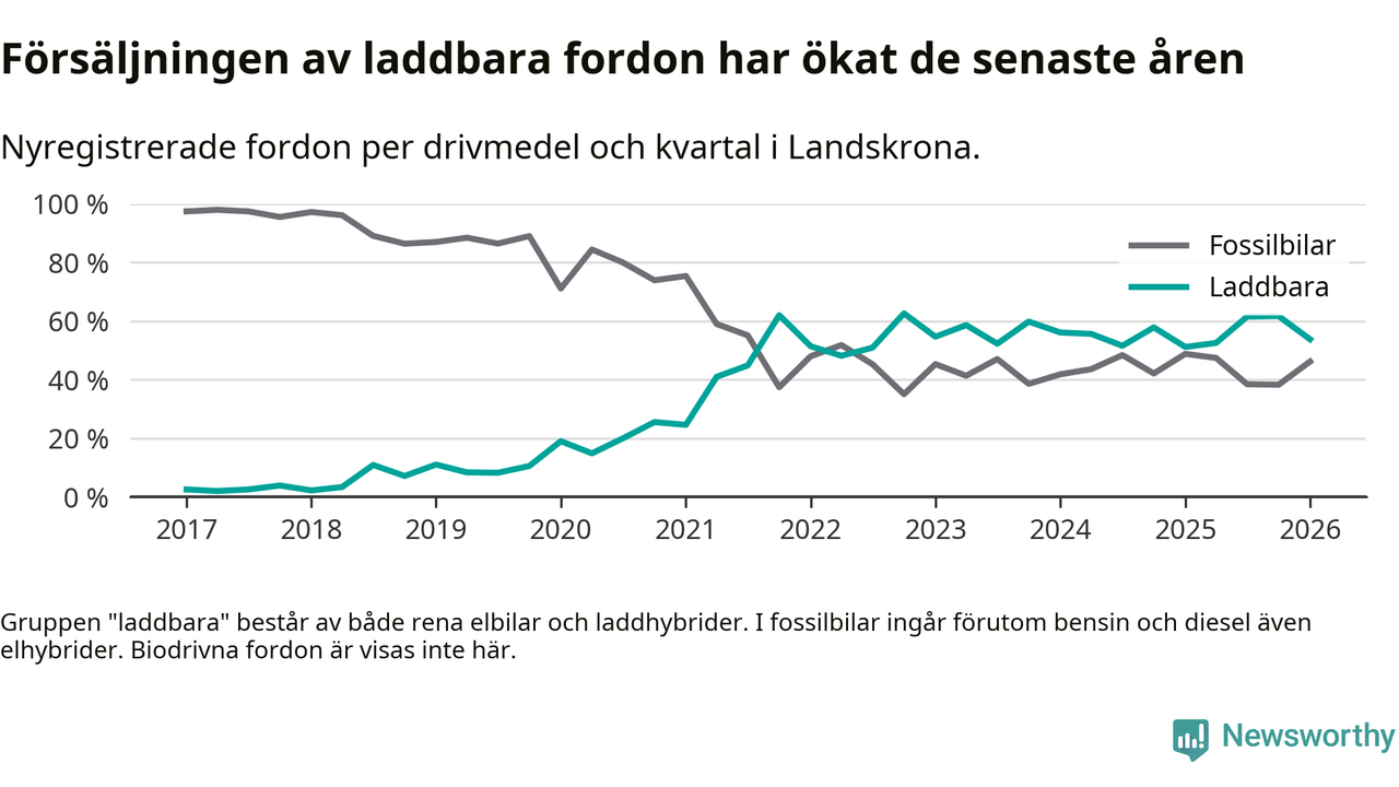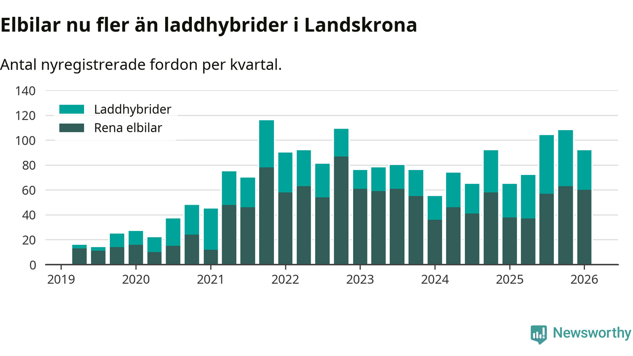 Under första kvartalet 2026 var 54 procent av alla nyregistrerade personbilar i Landskrona laddbara (sammanlagt registrerades 171 nya bilar). Merparten av de laddbara bilarna var rena elbilar (35 procent av alla).