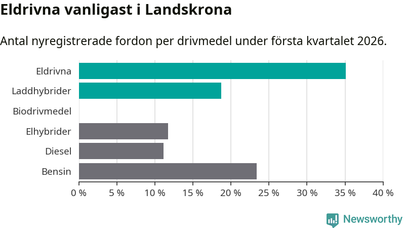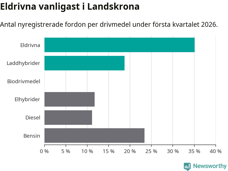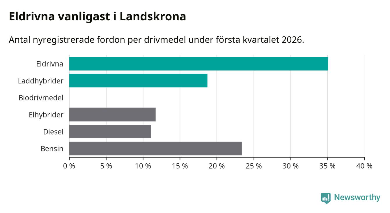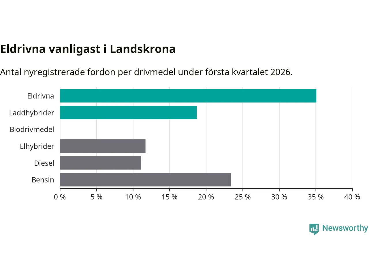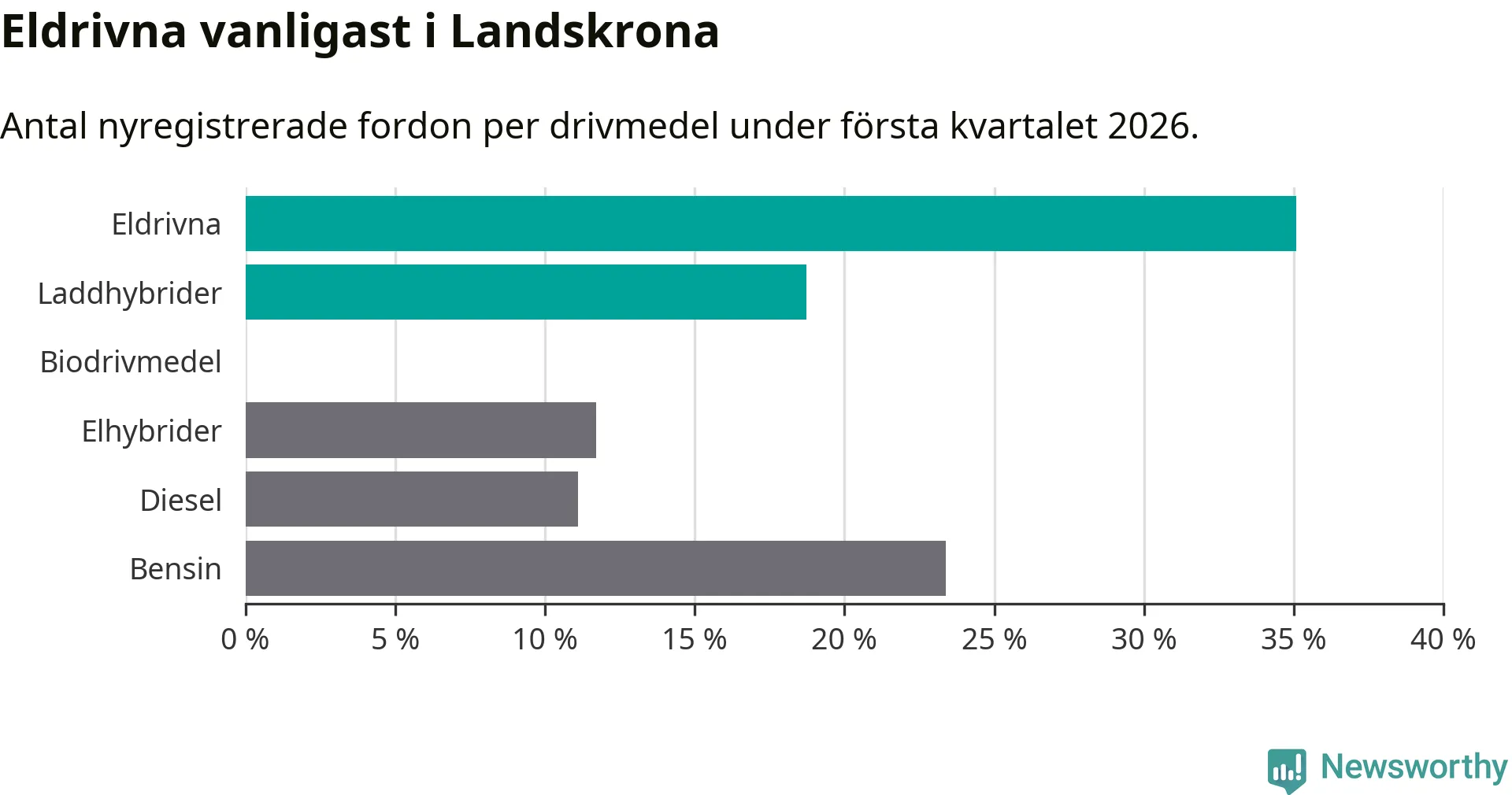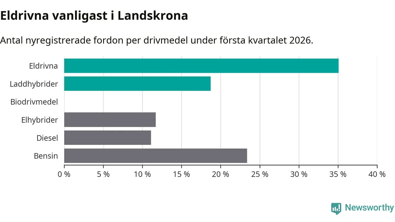 Under första kvartalet 2026 var 54 procent av alla nyregistrerade personbilar i Landskrona laddbara (sammanlagt registrerades 171 nya bilar). Merparten av de laddbara bilarna var rena elbilar (35 procent av alla).
