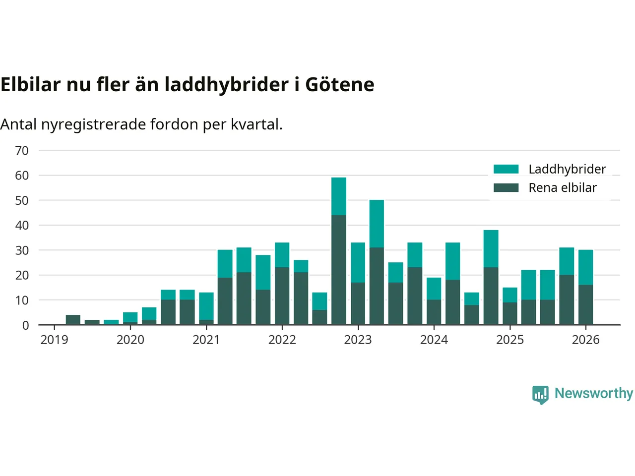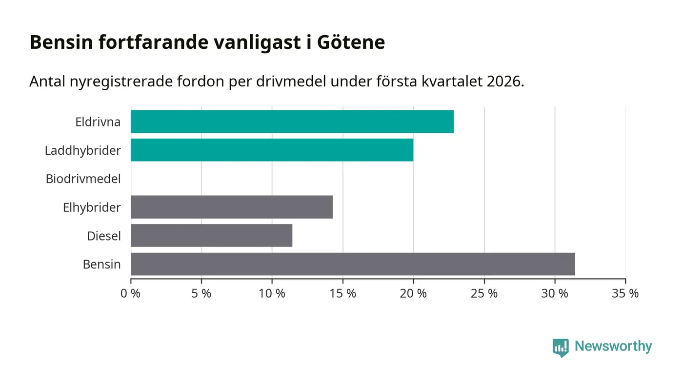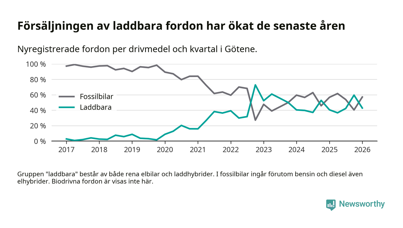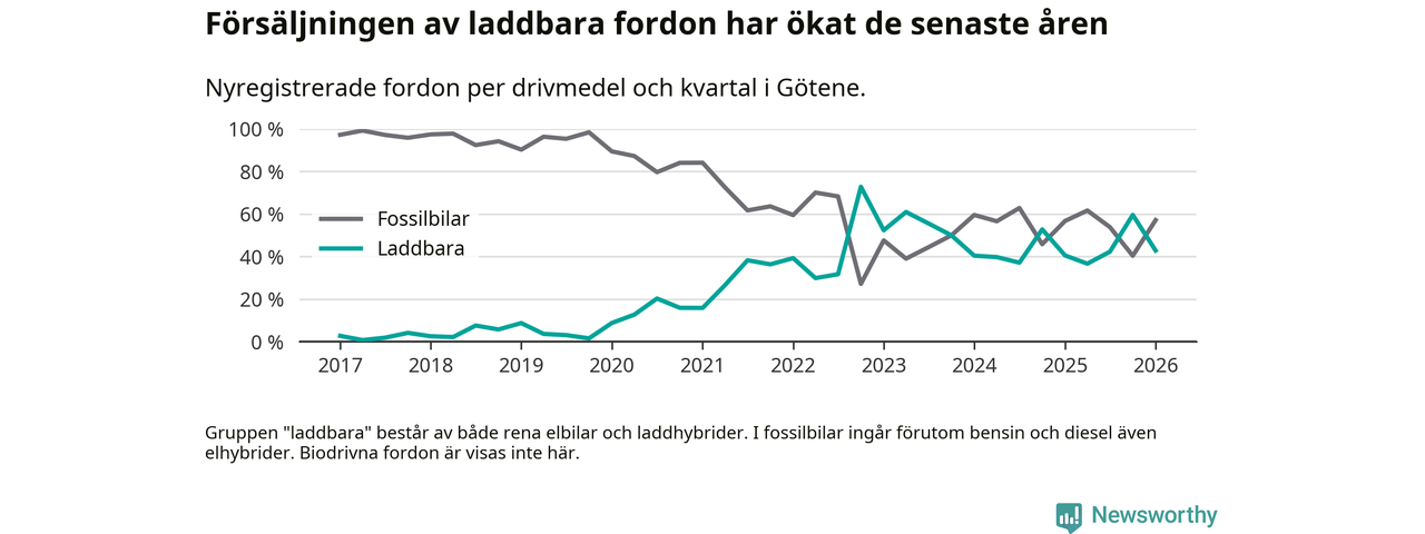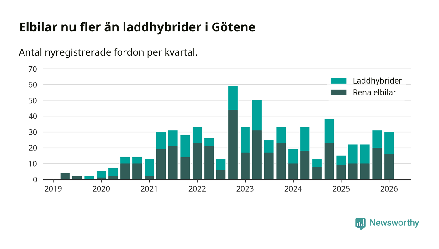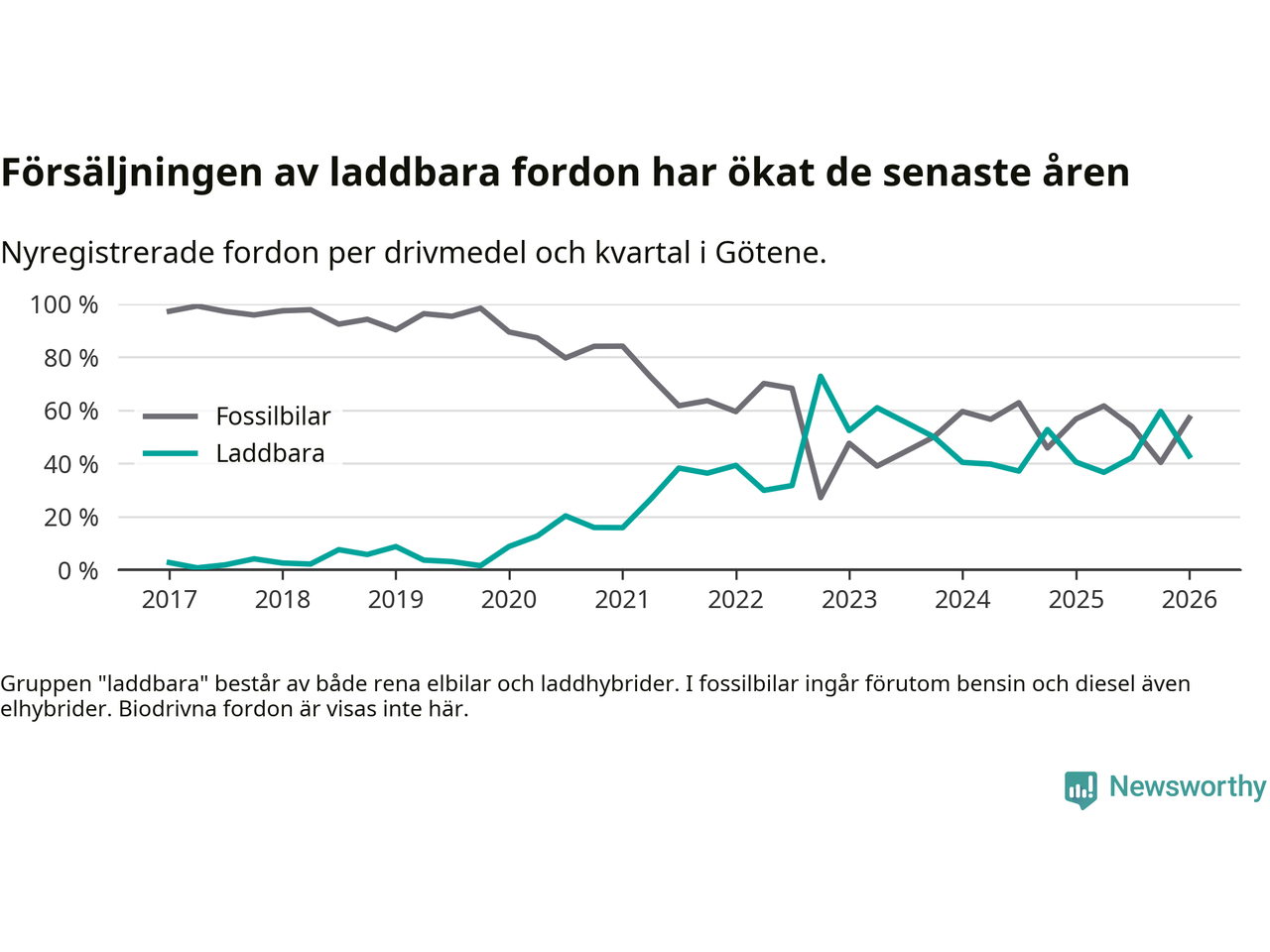Under första kvartalet 2026 var 43 procent av alla nyregistrerade personbilar i Götene laddbara (sammanlagt registrerades 70 nya bilar). Merparten av de laddbara bilarna var rena elbilar (23 procent av alla).