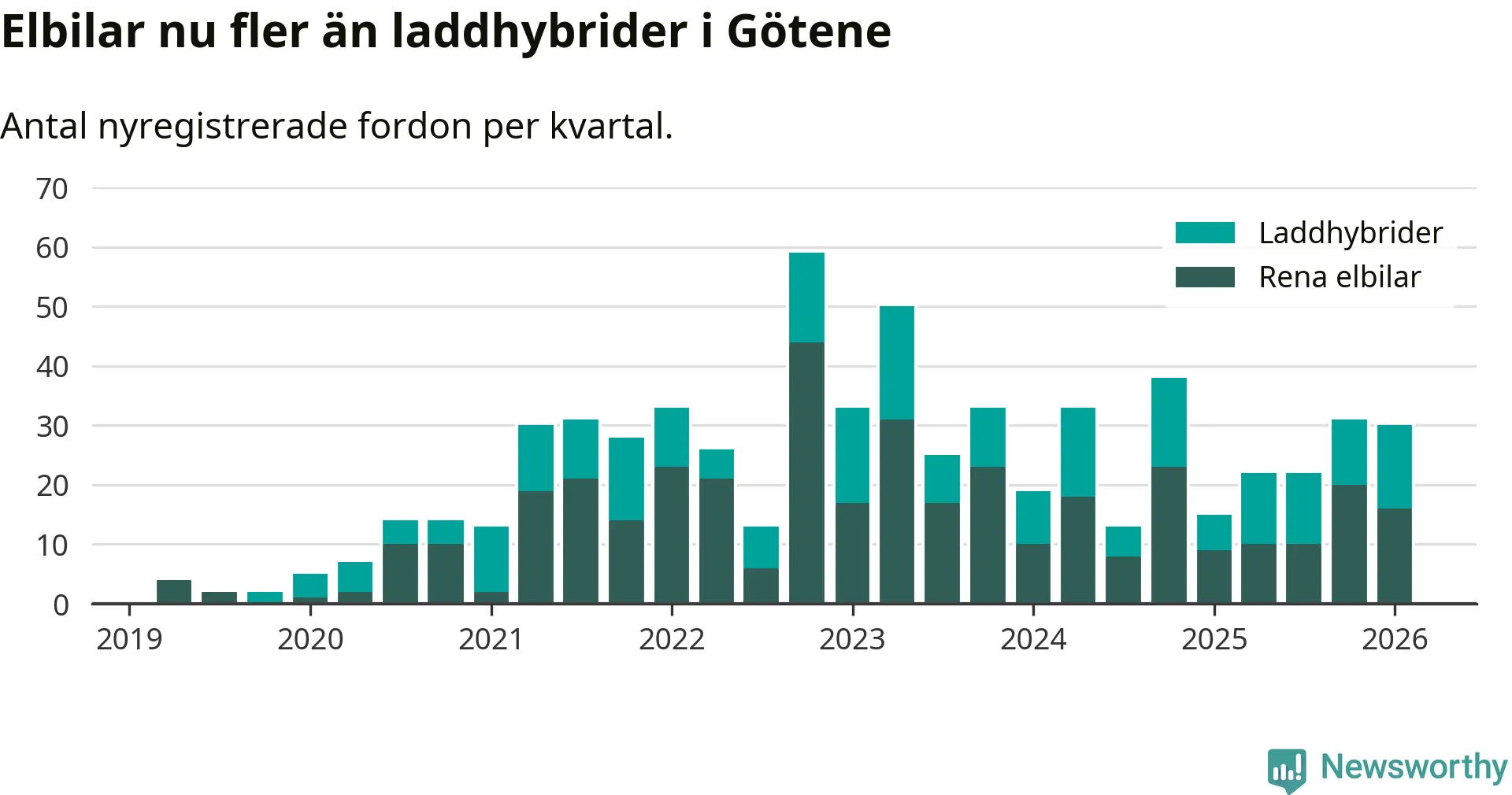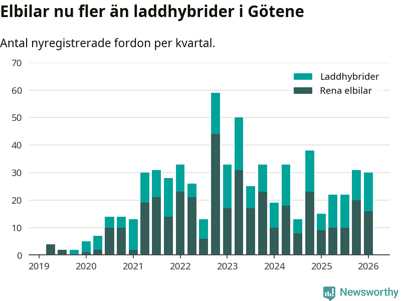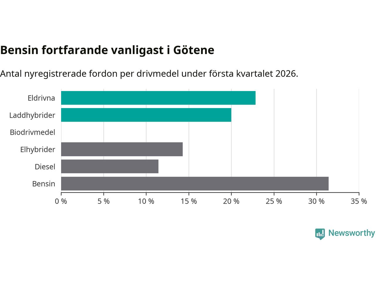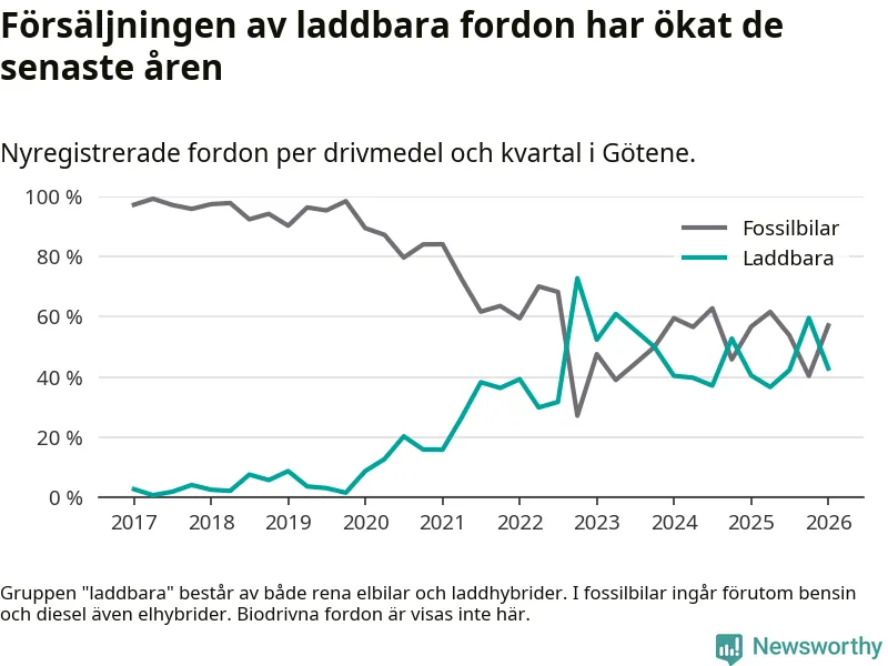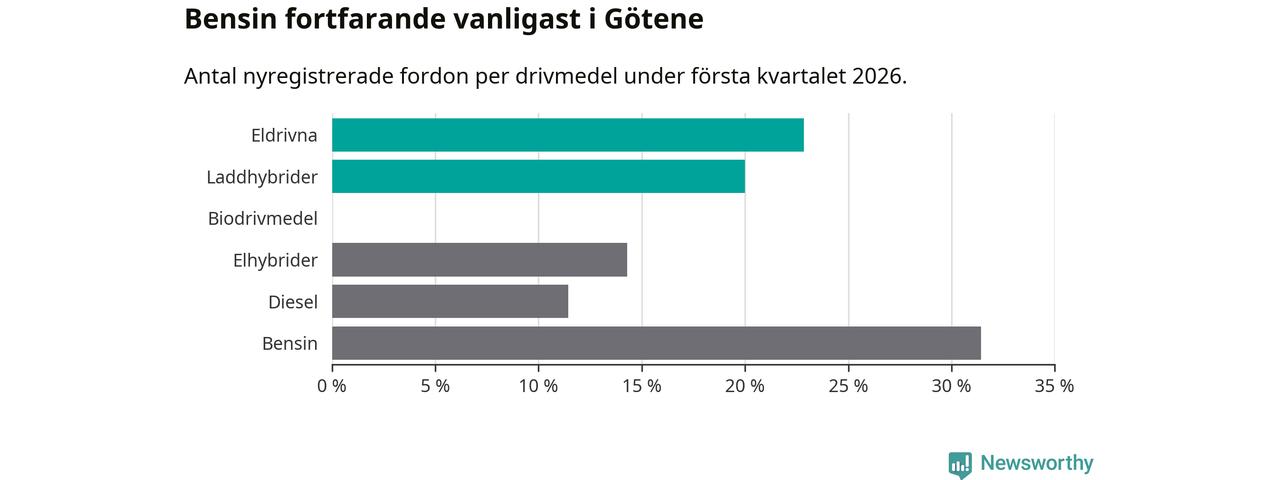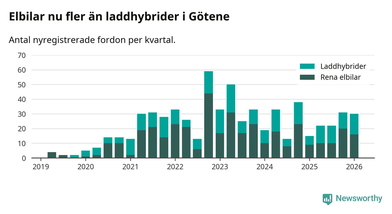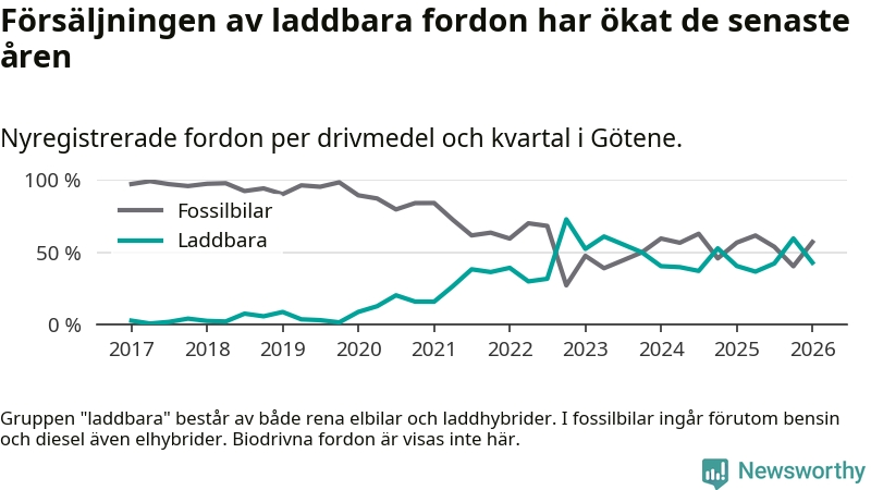 Under första kvartalet 2026 var 43 procent av alla nyregistrerade personbilar i Götene laddbara (sammanlagt registrerades 70 nya bilar). Merparten av de laddbara bilarna var rena elbilar (23 procent av alla).