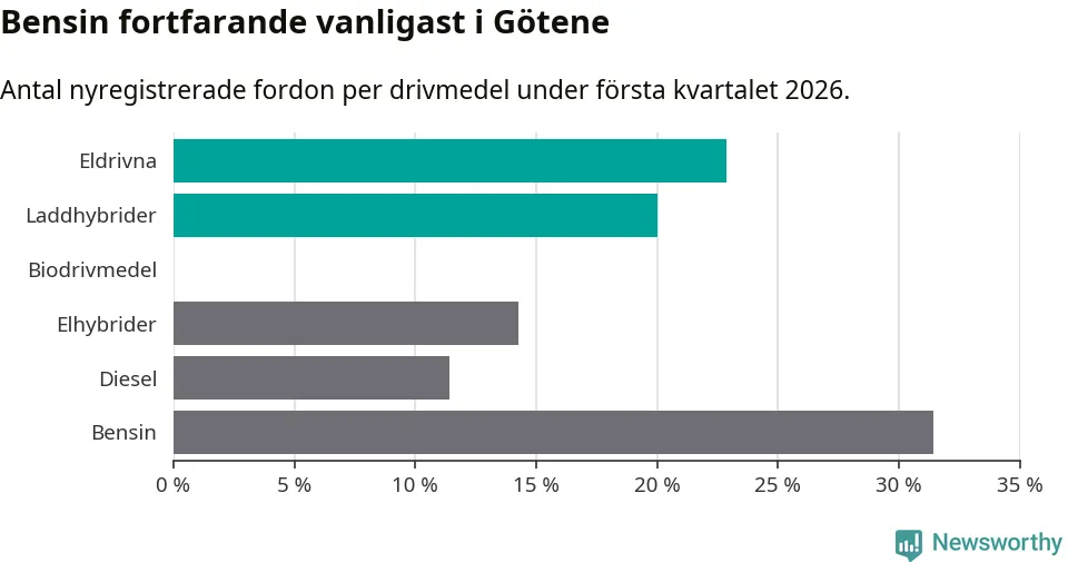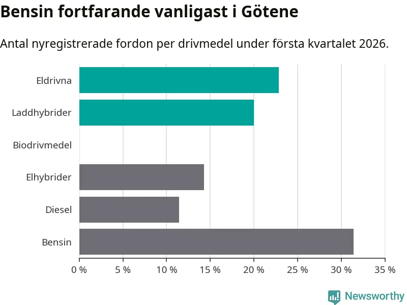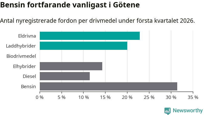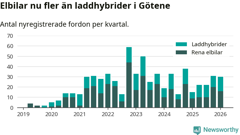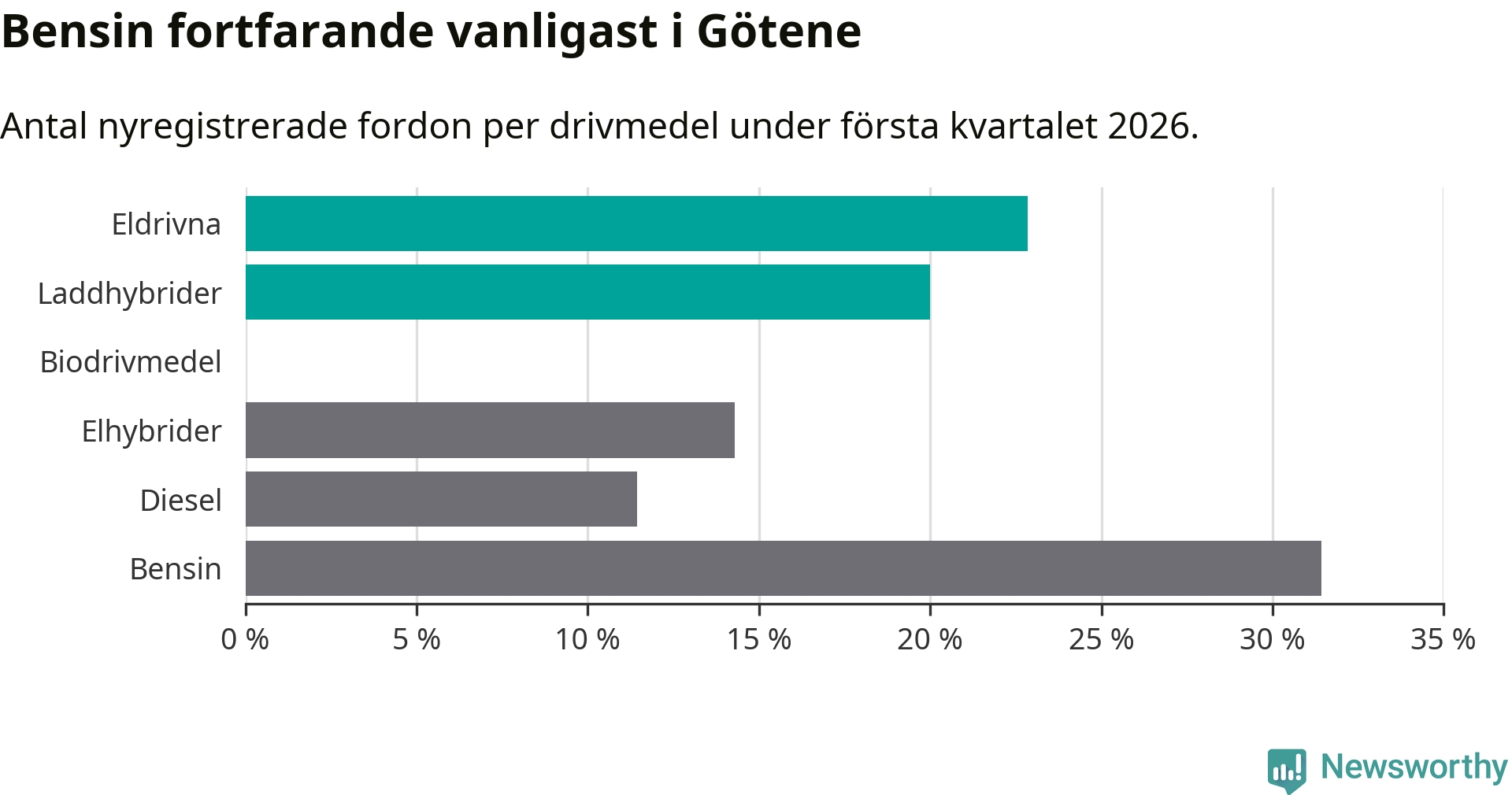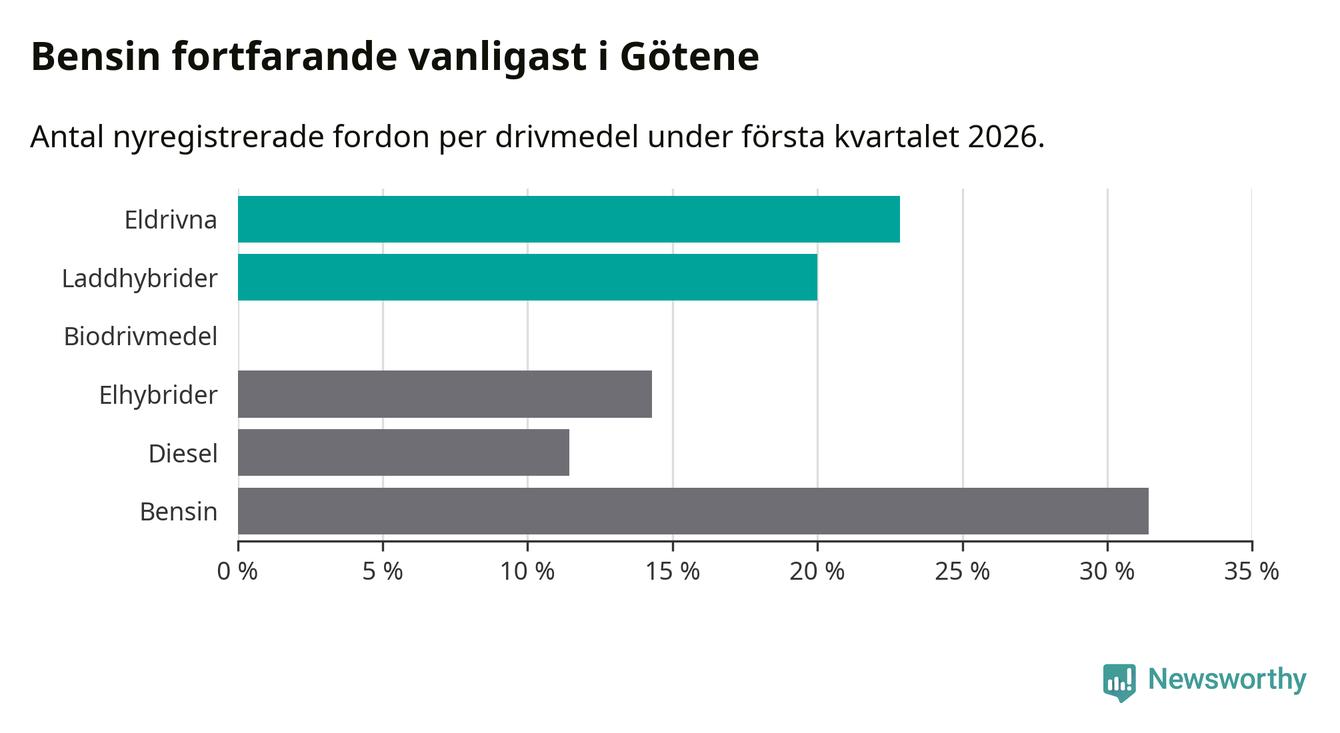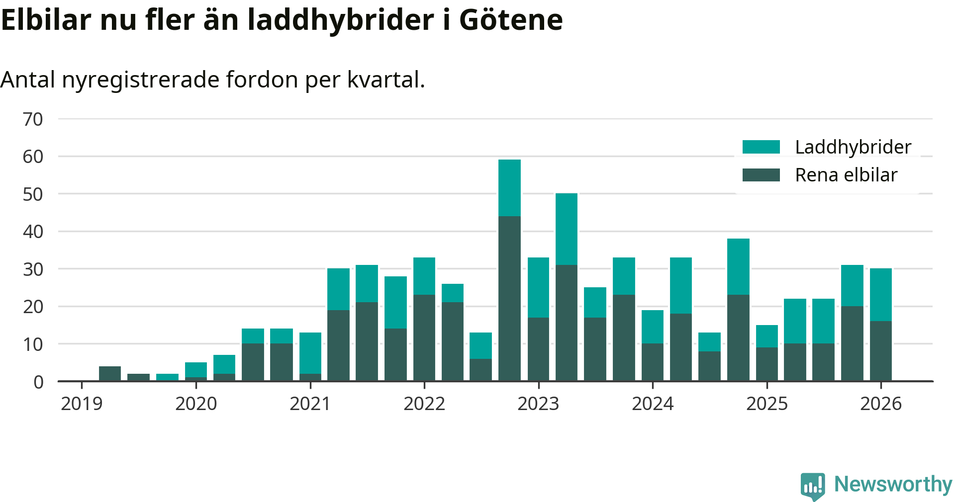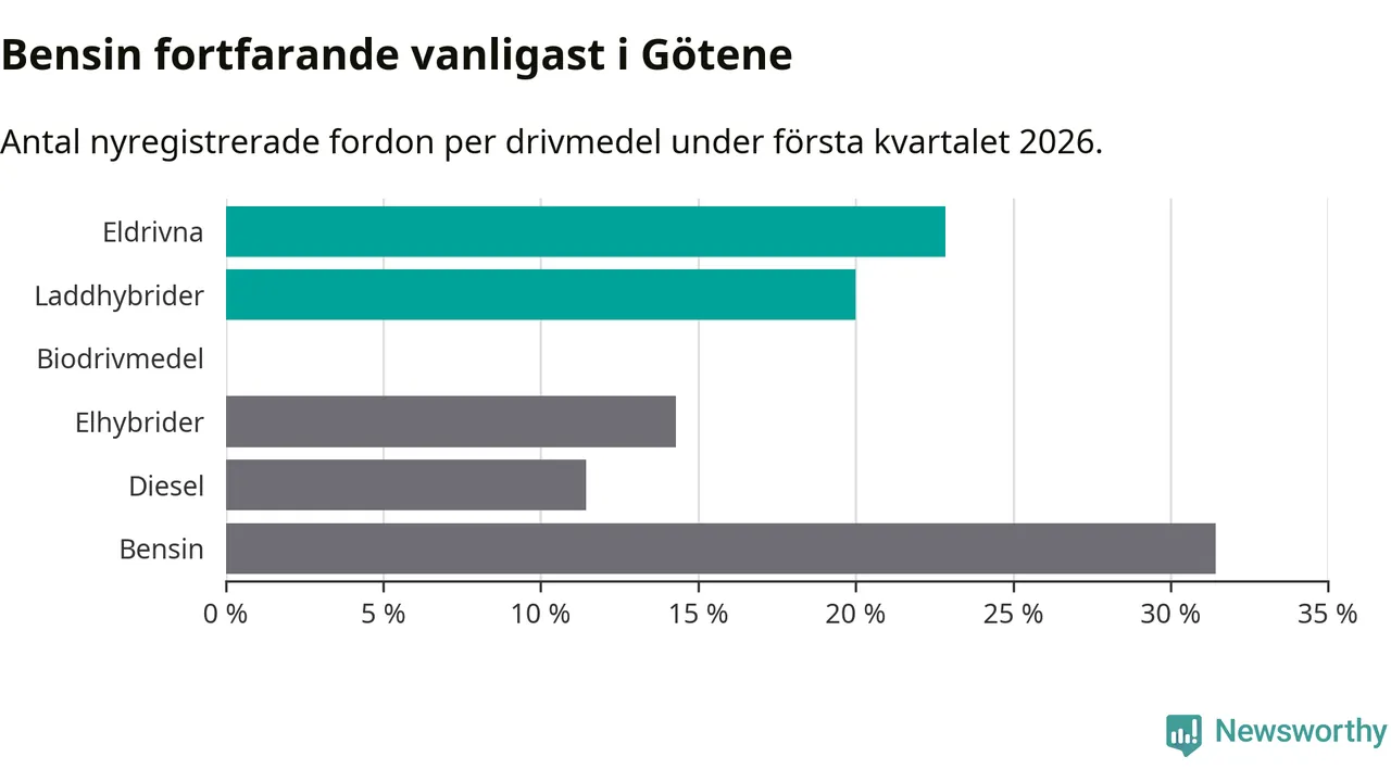 Under första kvartalet 2026 var 43 procent av alla nyregistrerade personbilar i Götene laddbara (sammanlagt registrerades 70 nya bilar). Merparten av de laddbara bilarna var rena elbilar (23 procent av alla).