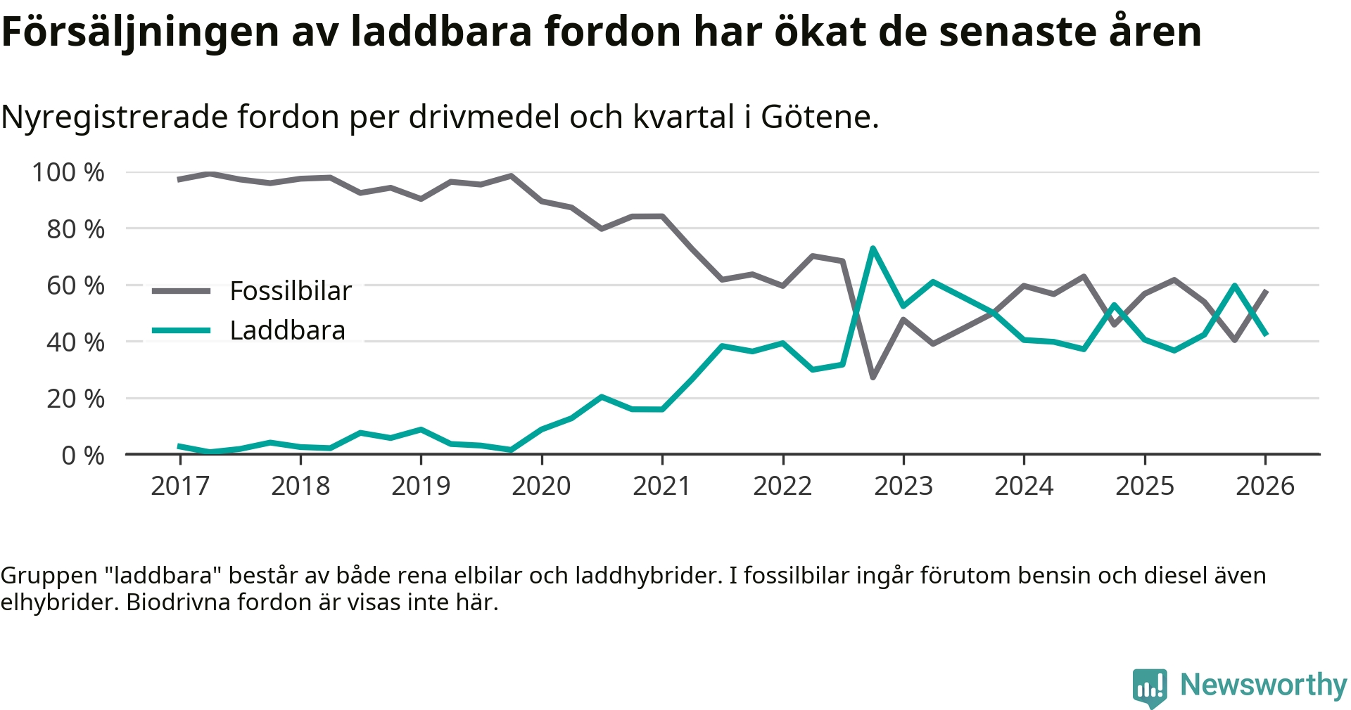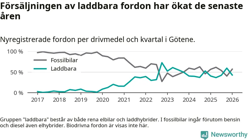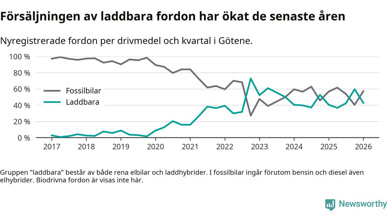I Götene minskade andelen laddbara bilar under första kvartalet jämfört med kvartalet innan (−16,8 procentenheter). Nyregistreringen peakade under fjärde kvartalet 2022 då 73 procent av de nya bilarna var laddbara.