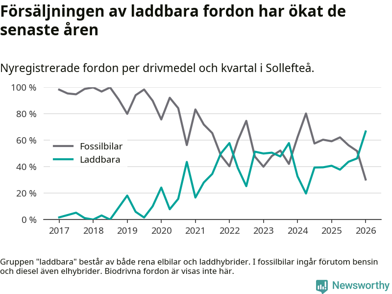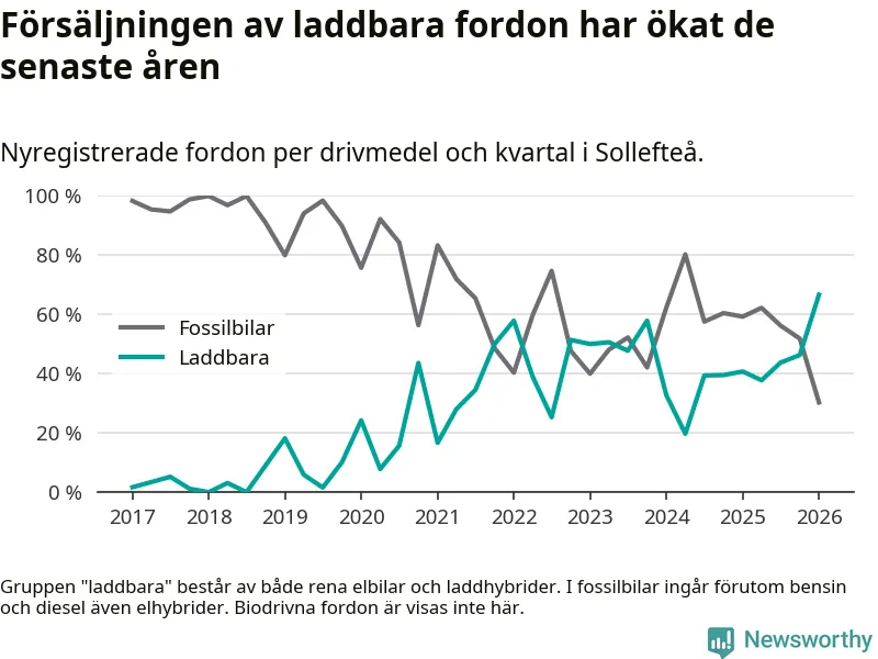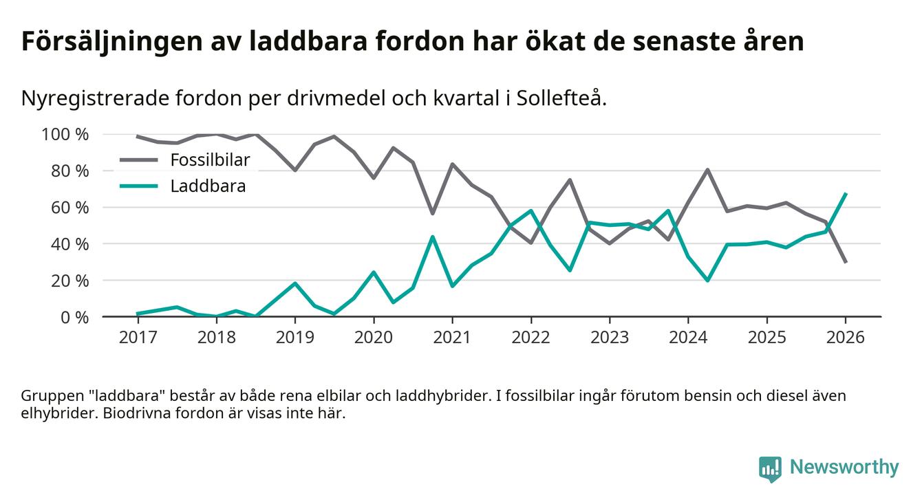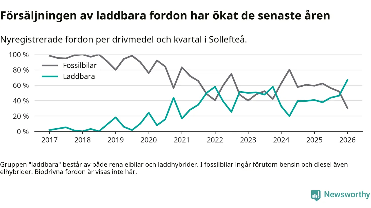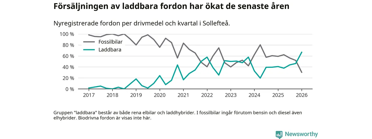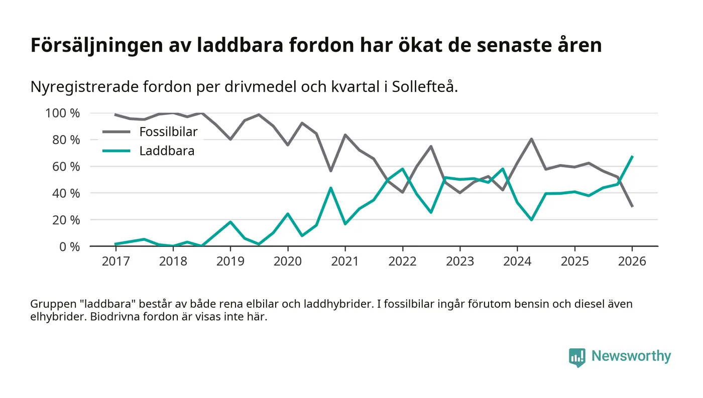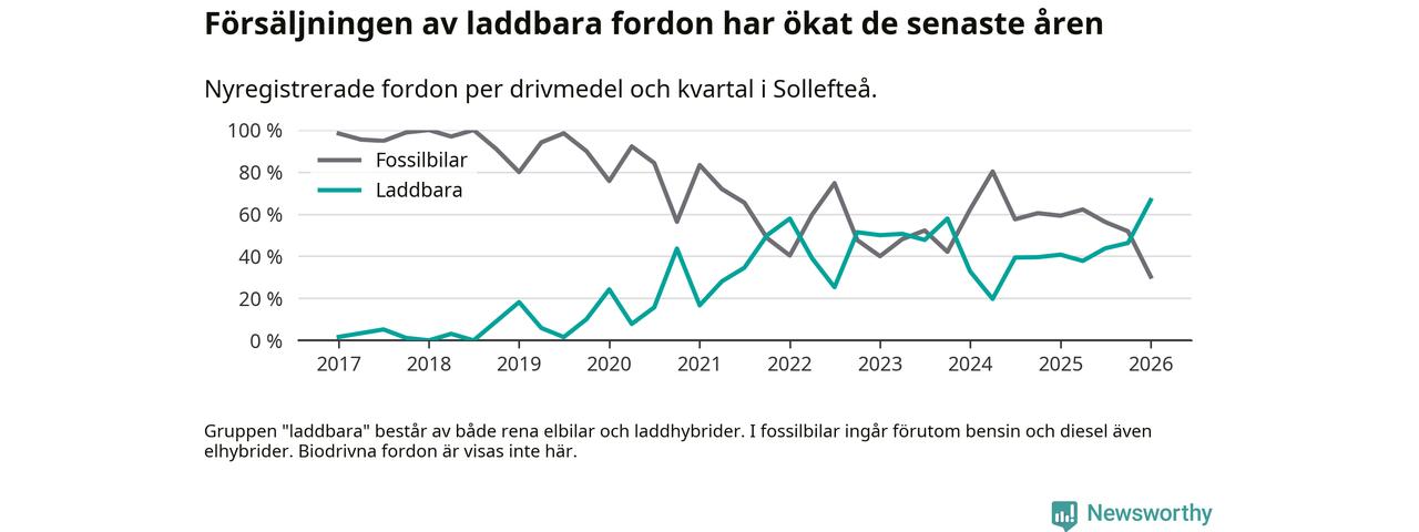 Under första kvartalet 2026 var 67 procent av alla nyregistrerade personbilar i Sollefteå laddbara (sammanlagt registrerades 33 nya bilar). Merparten av de laddbara bilarna var rena elbilar (42 procent av alla).