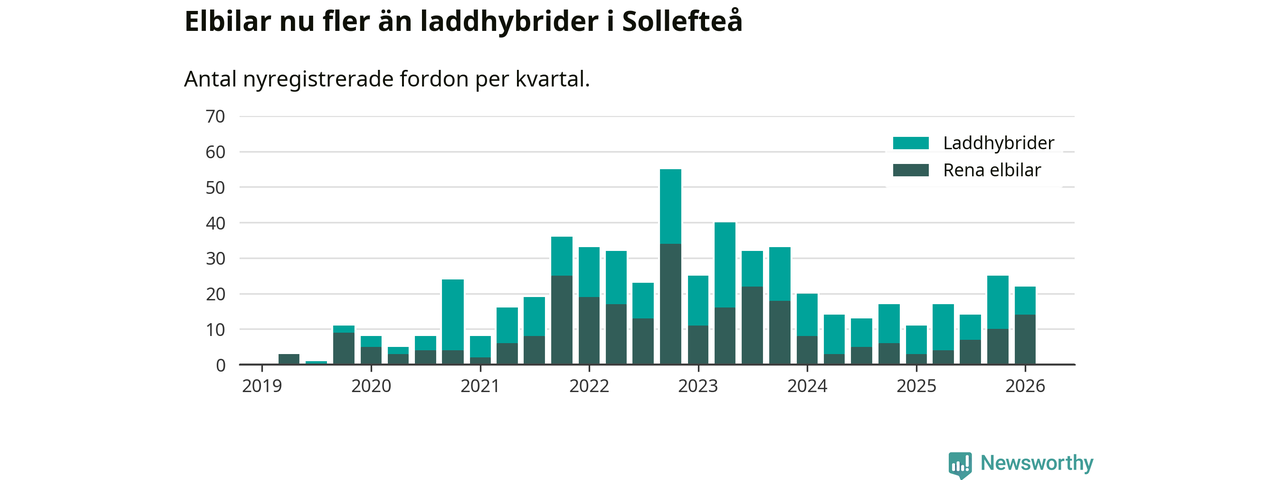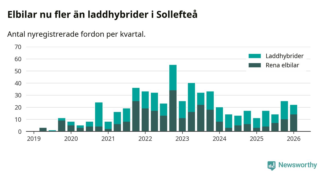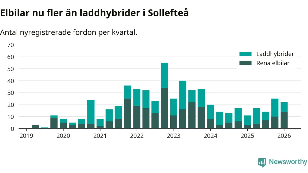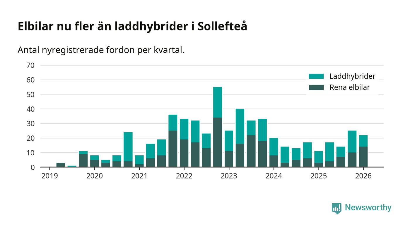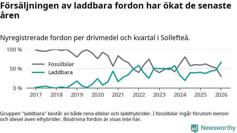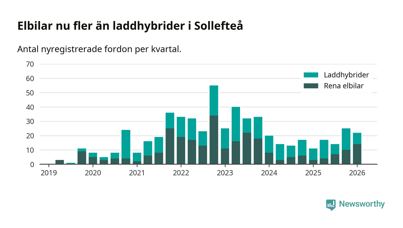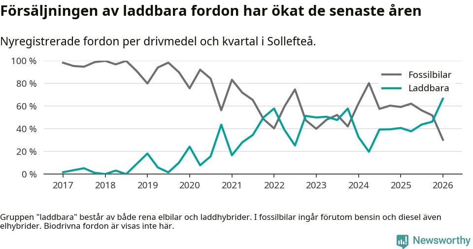 Under första kvartalet 2026 var 67 procent av alla nyregistrerade personbilar i Sollefteå laddbara (sammanlagt registrerades 33 nya bilar). Merparten av de laddbara bilarna var rena elbilar (42 procent av alla).
