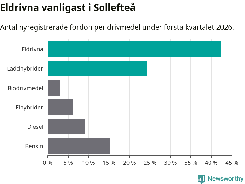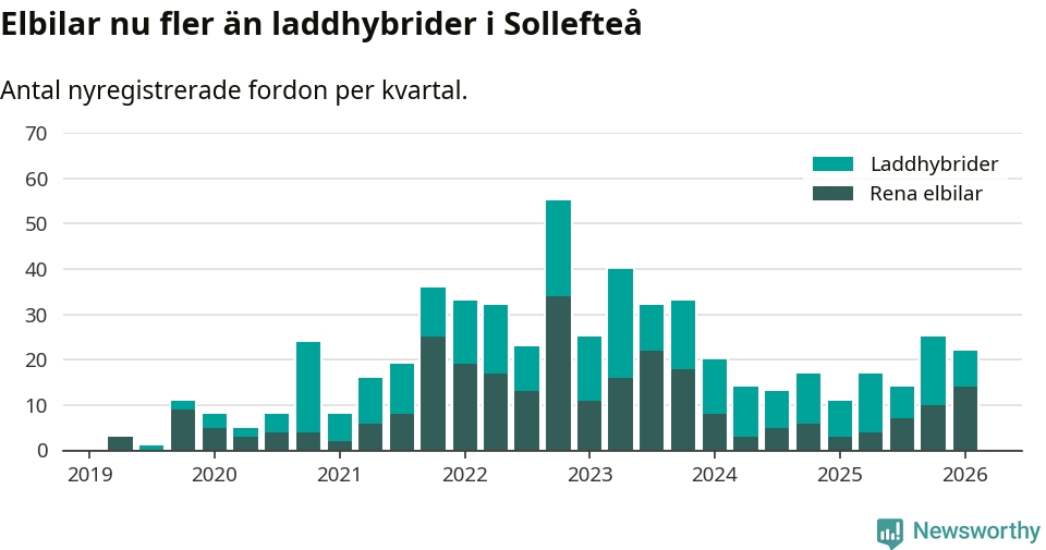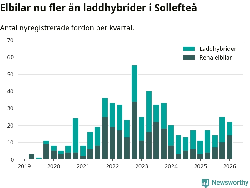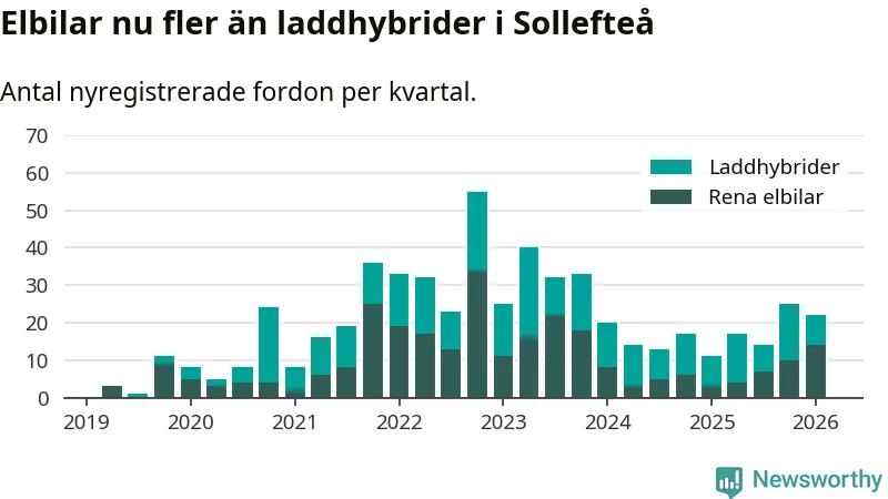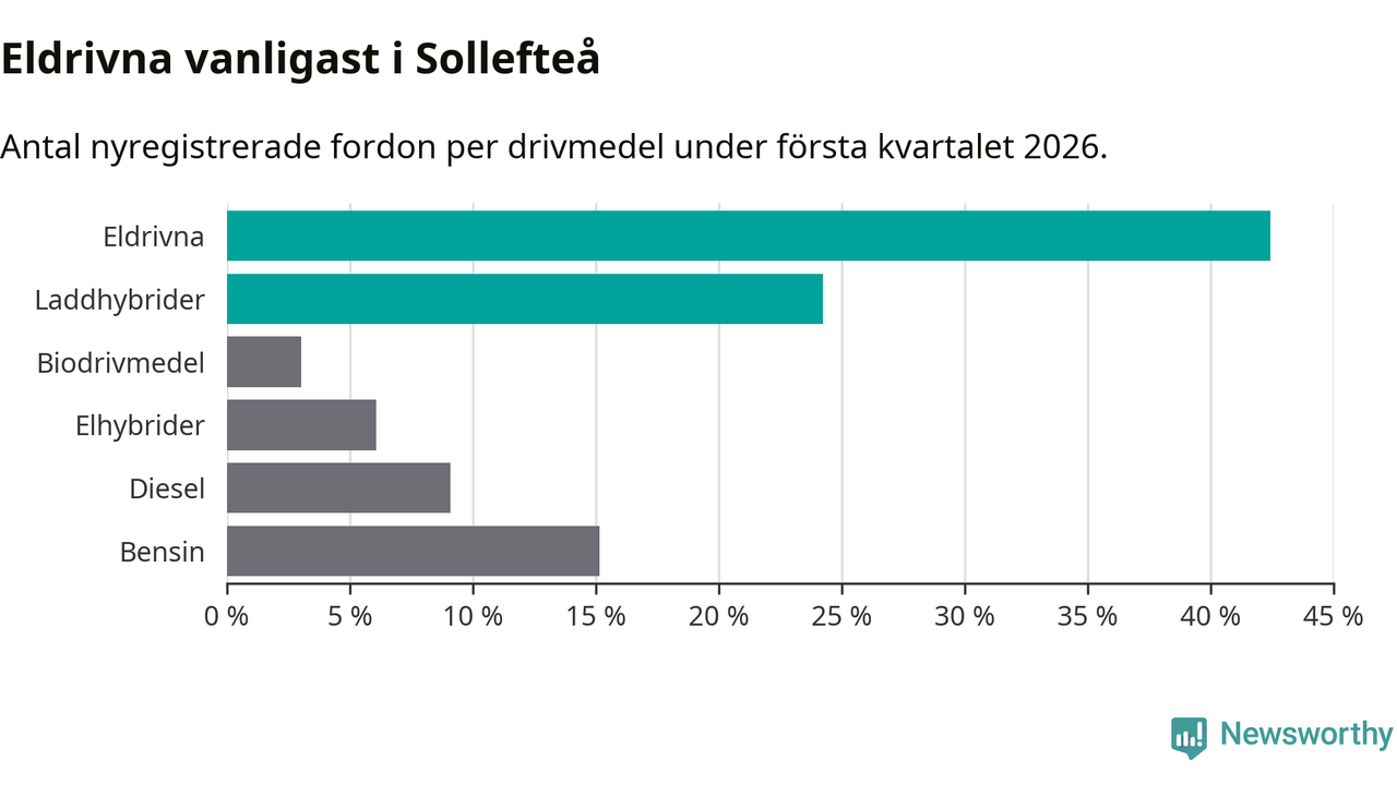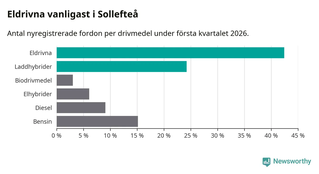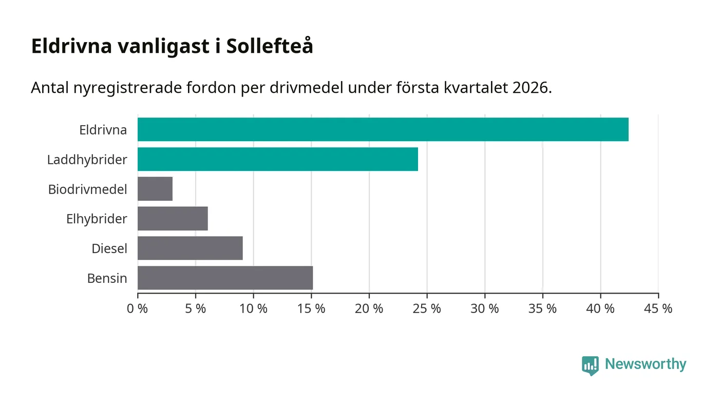 Under första kvartalet 2026 var 67 procent av alla nyregistrerade personbilar i Sollefteå laddbara (sammanlagt registrerades 33 nya bilar). Merparten av de laddbara bilarna var rena elbilar (42 procent av alla).
