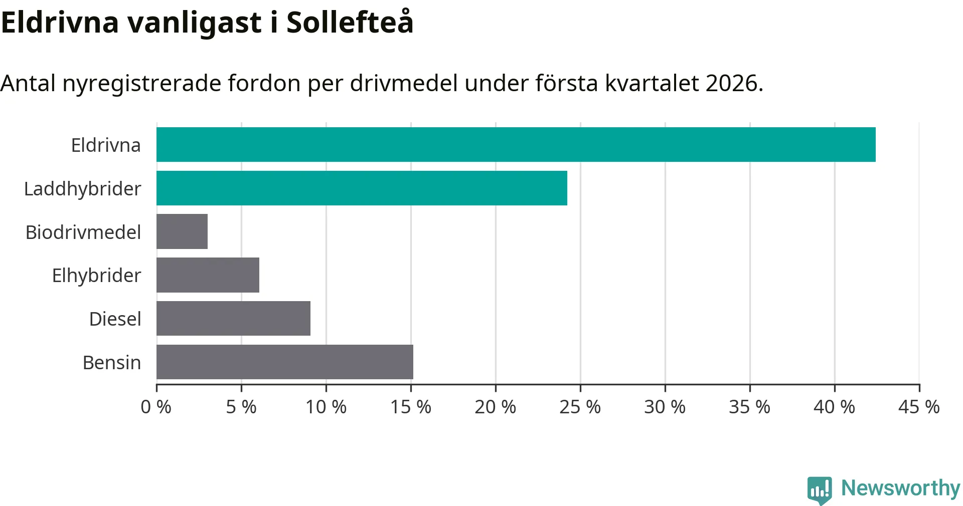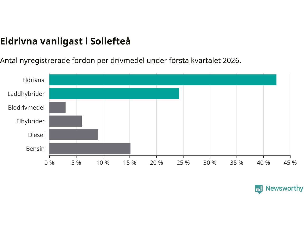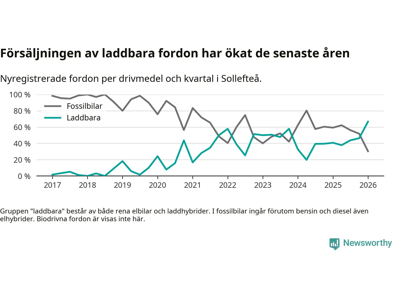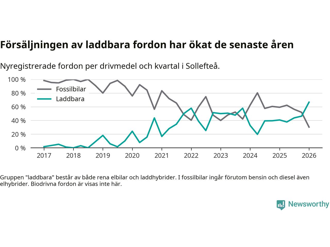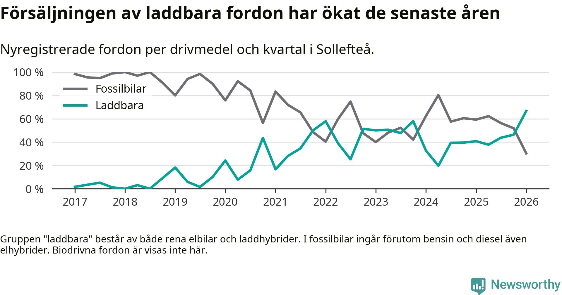 Under första kvartalet 2026 var 67 procent av alla nyregistrerade personbilar i Sollefteå laddbara (sammanlagt registrerades 33 nya bilar). Merparten av de laddbara bilarna var rena elbilar (42 procent av alla).