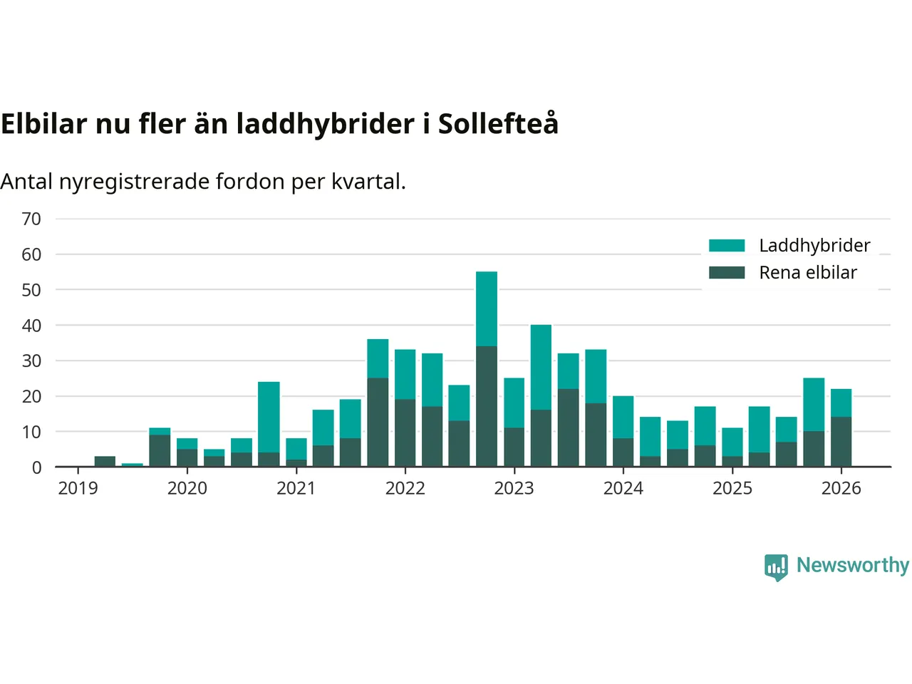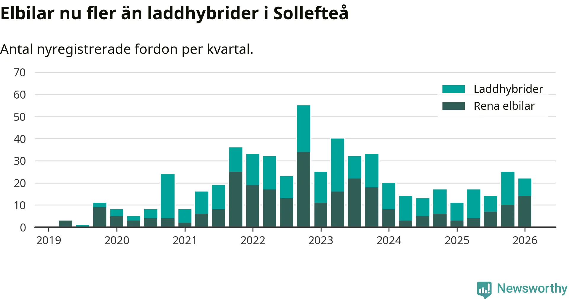 I Sollefteå noterades ett nytt rekord under första kvartalet. Aldrig tidigare har laddbara bilar utgjort en så stor del av alla nya bilar.
