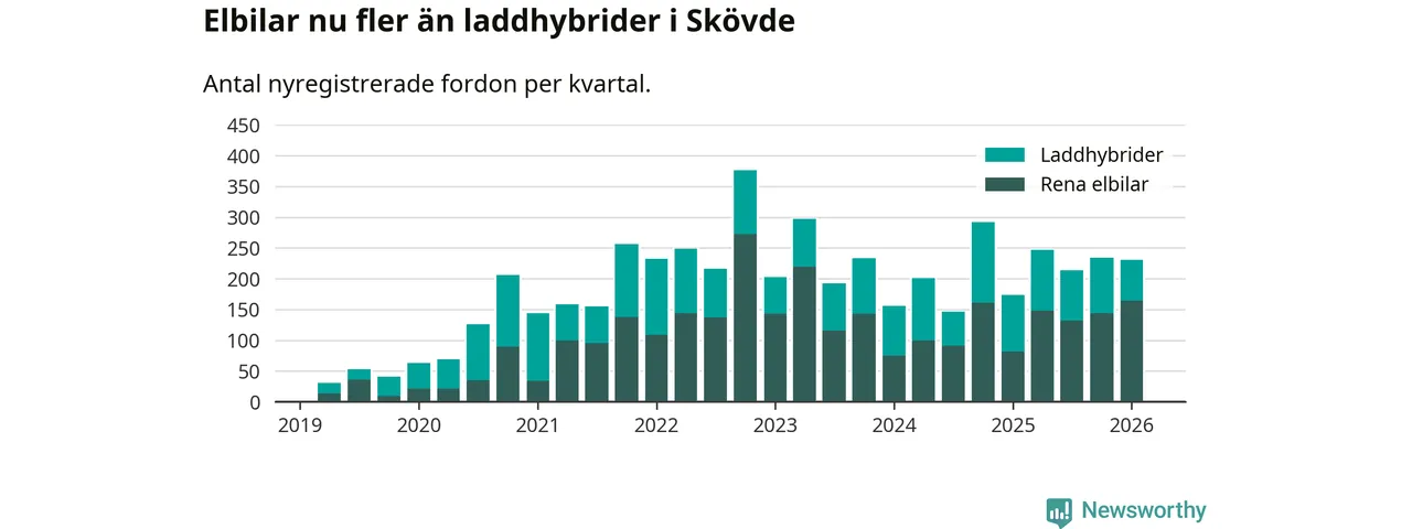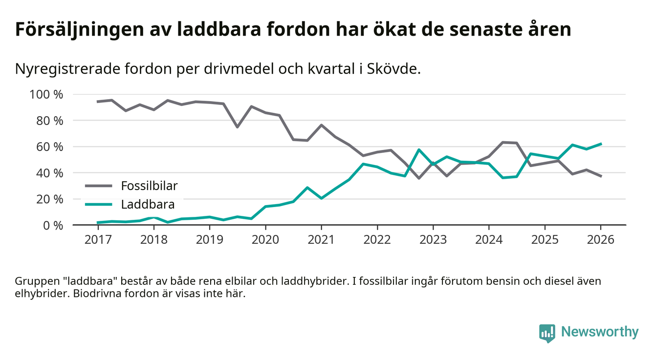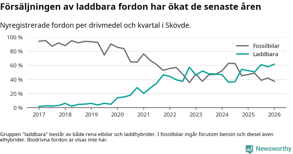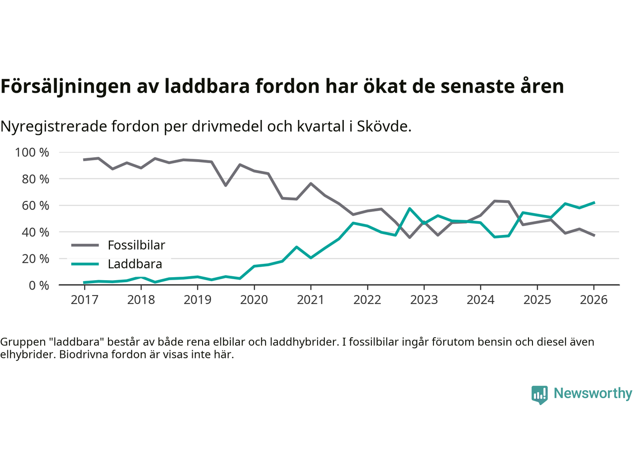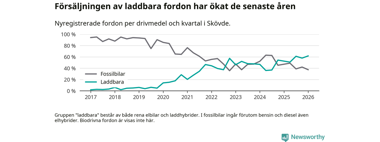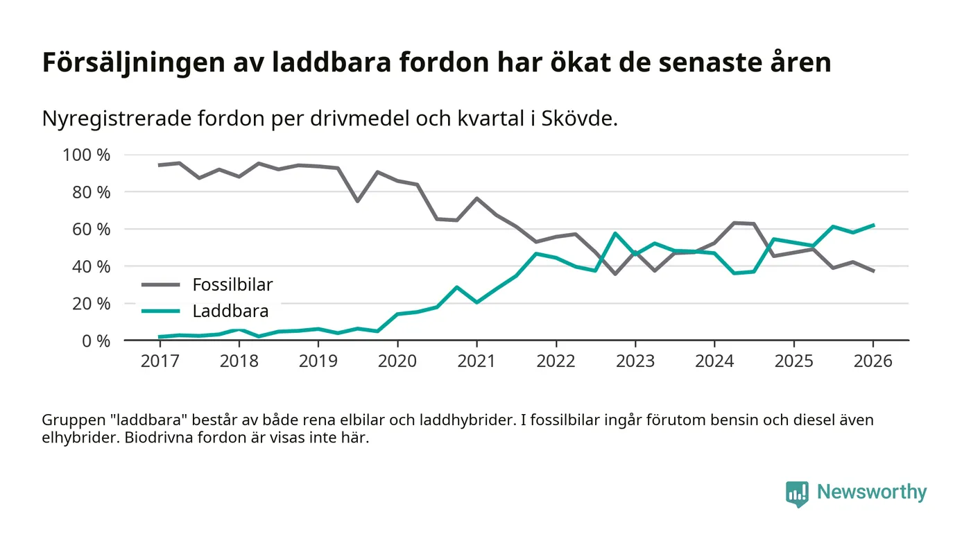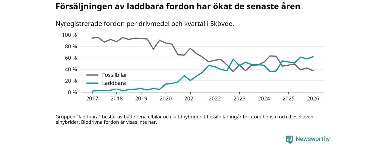 Under första kvartalet 2026 var 62 procent av alla nyregistrerade personbilar i Skövde laddbara (sammanlagt registrerades 374 nya bilar). Merparten av de laddbara bilarna var rena elbilar (44 procent av alla).