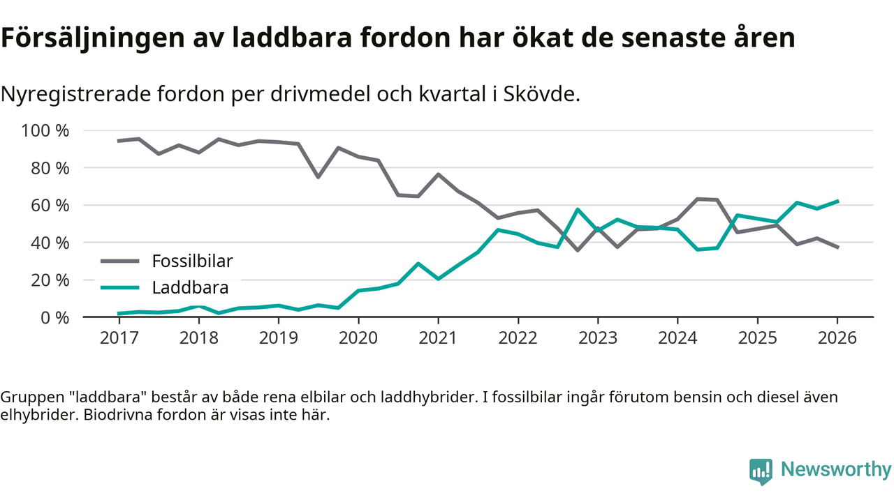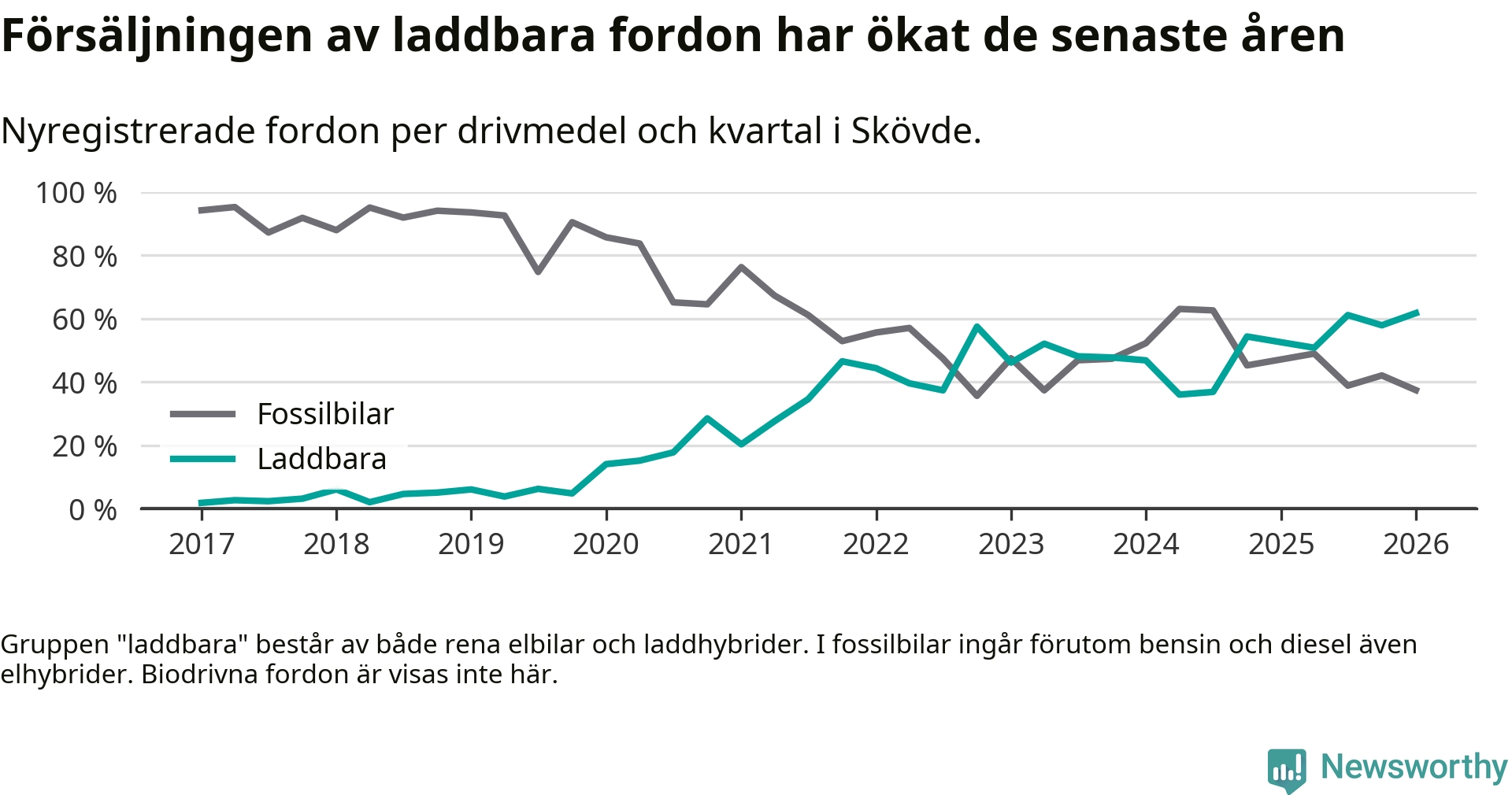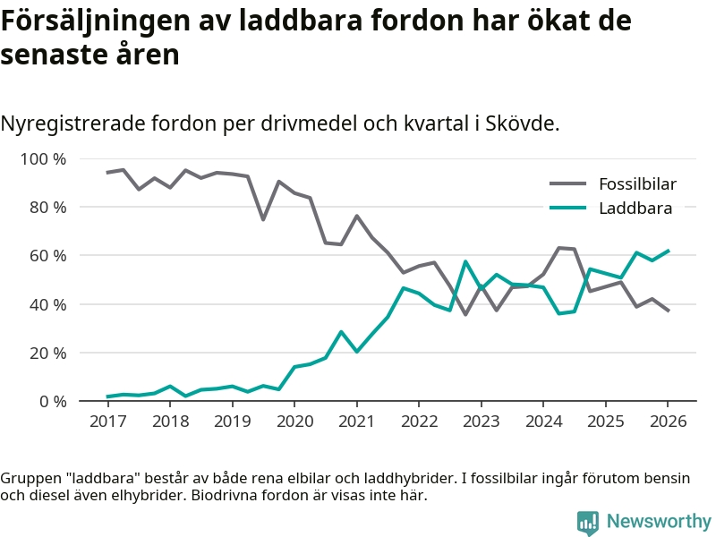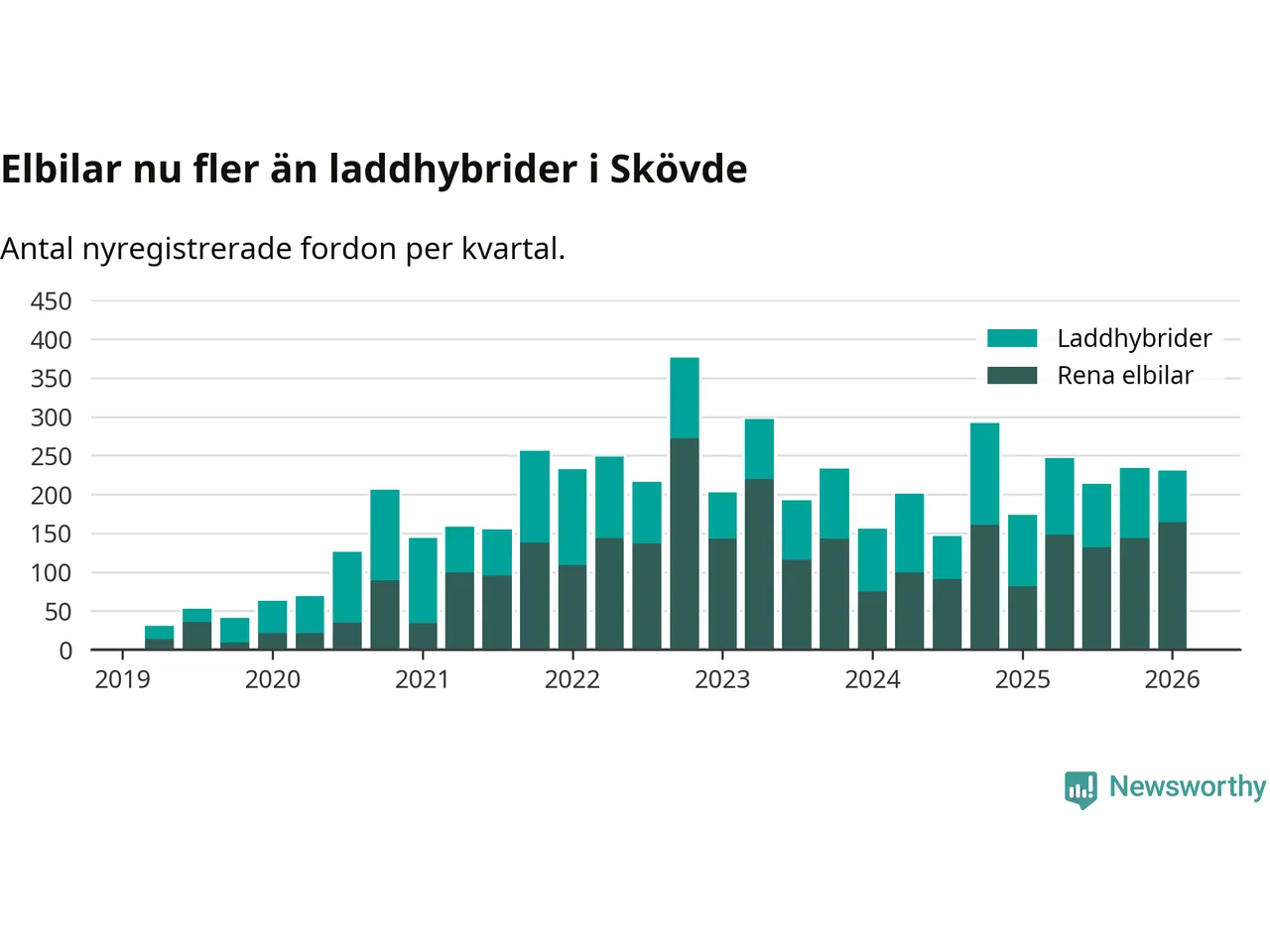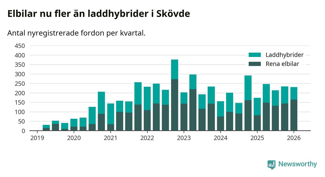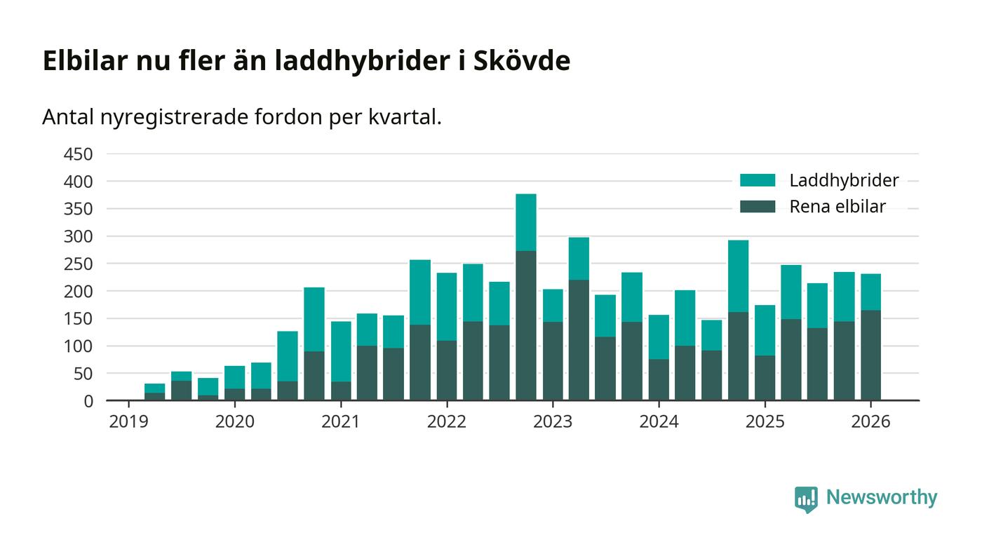 Under första kvartalet 2026 var 62 procent av alla nyregistrerade personbilar i Skövde laddbara (sammanlagt registrerades 374 nya bilar). Merparten av de laddbara bilarna var rena elbilar (44 procent av alla).