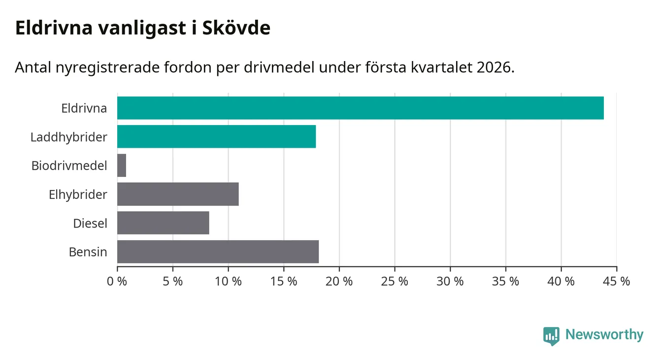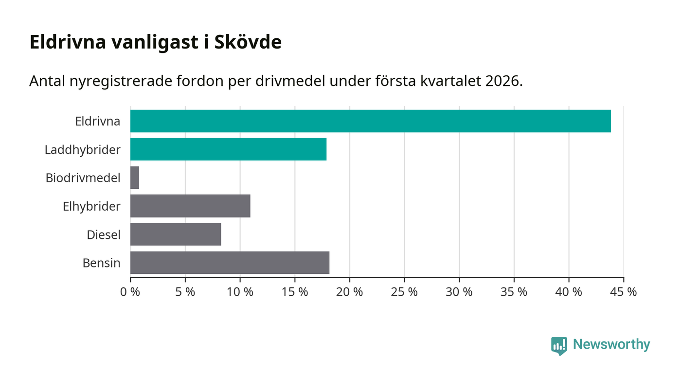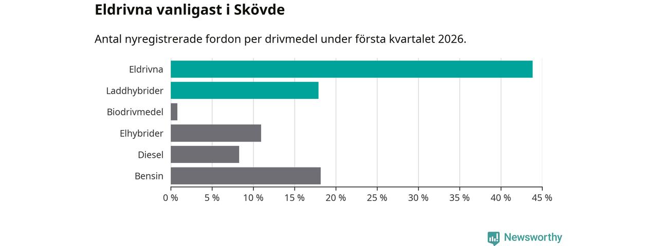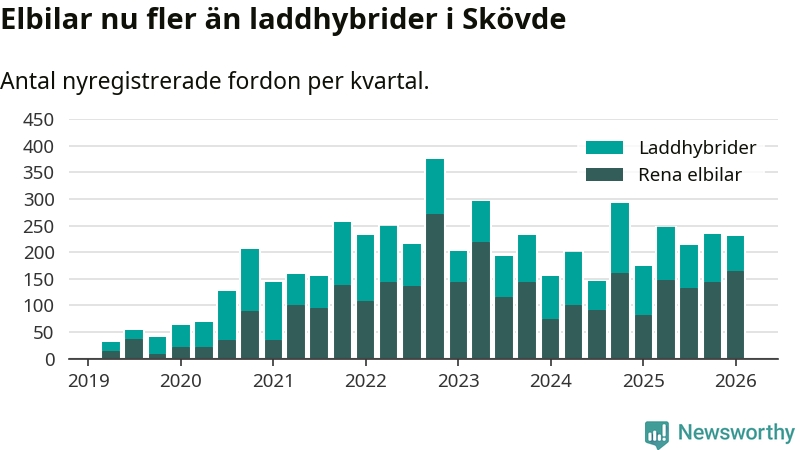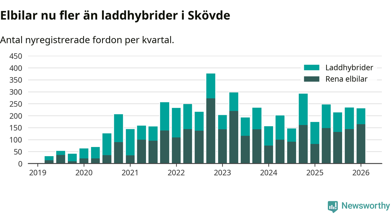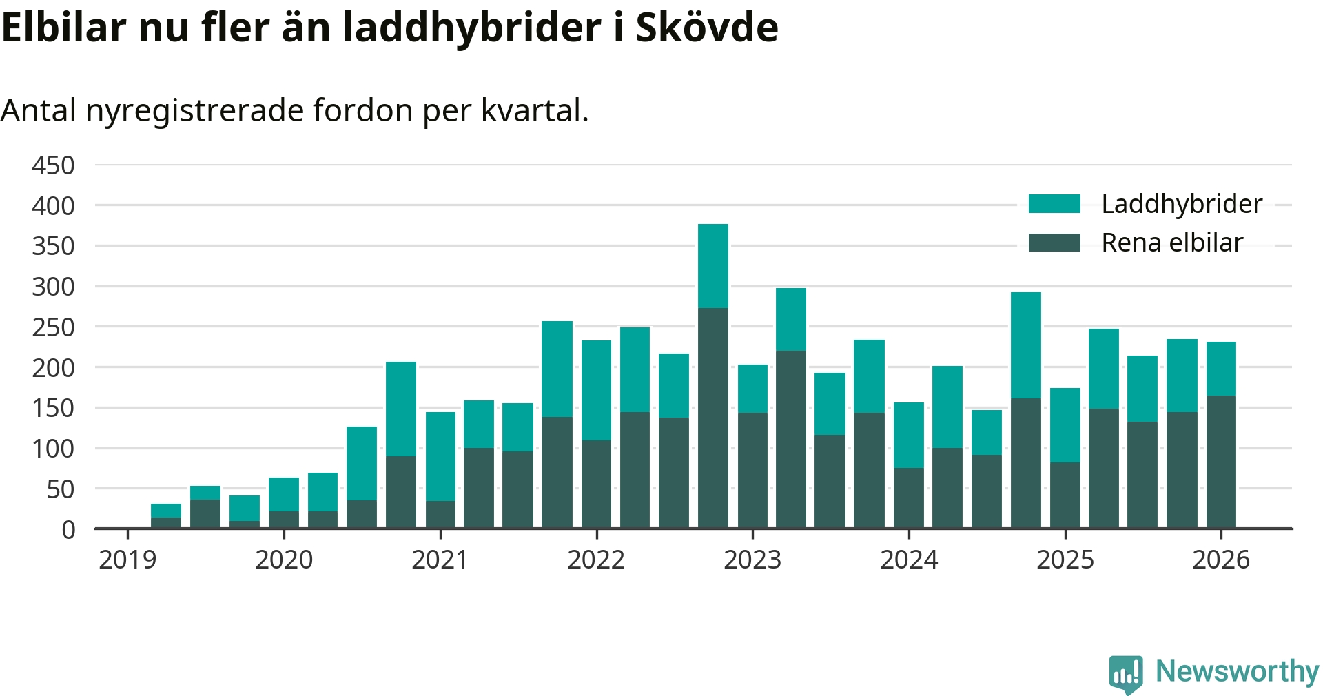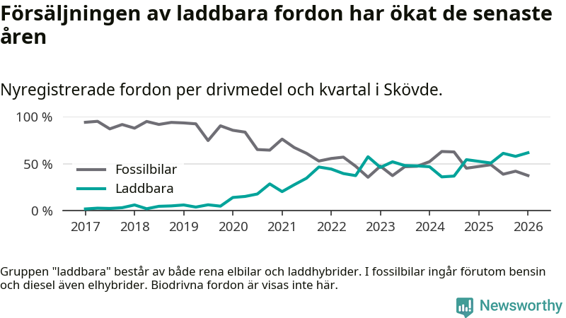 Under första kvartalet 2026 var 62 procent av alla nyregistrerade personbilar i Skövde laddbara (sammanlagt registrerades 374 nya bilar). Merparten av de laddbara bilarna var rena elbilar (44 procent av alla).