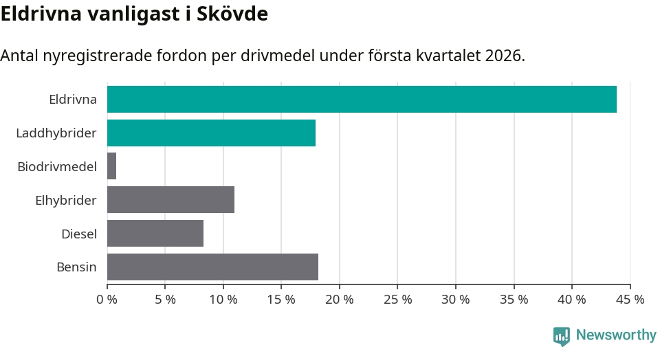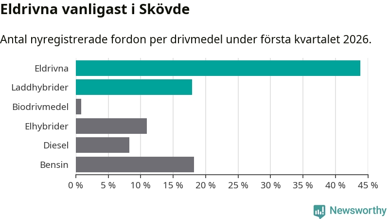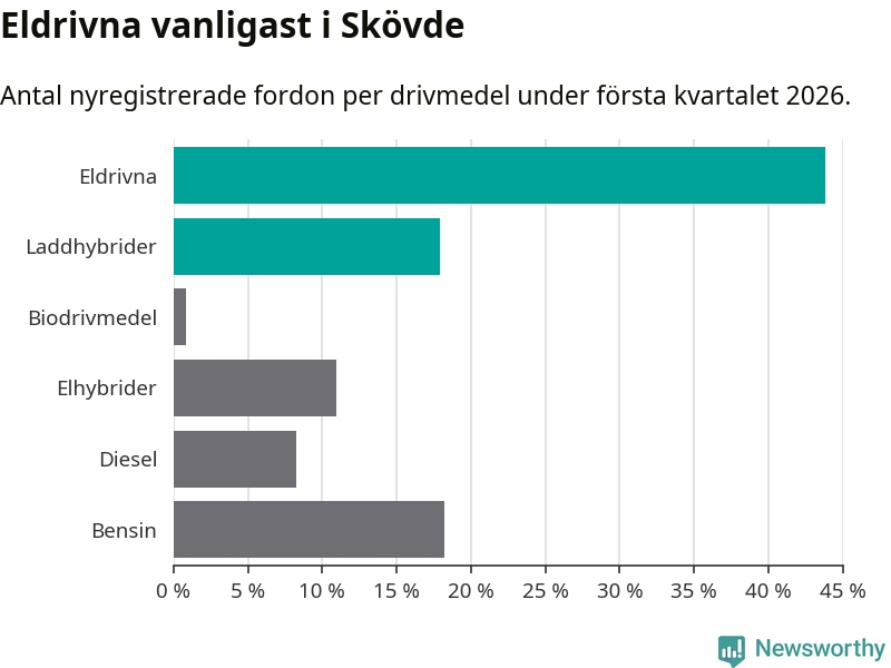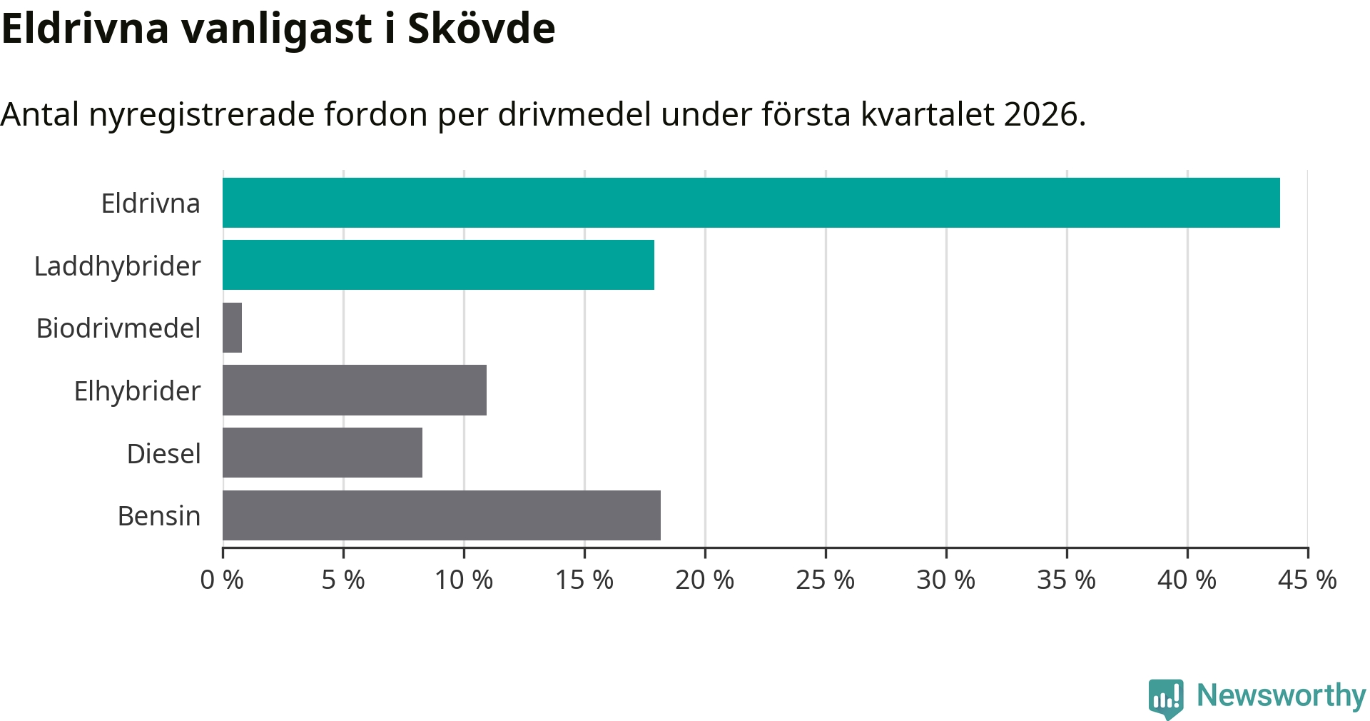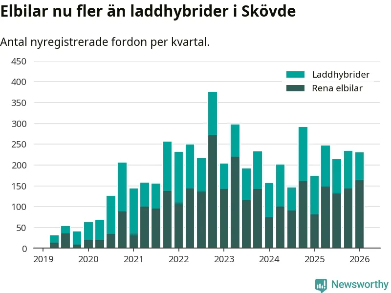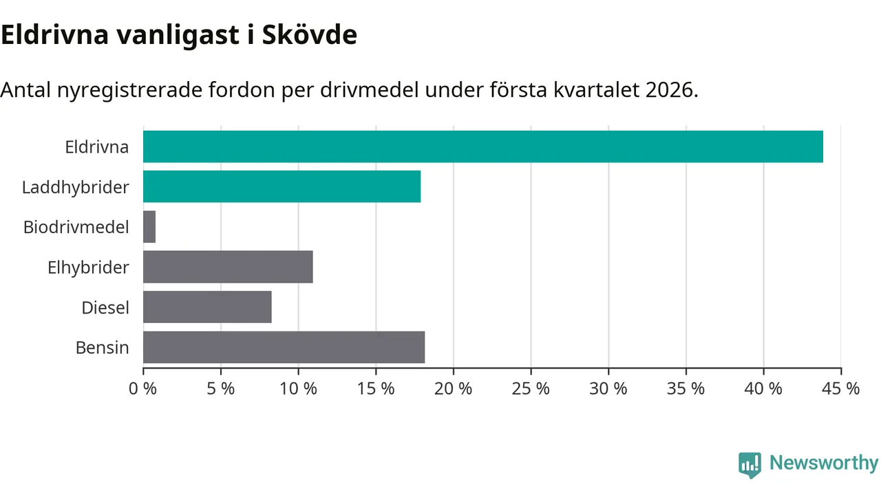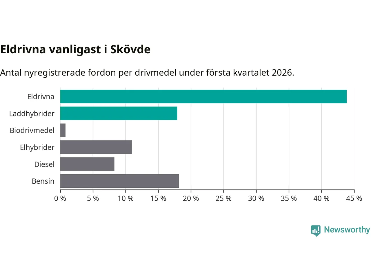 Under första kvartalet 2026 var 62 procent av alla nyregistrerade personbilar i Skövde laddbara (sammanlagt registrerades 374 nya bilar). Merparten av de laddbara bilarna var rena elbilar (44 procent av alla).