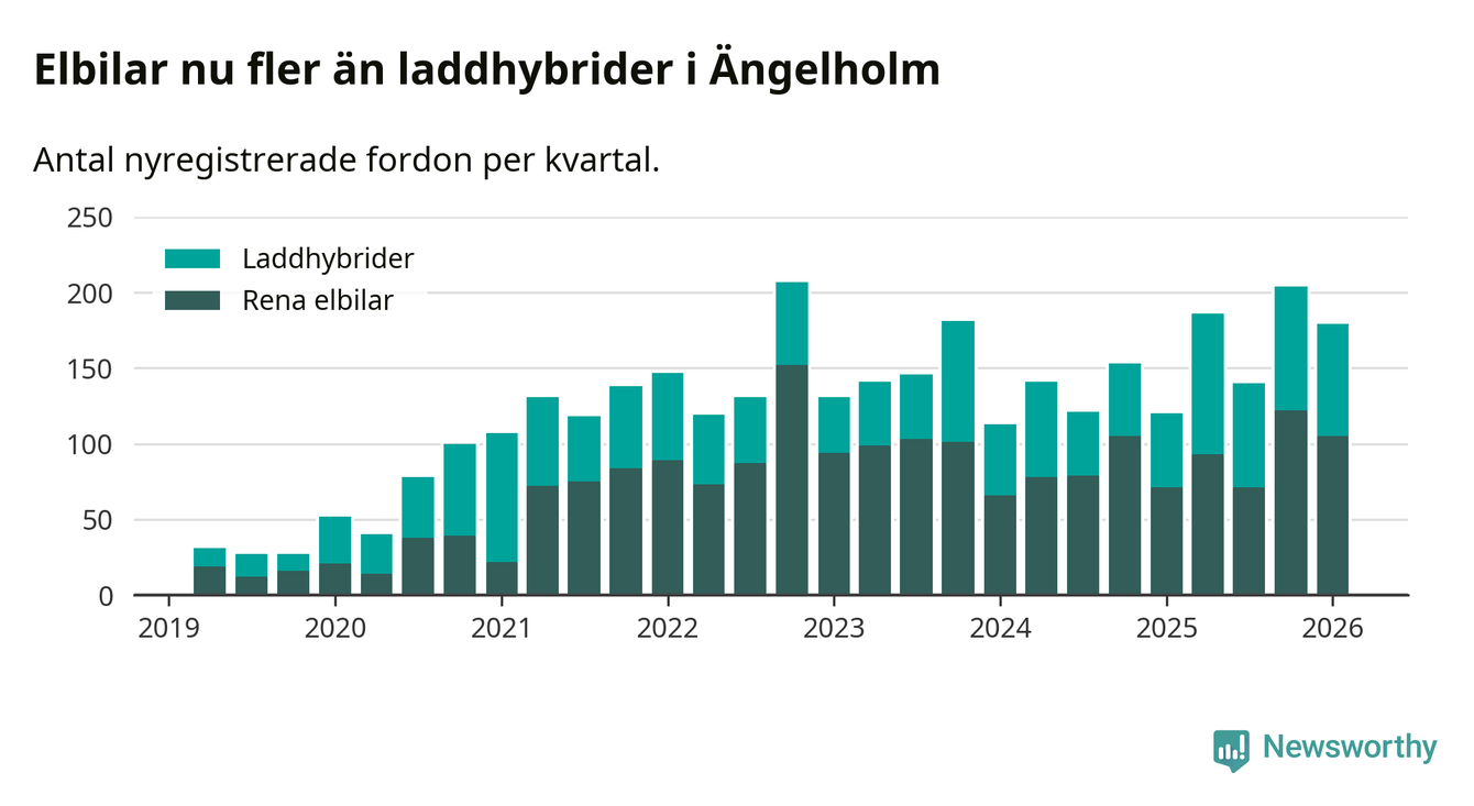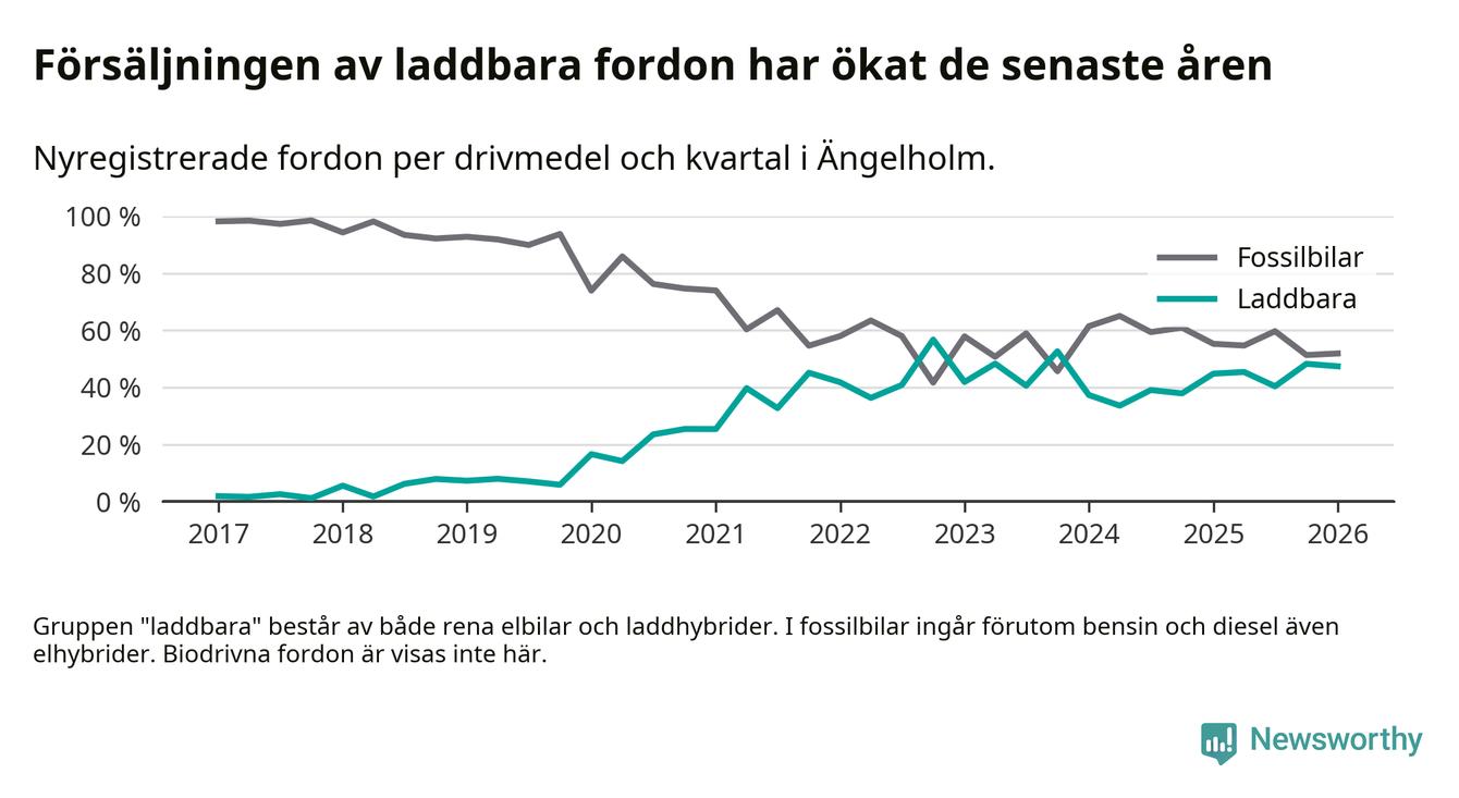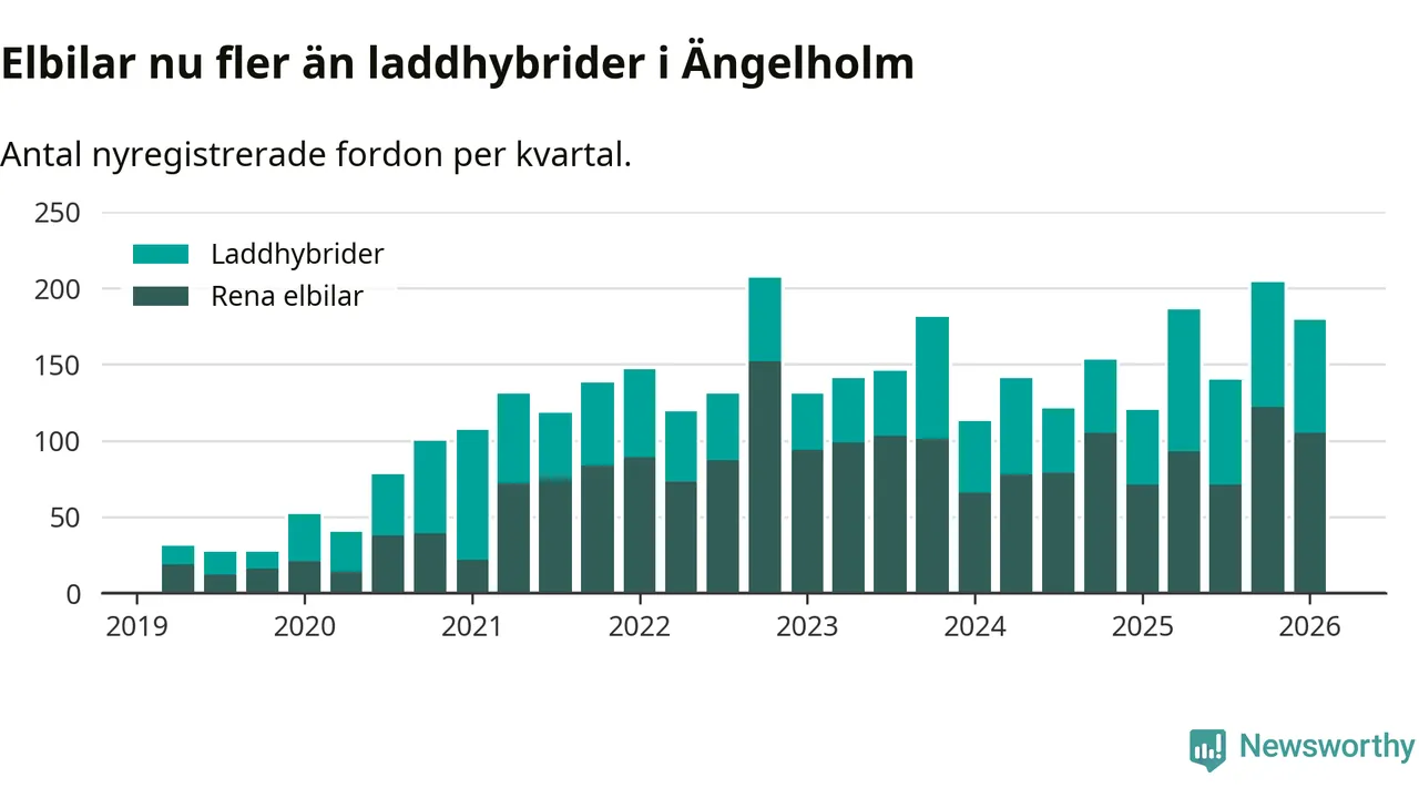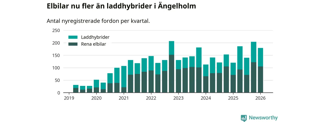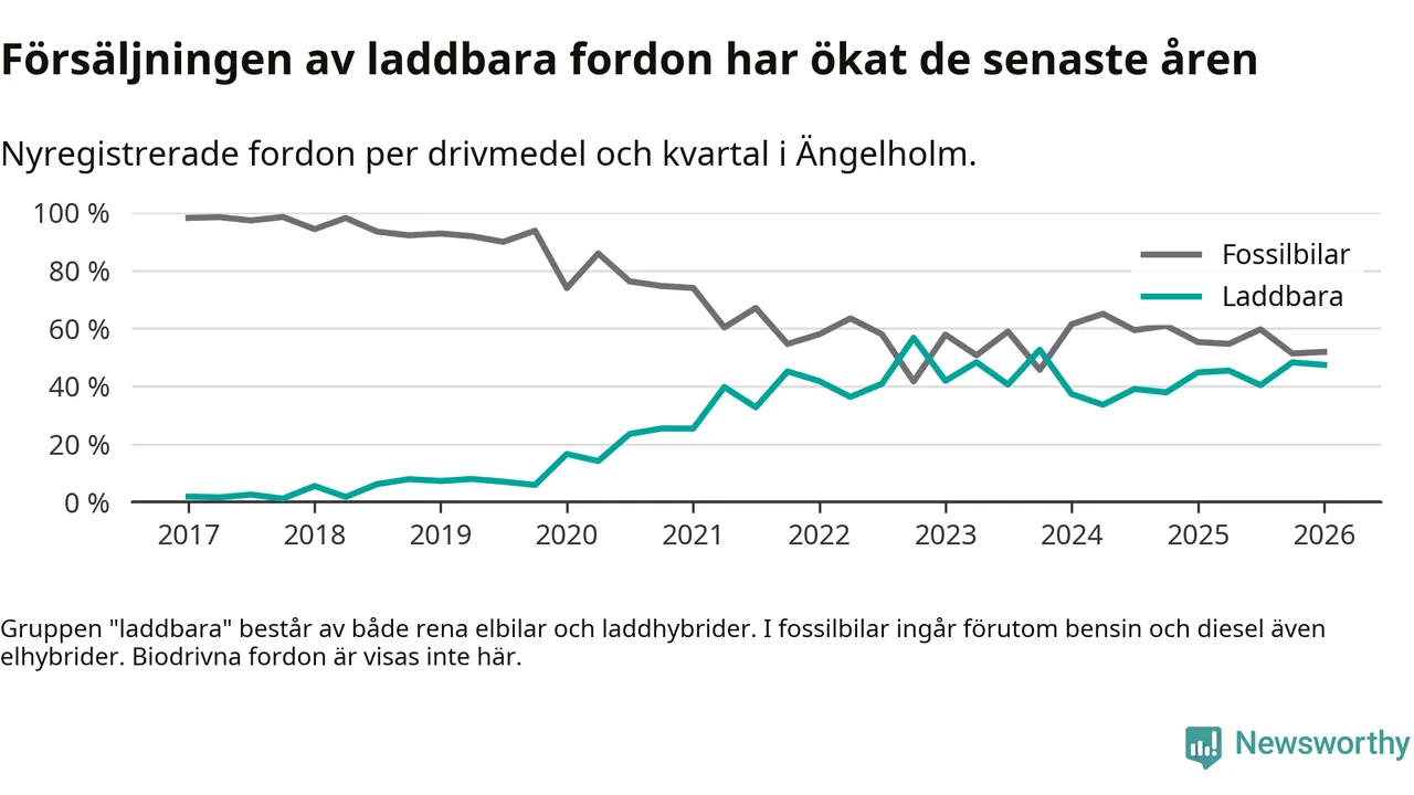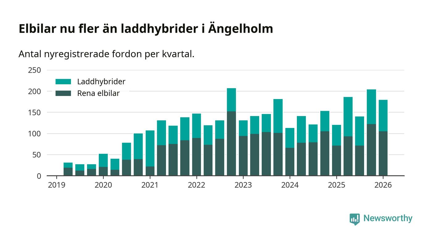Under första kvartalet 2026 var 47 procent av alla nyregistrerade personbilar i Ängelholm laddbara (sammanlagt registrerades 378 nya bilar). Merparten av de laddbara bilarna var rena elbilar (28 procent av alla).