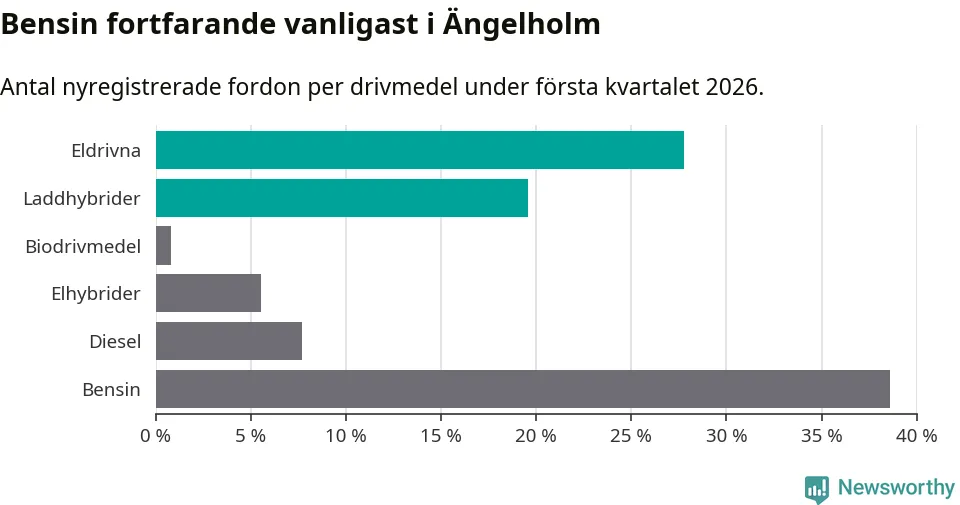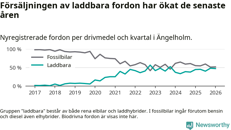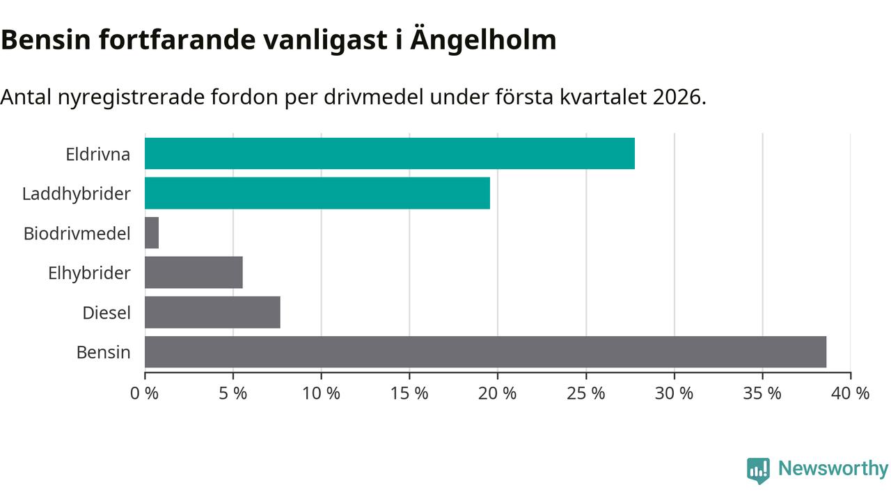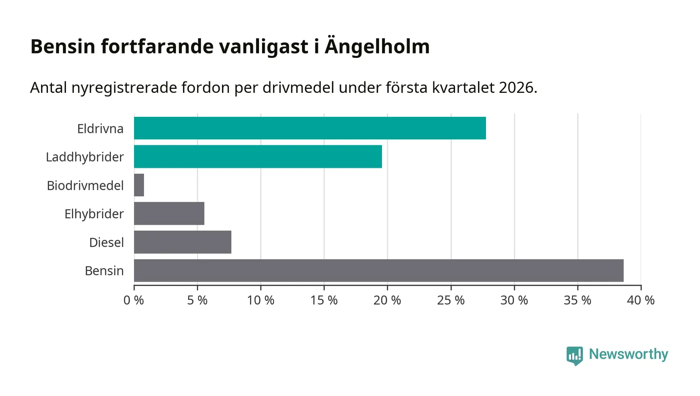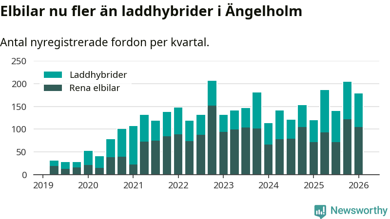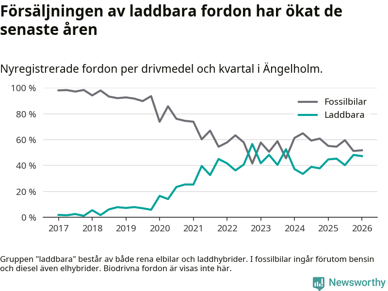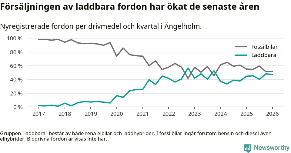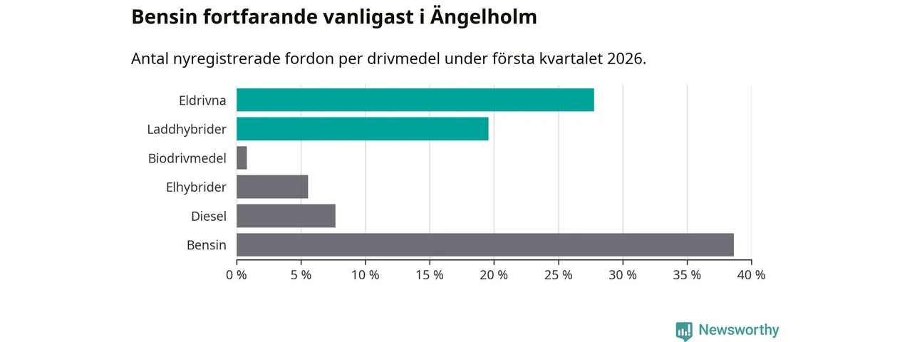 Under första kvartalet 2026 var 47 procent av alla nyregistrerade personbilar i Ängelholm laddbara (sammanlagt registrerades 378 nya bilar). Merparten av de laddbara bilarna var rena elbilar (28 procent av alla).