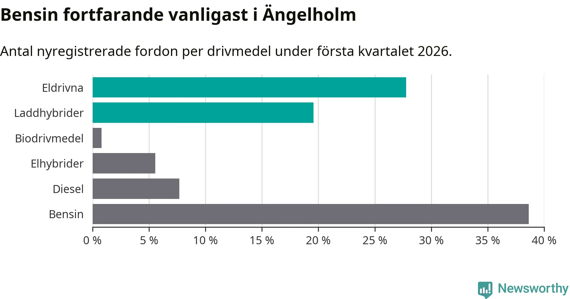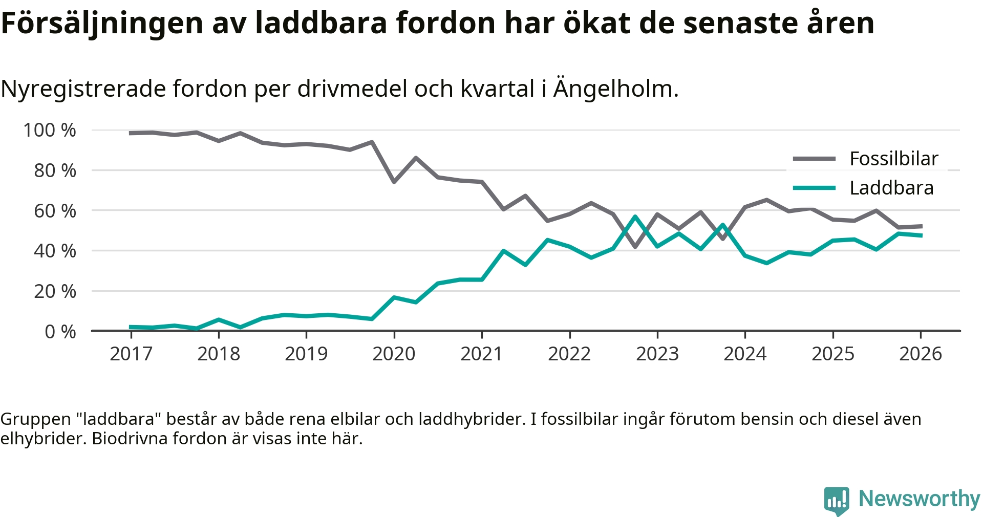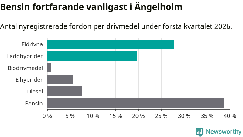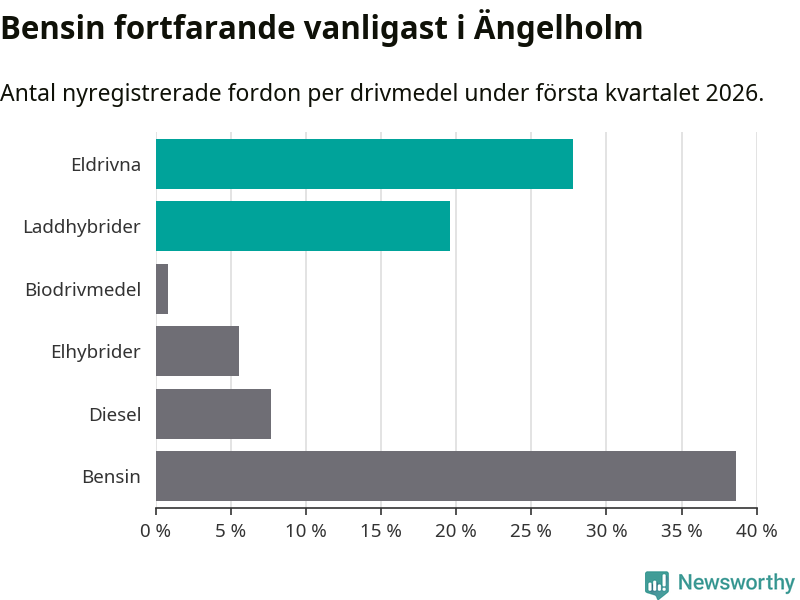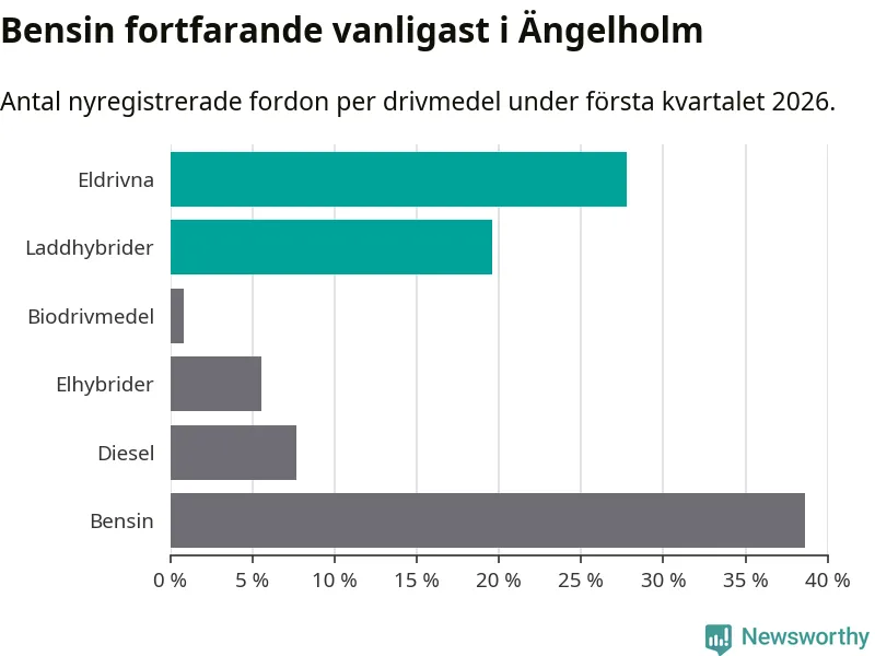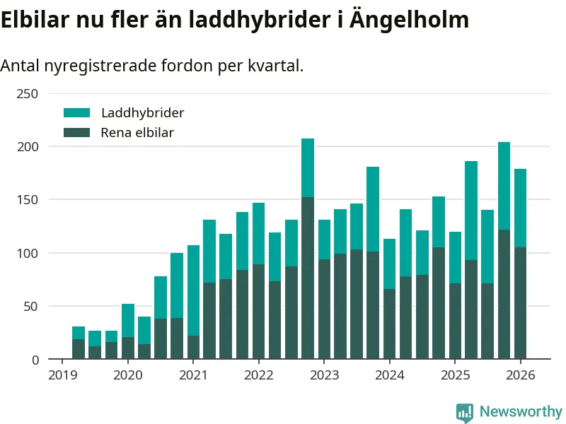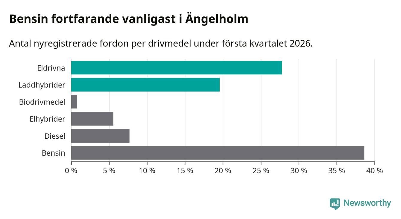 Under första kvartalet 2026 var 47 procent av alla nyregistrerade personbilar i Ängelholm laddbara (sammanlagt registrerades 378 nya bilar). Merparten av de laddbara bilarna var rena elbilar (28 procent av alla).