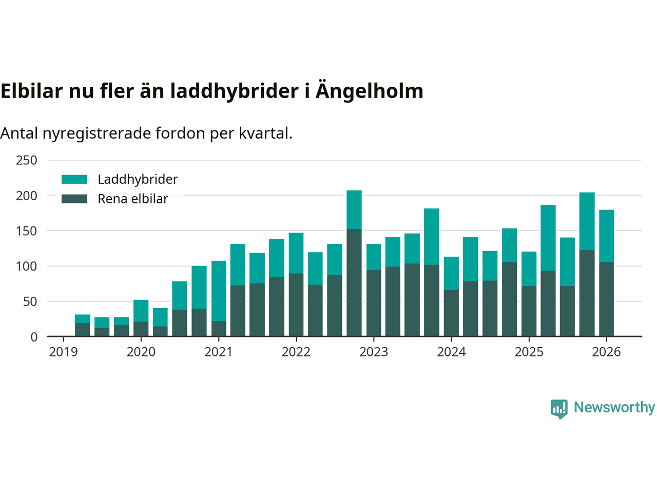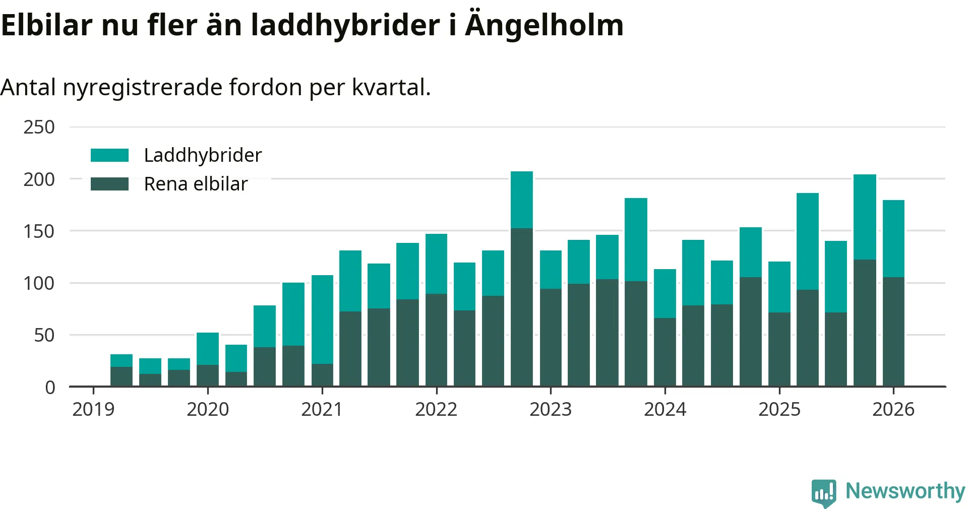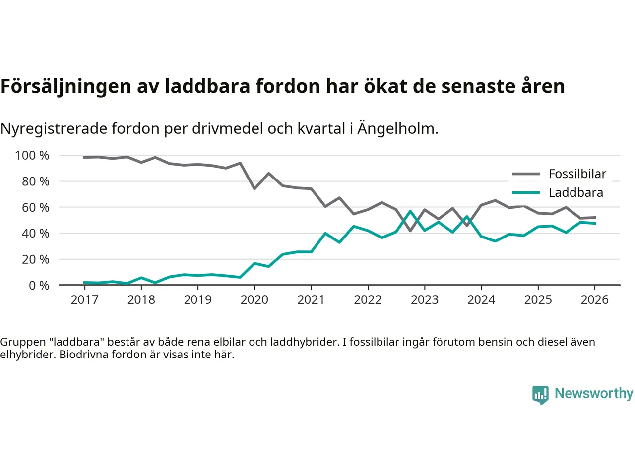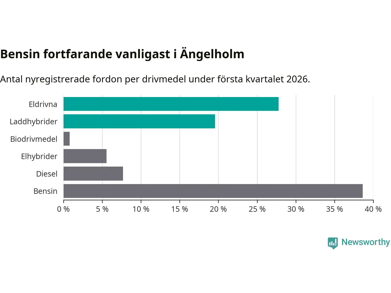 Under första kvartalet 2026 var 47 procent av alla nyregistrerade personbilar i Ängelholm laddbara (sammanlagt registrerades 378 nya bilar). Merparten av de laddbara bilarna var rena elbilar (28 procent av alla).
