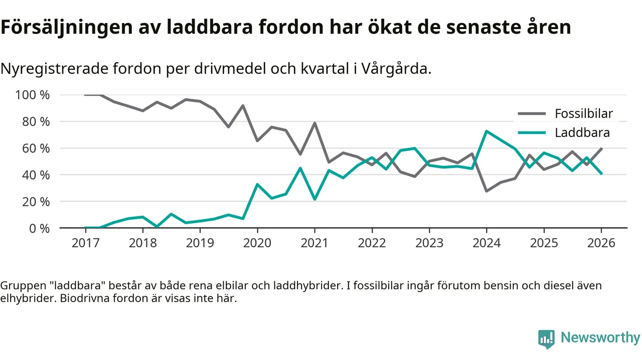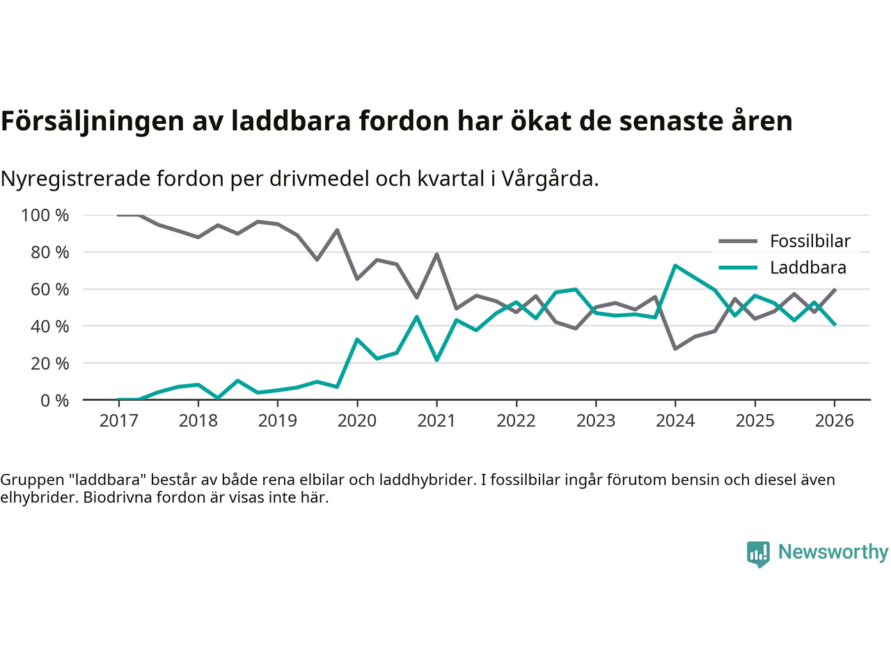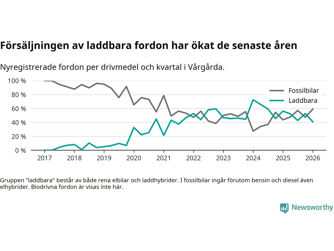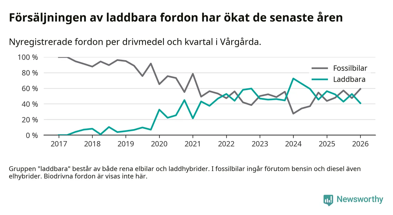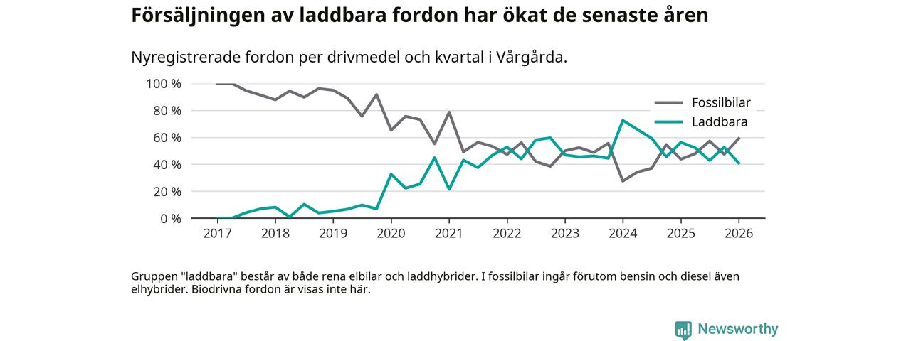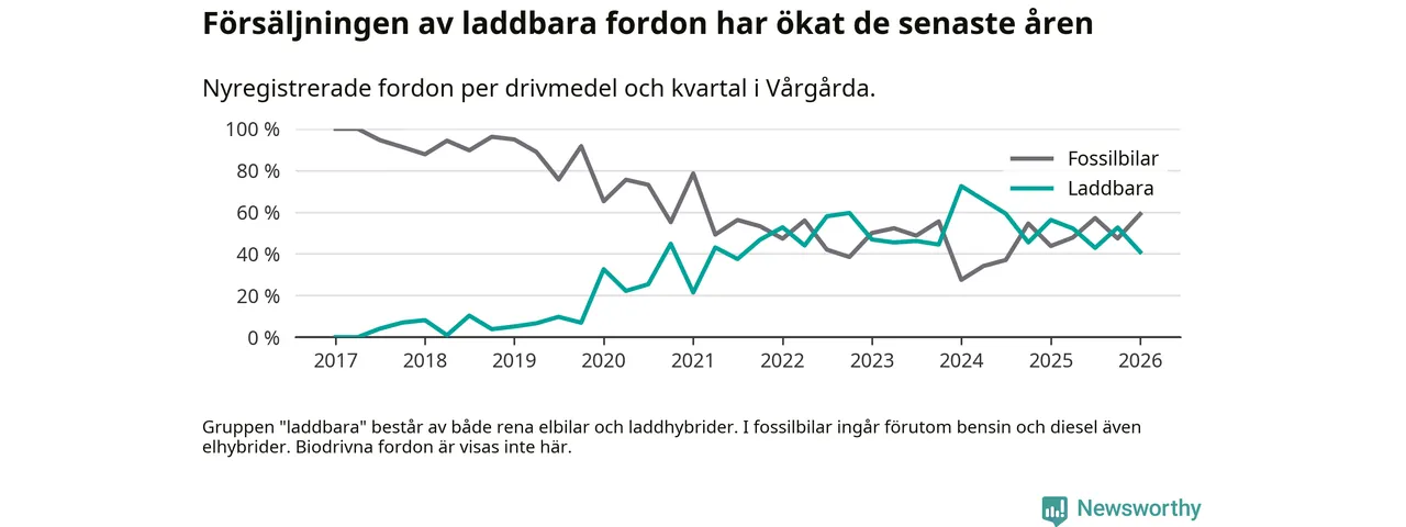 Under första kvartalet 2026 var 41 procent av alla nyregistrerade personbilar i Vårgårda laddbara (sammanlagt registrerades 44 nya bilar). Merparten av de laddbara bilarna var rena elbilar (34 procent av alla).