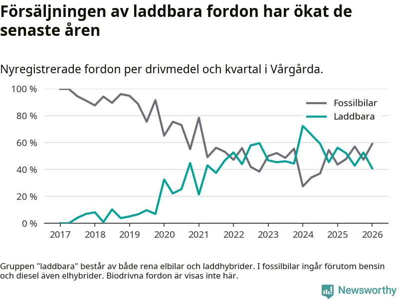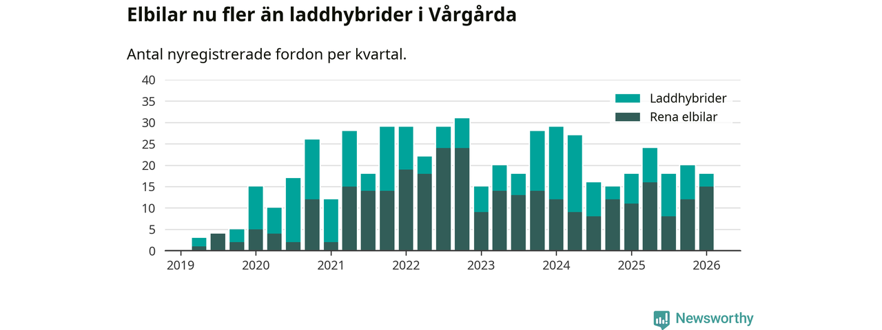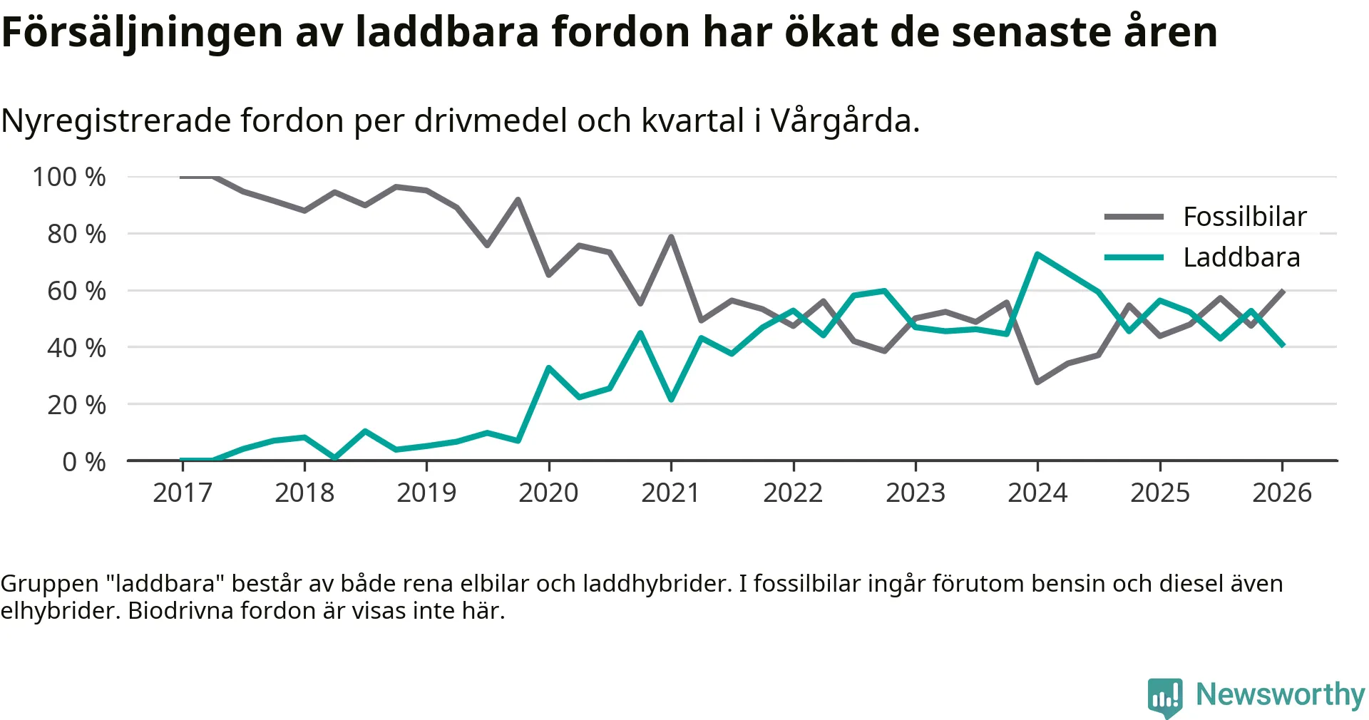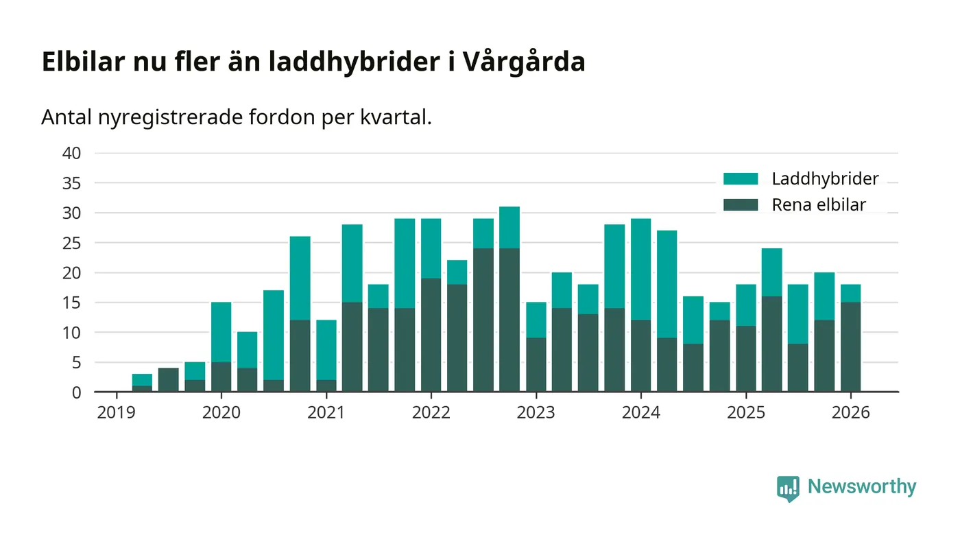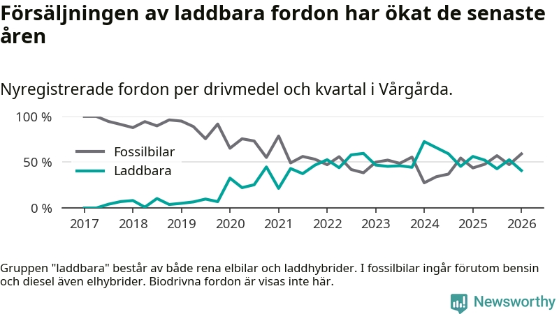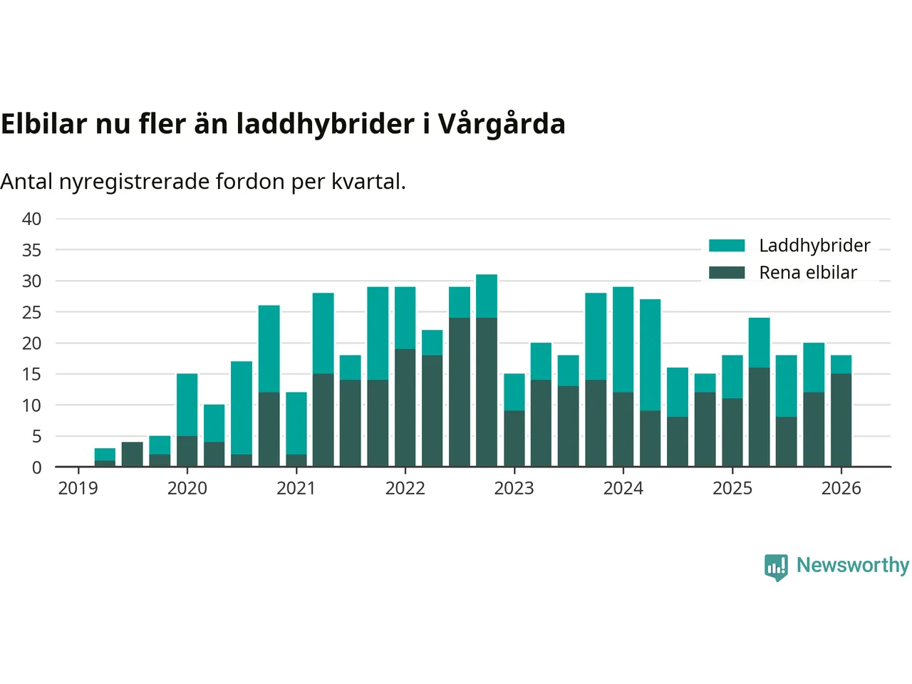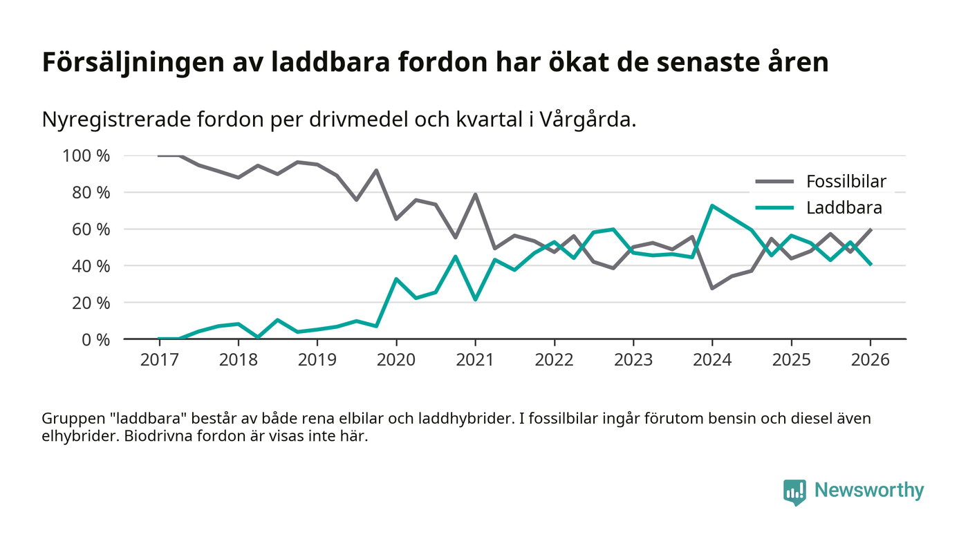 Under första kvartalet 2026 var 41 procent av alla nyregistrerade personbilar i Vårgårda laddbara (sammanlagt registrerades 44 nya bilar). Merparten av de laddbara bilarna var rena elbilar (34 procent av alla).