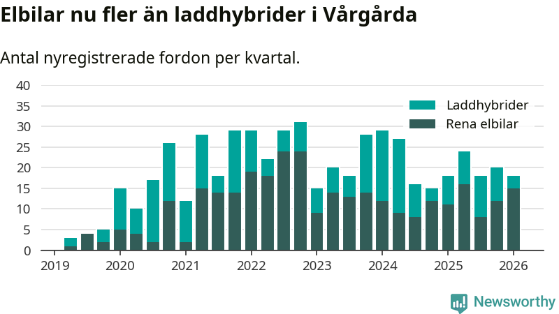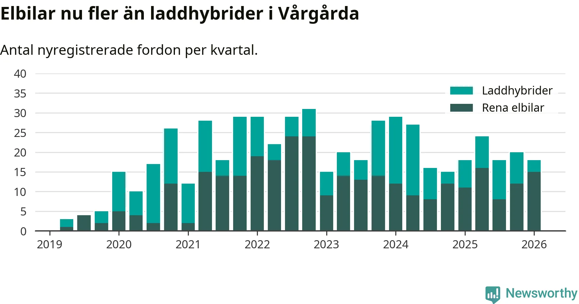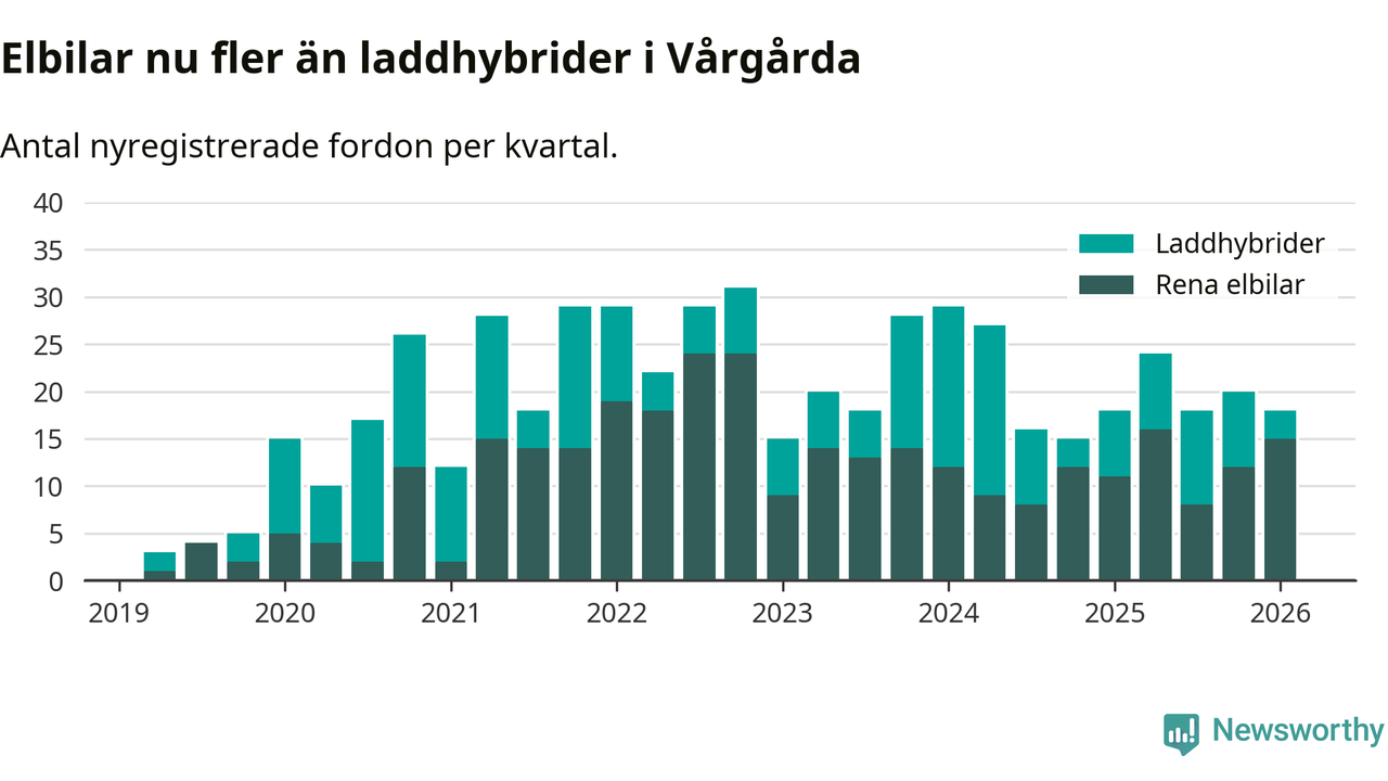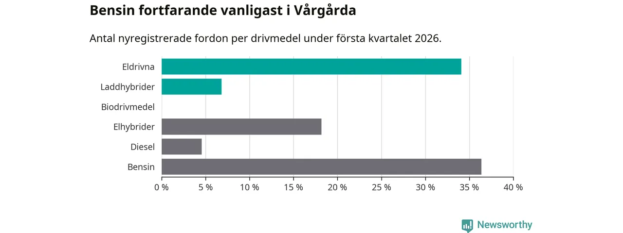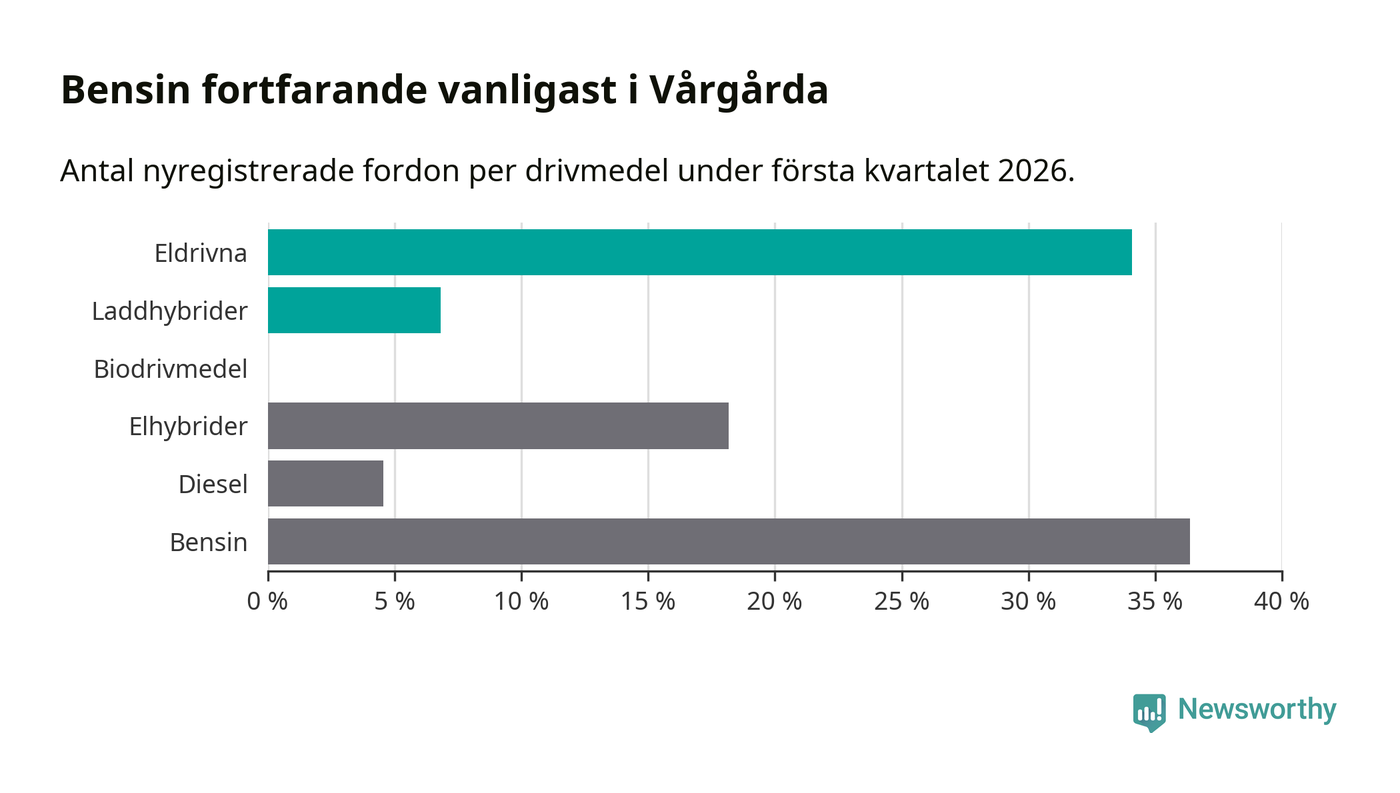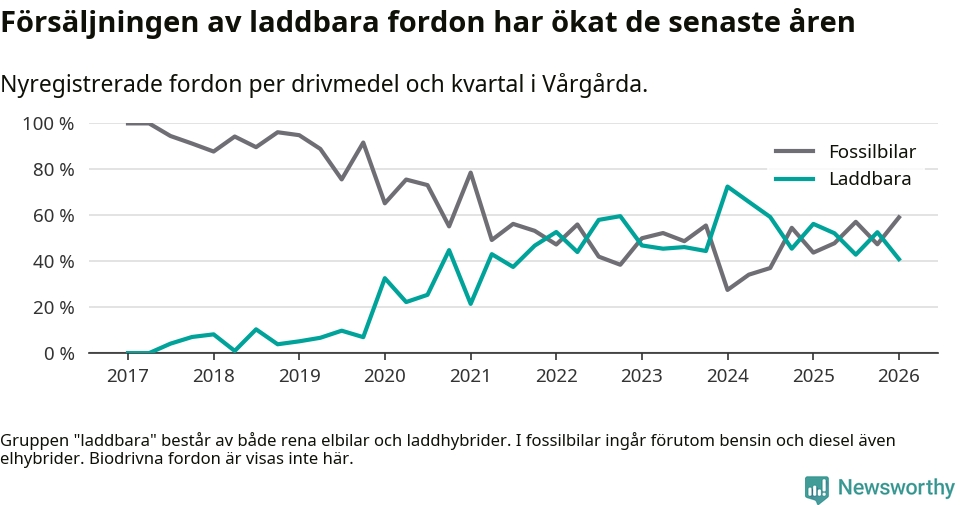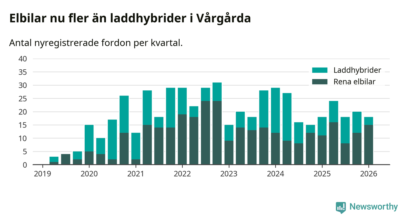 Under första kvartalet 2026 var 41 procent av alla nyregistrerade personbilar i Vårgårda laddbara (sammanlagt registrerades 44 nya bilar). Merparten av de laddbara bilarna var rena elbilar (34 procent av alla).
