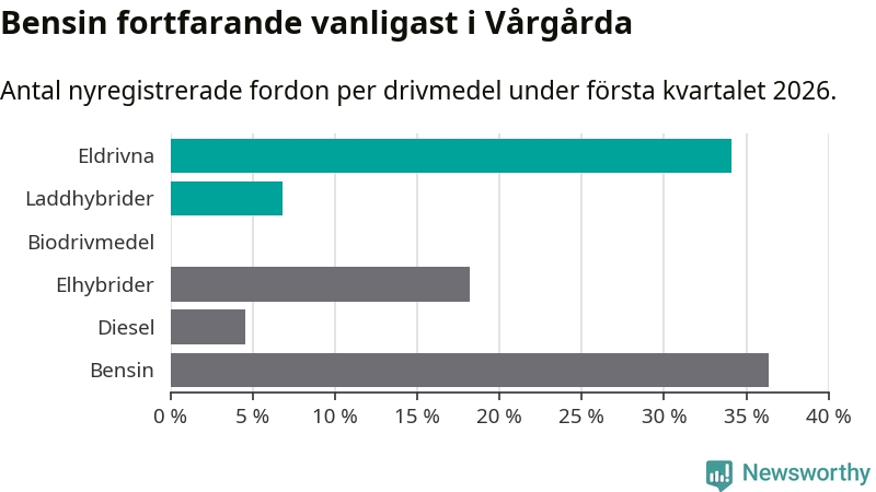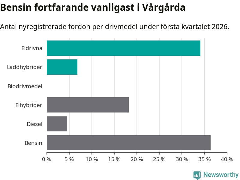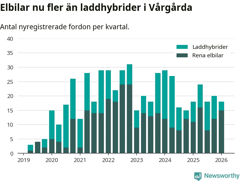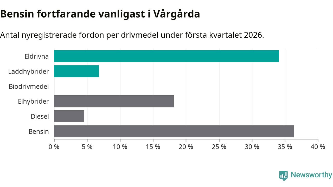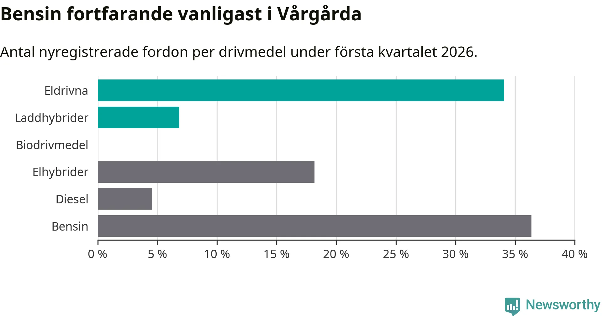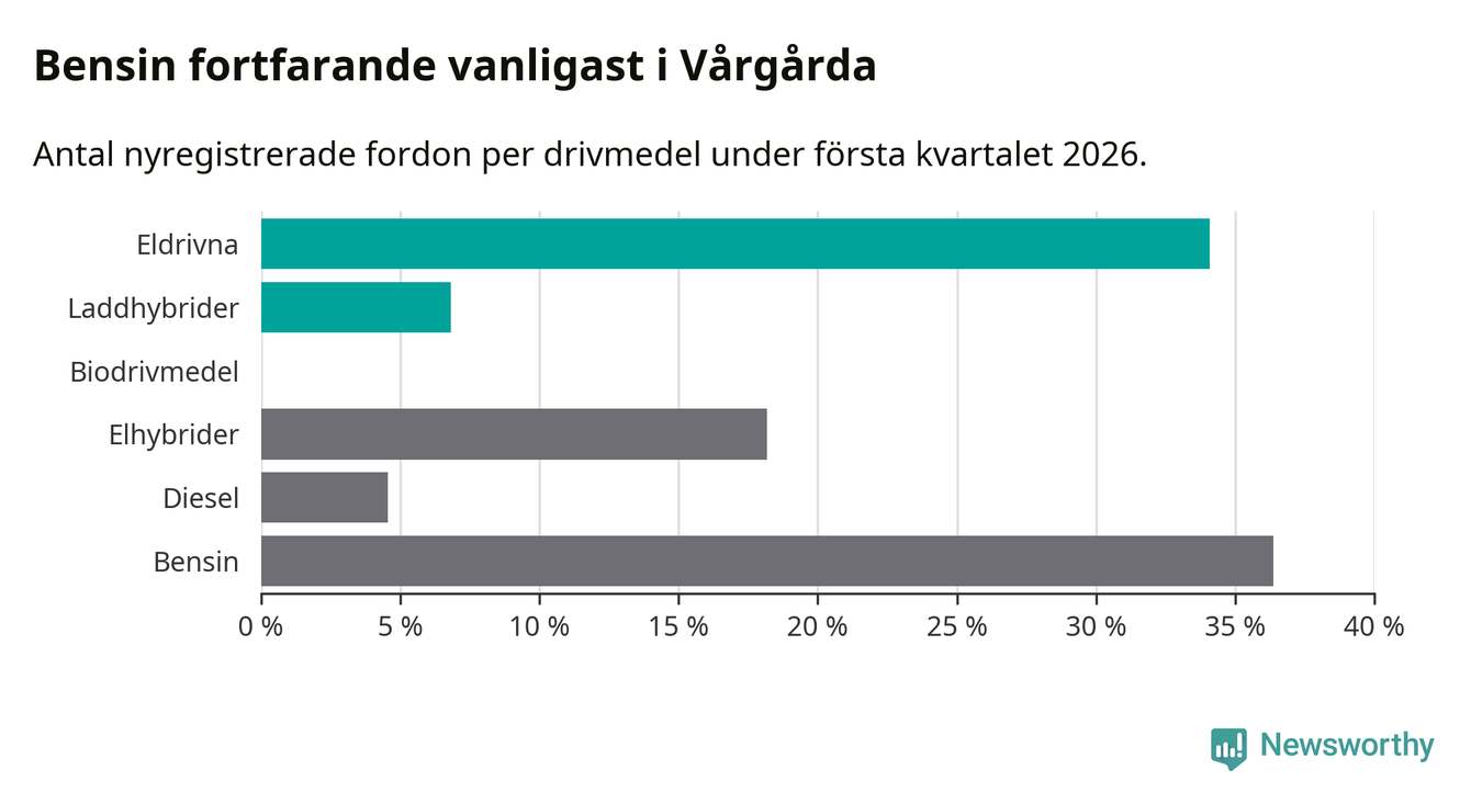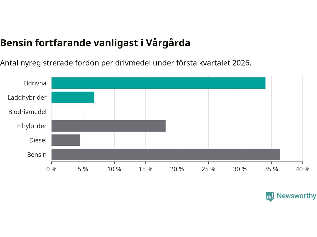 Under första kvartalet 2026 var 41 procent av alla nyregistrerade personbilar i Vårgårda laddbara (sammanlagt registrerades 44 nya bilar). Merparten av de laddbara bilarna var rena elbilar (34 procent av alla).