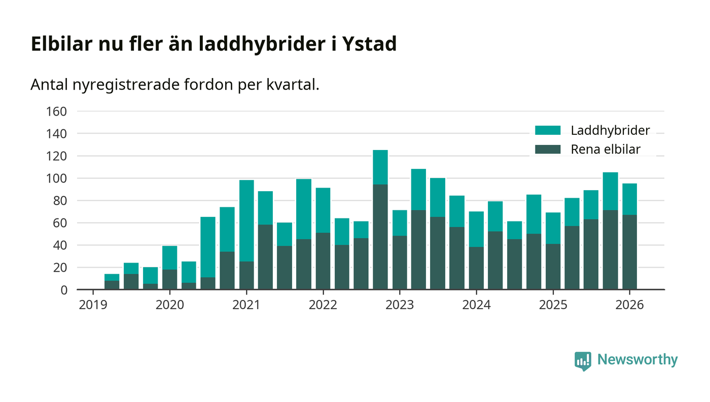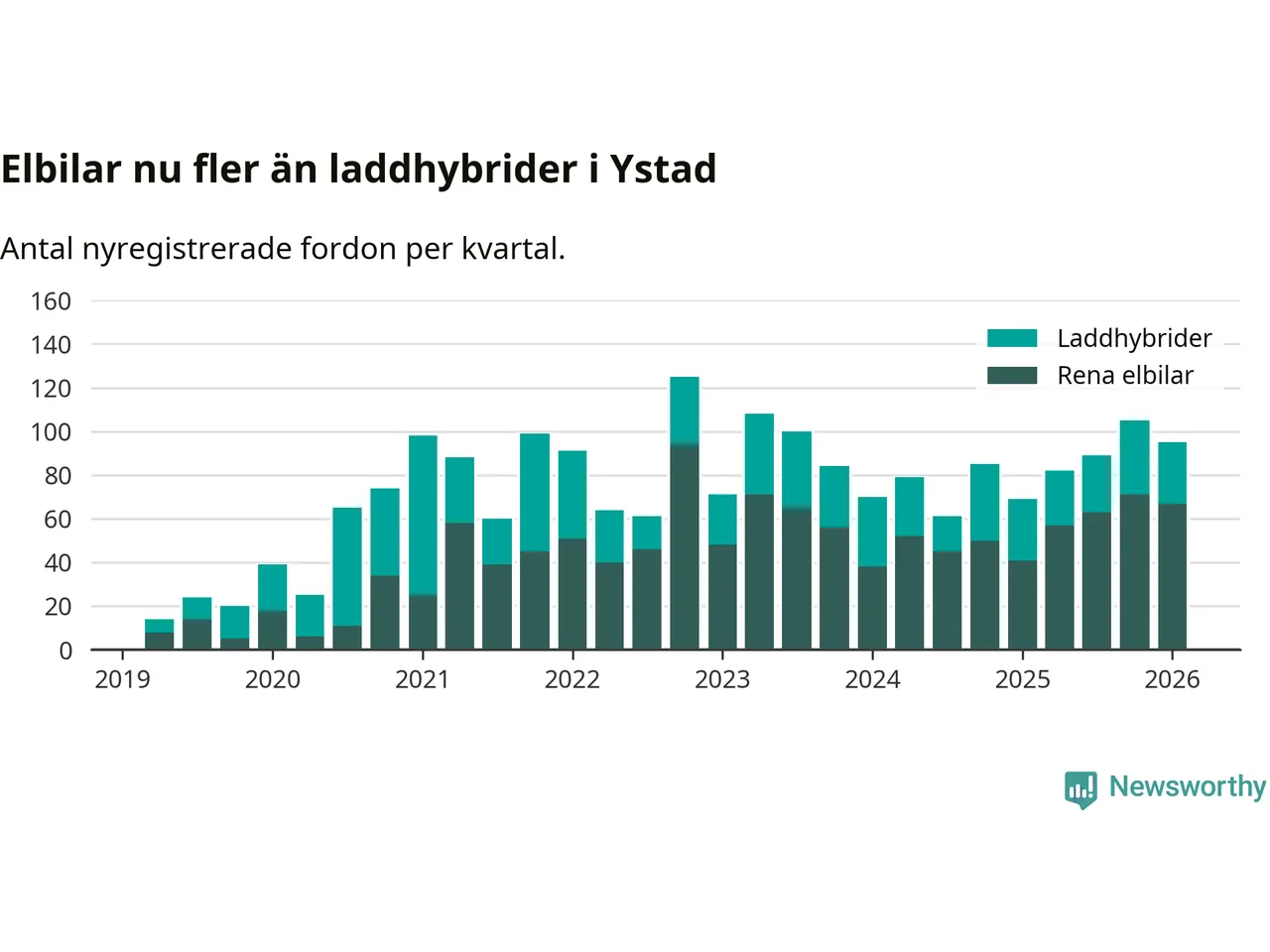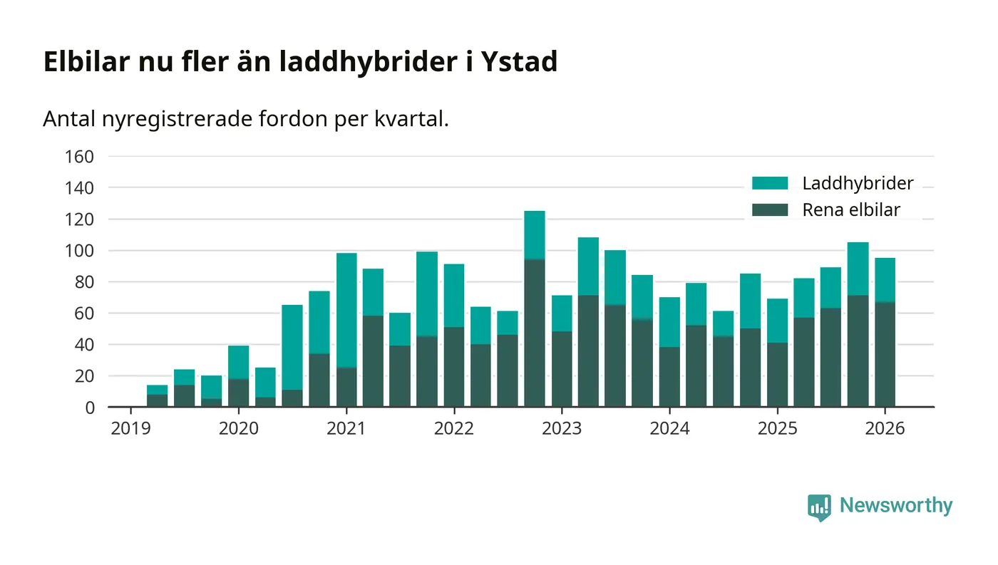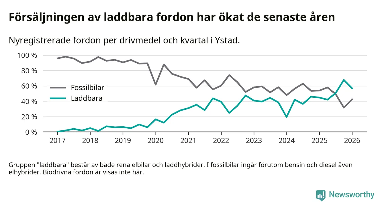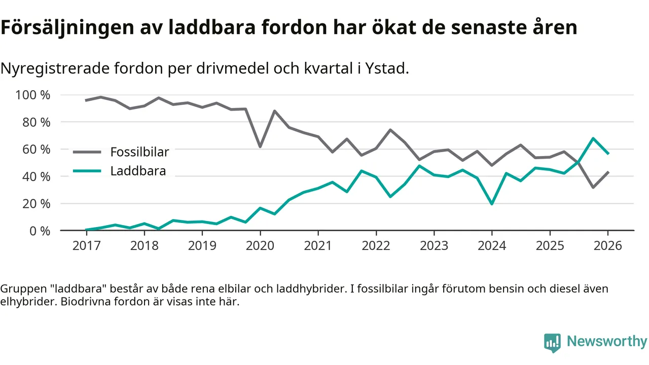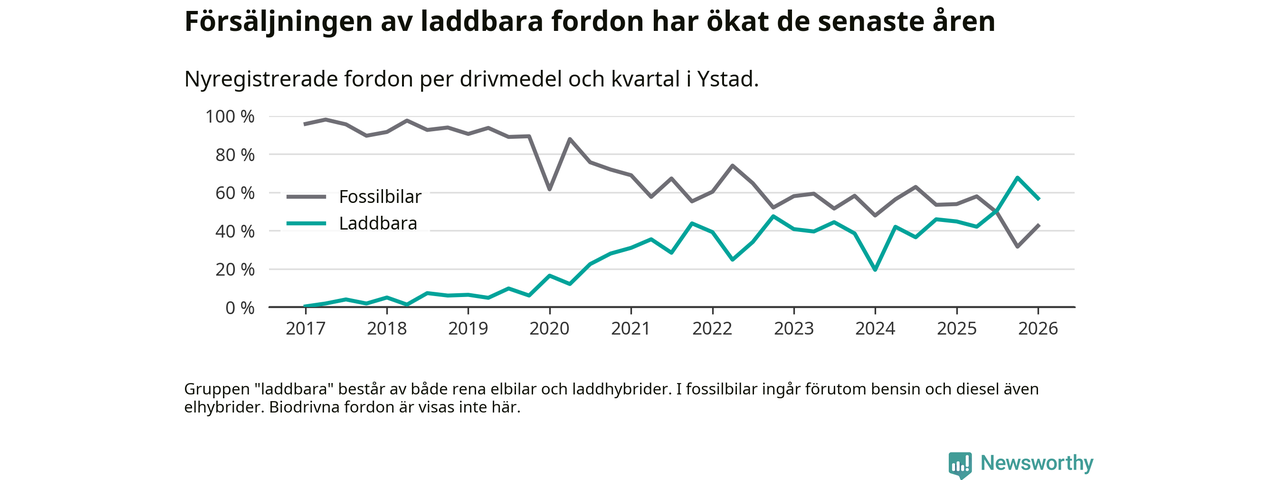 Under första kvartalet 2026 var 57 procent av alla nyregistrerade personbilar i Ystad laddbara (sammanlagt registrerades 167 nya bilar). Merparten av de laddbara bilarna var rena elbilar (40 procent av alla).