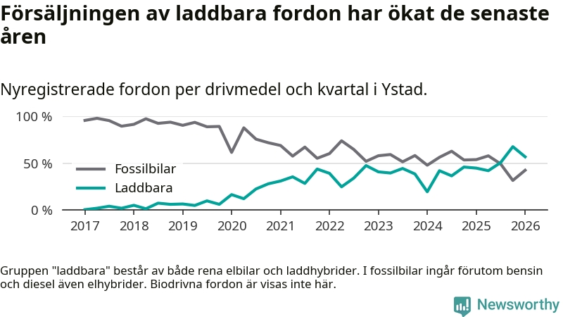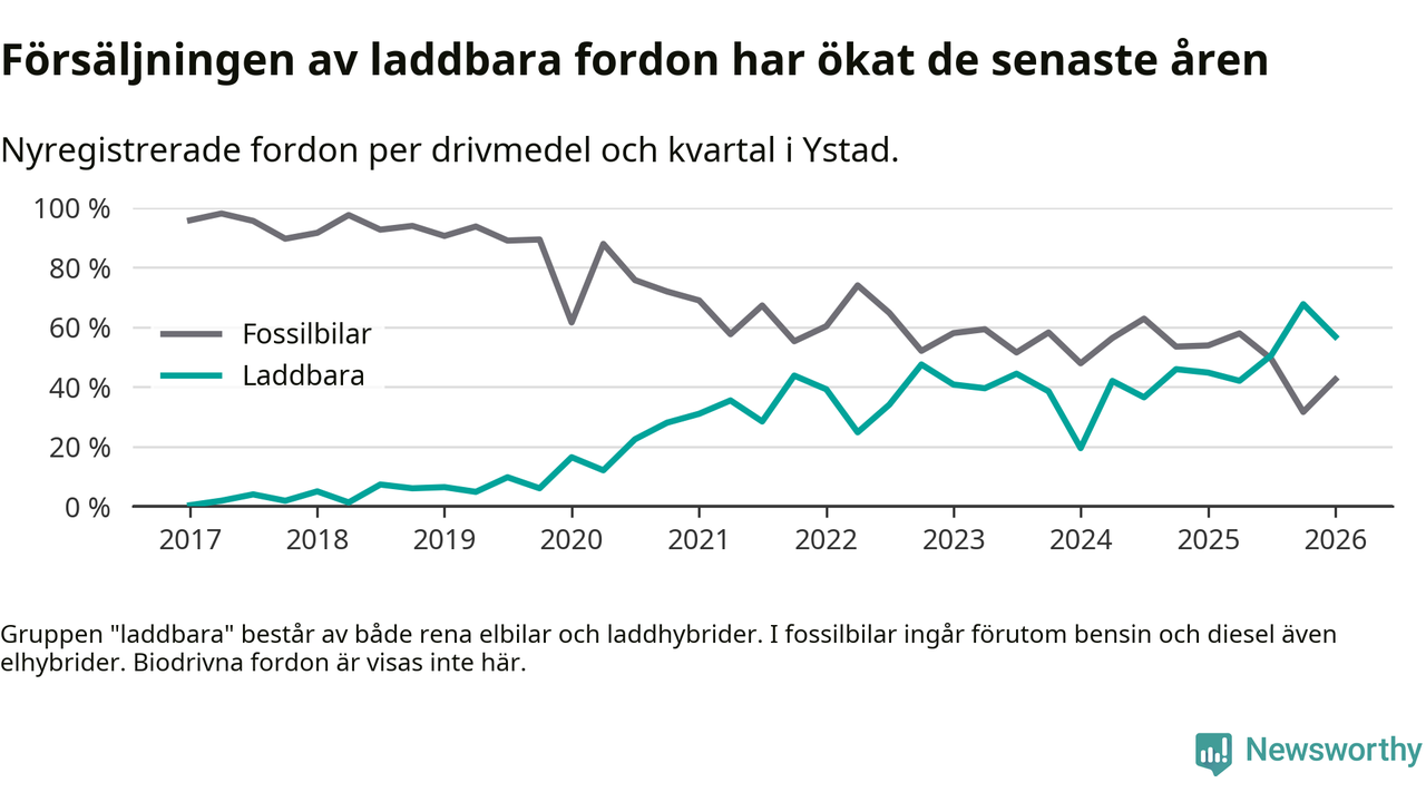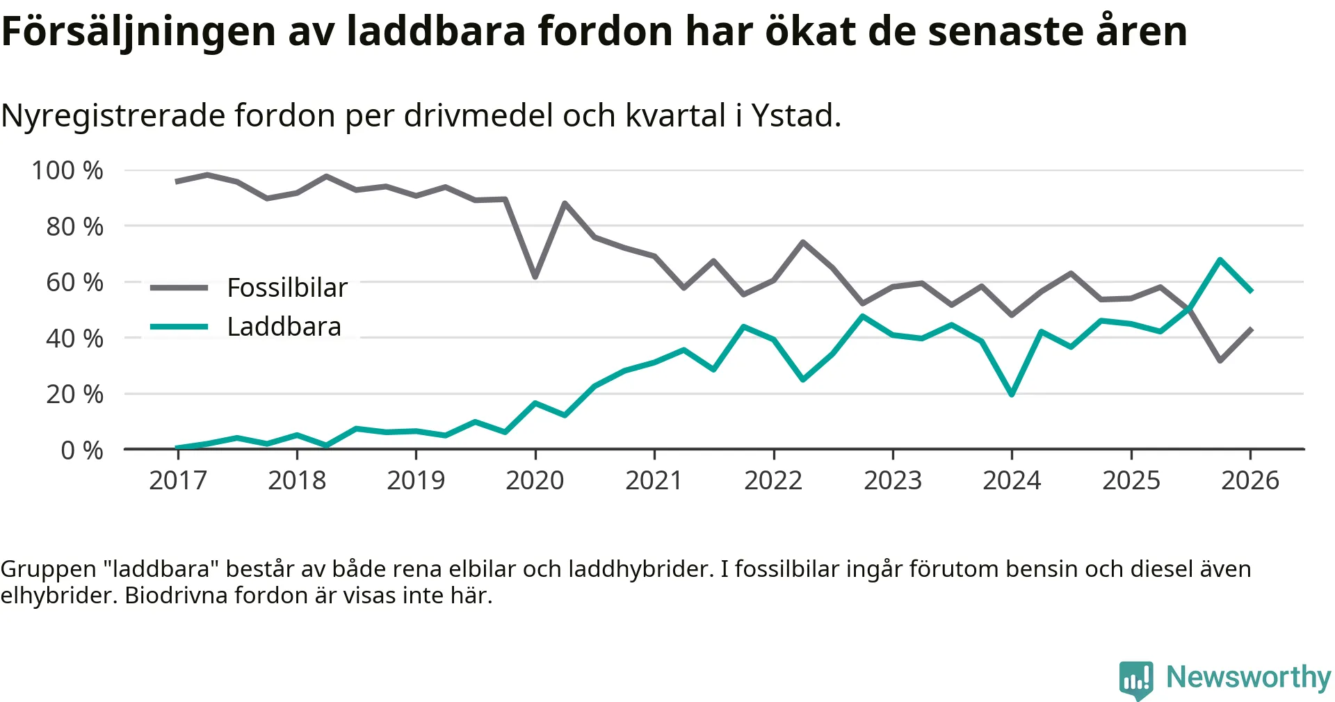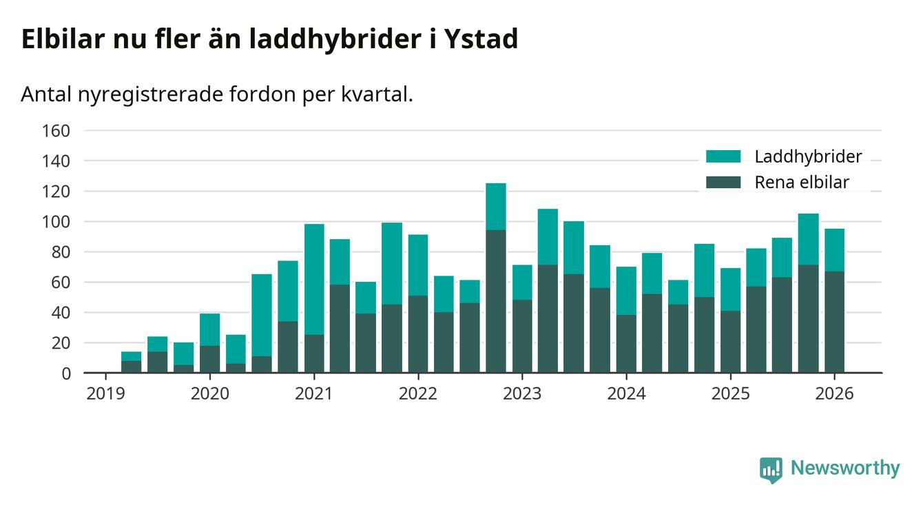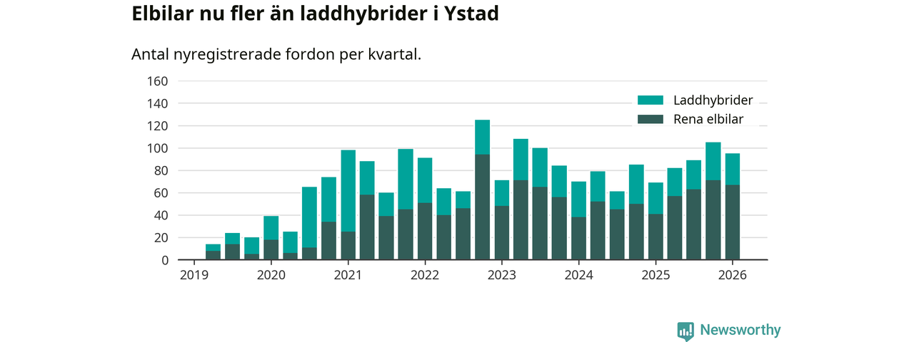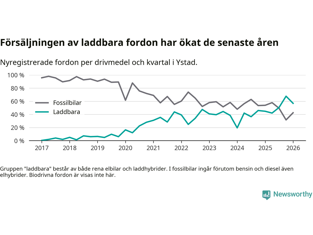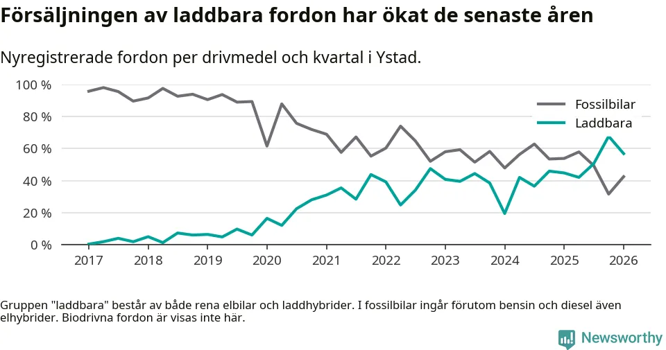 Under första kvartalet 2026 var 57 procent av alla nyregistrerade personbilar i Ystad laddbara (sammanlagt registrerades 167 nya bilar). Merparten av de laddbara bilarna var rena elbilar (40 procent av alla).
