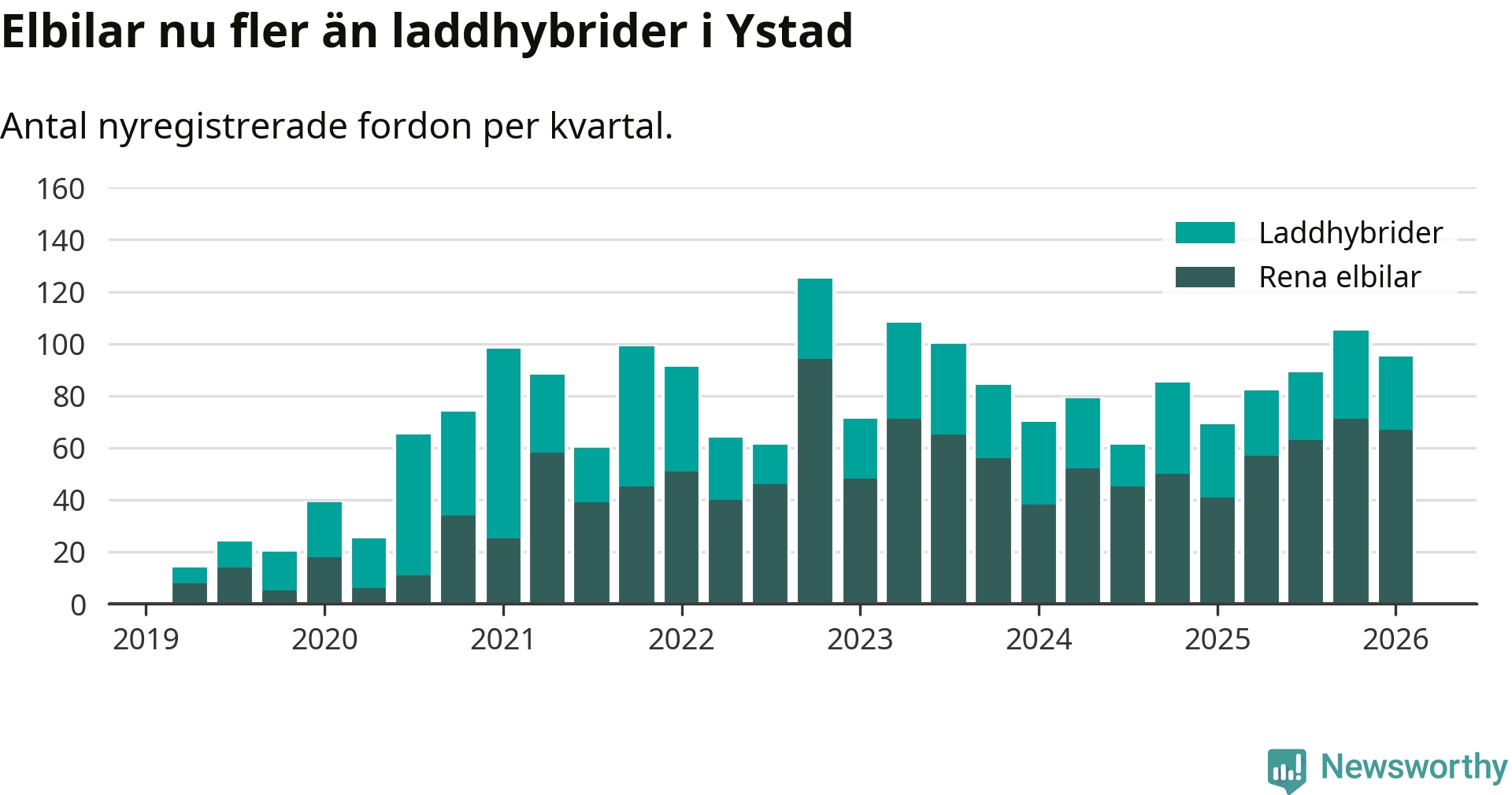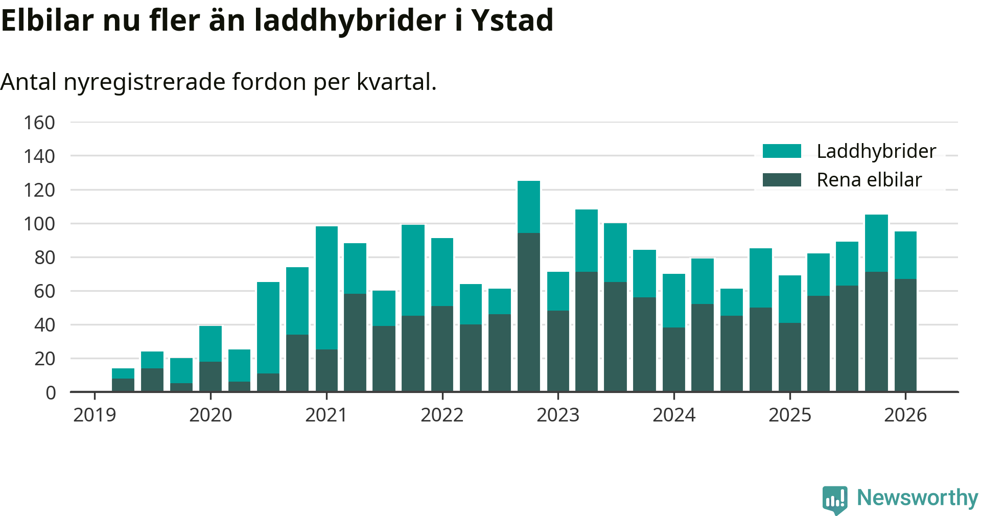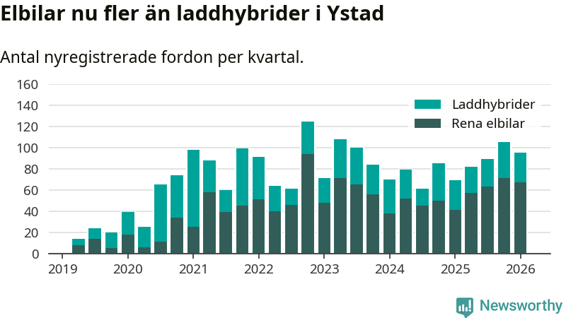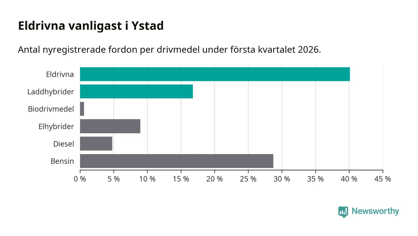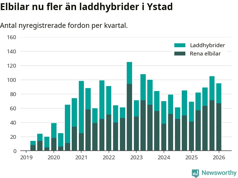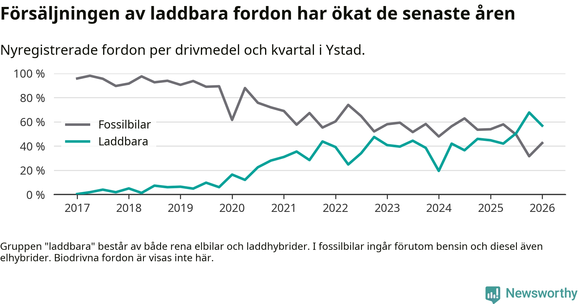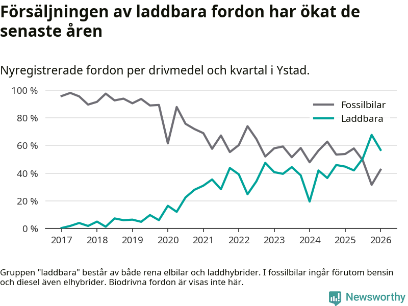 Under första kvartalet 2026 var 57 procent av alla nyregistrerade personbilar i Ystad laddbara (sammanlagt registrerades 167 nya bilar). Merparten av de laddbara bilarna var rena elbilar (40 procent av alla).