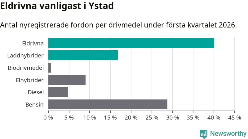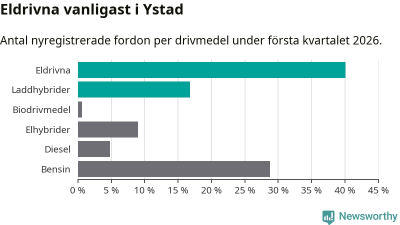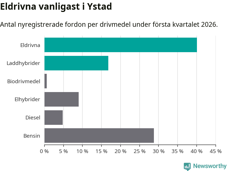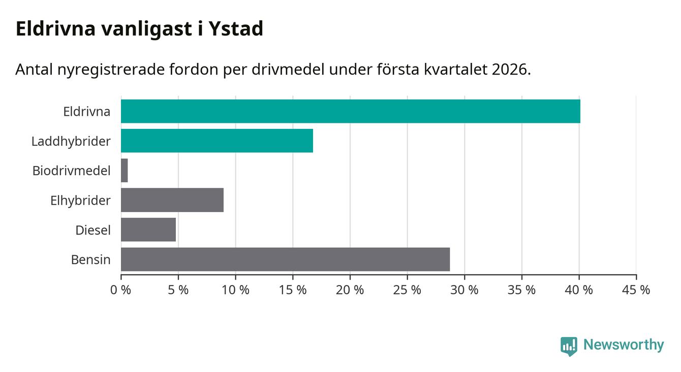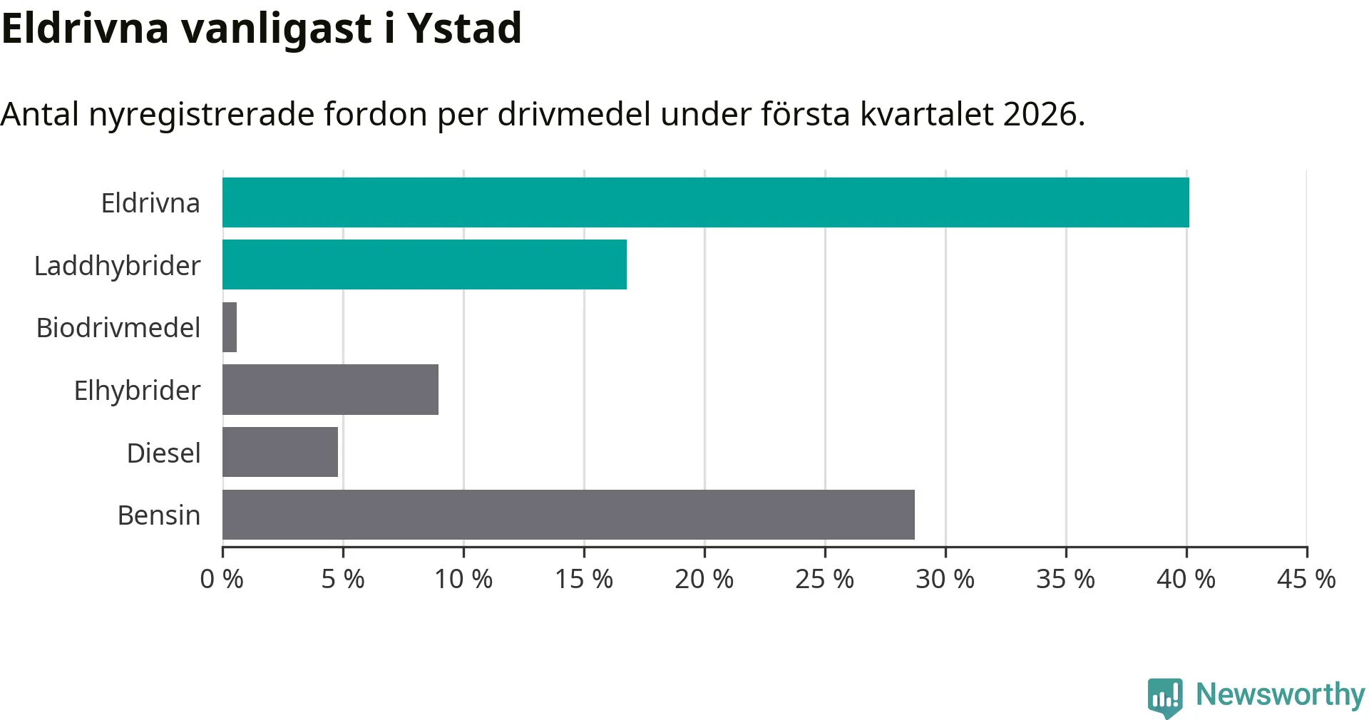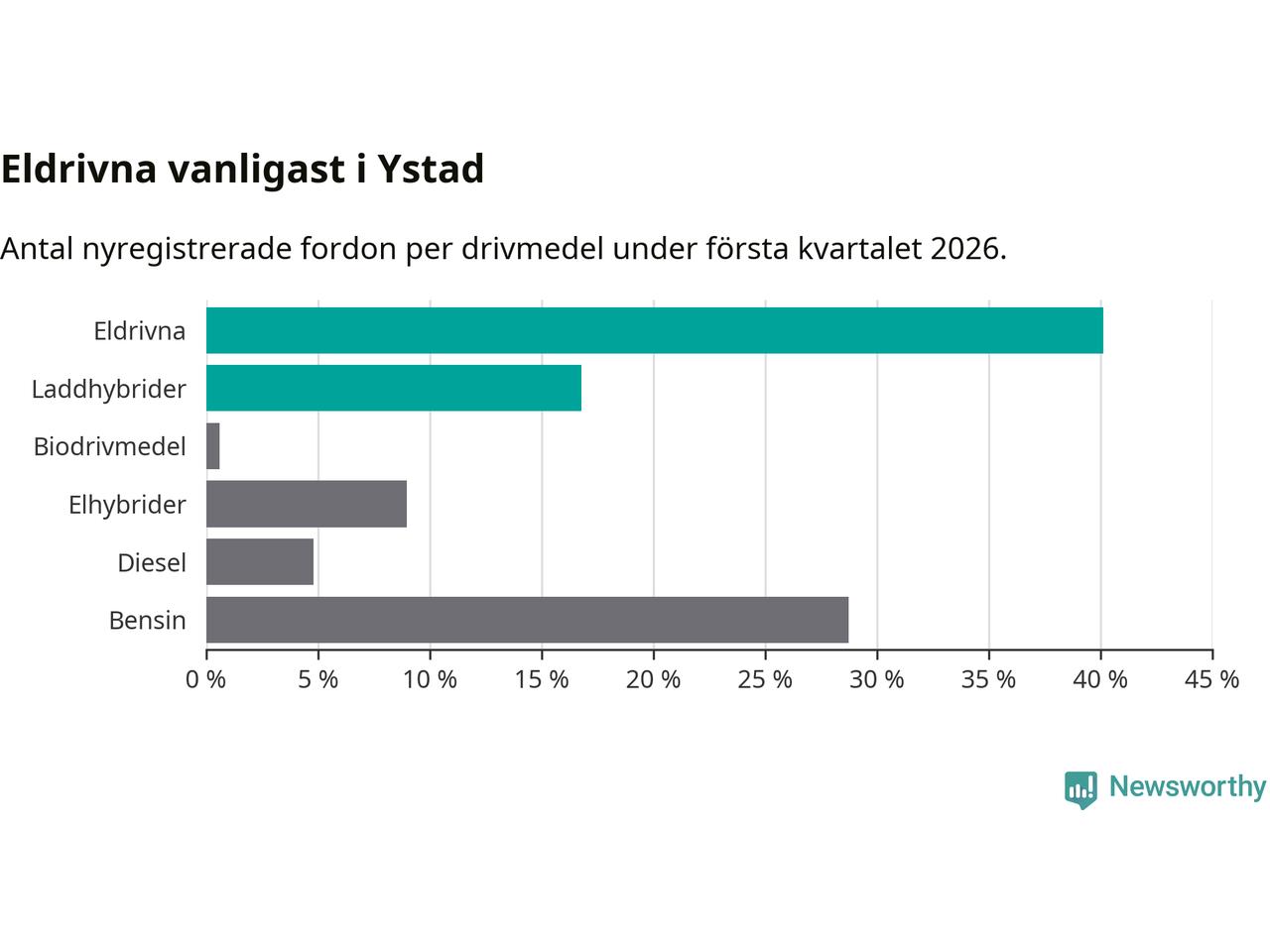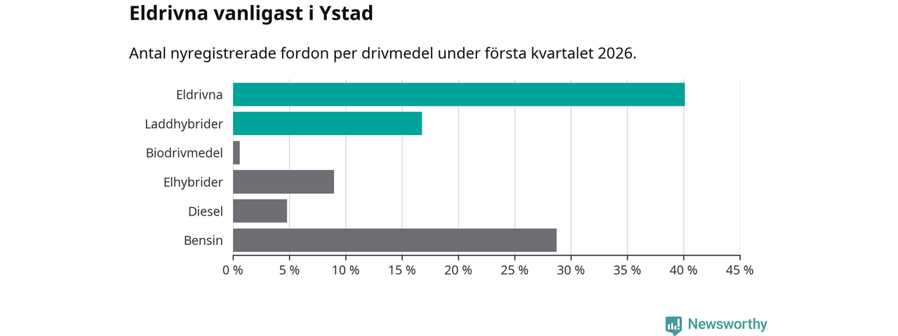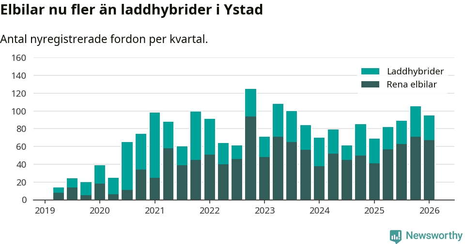 Under första kvartalet 2026 var 57 procent av alla nyregistrerade personbilar i Ystad laddbara (sammanlagt registrerades 167 nya bilar). Merparten av de laddbara bilarna var rena elbilar (40 procent av alla).