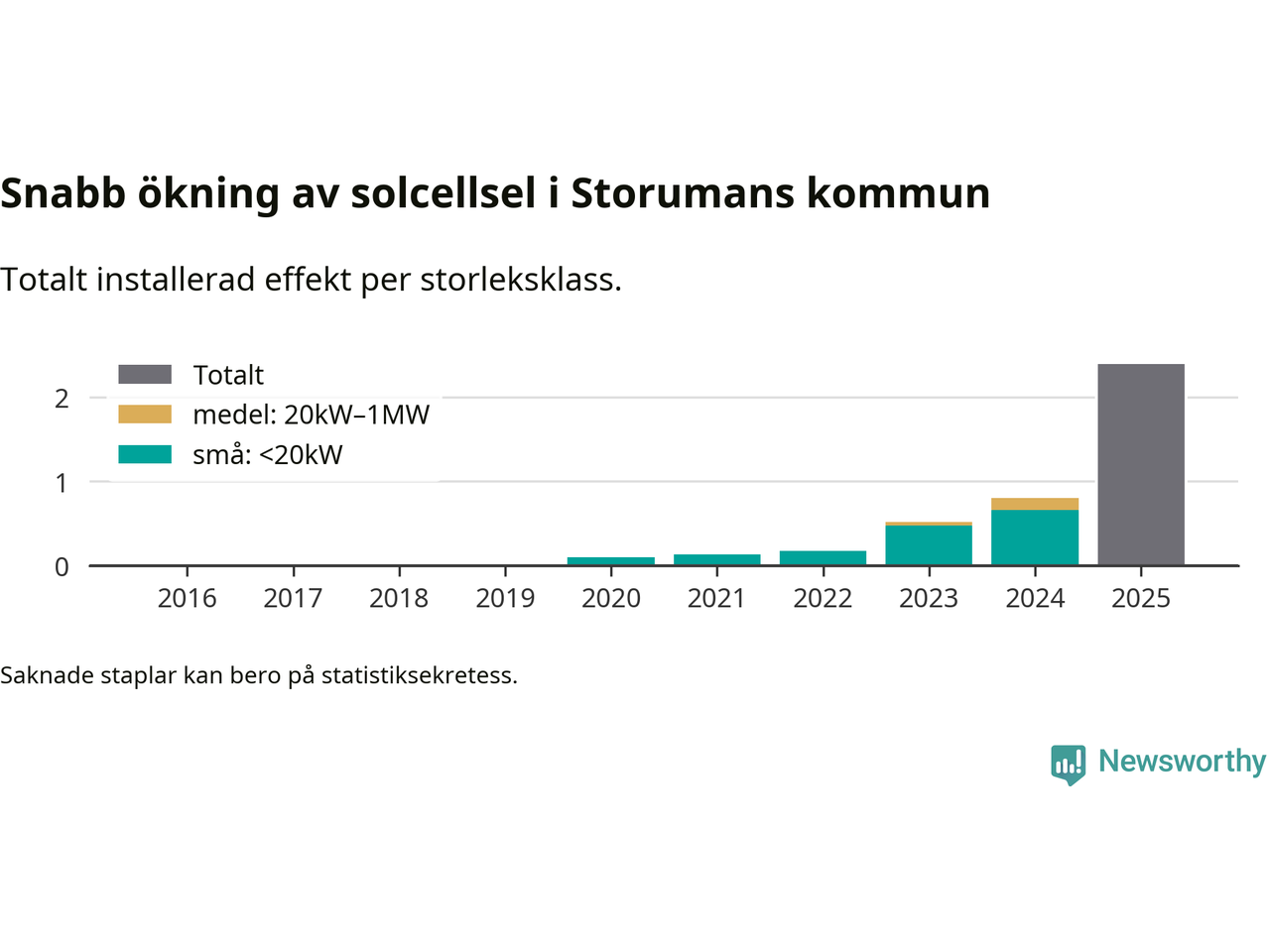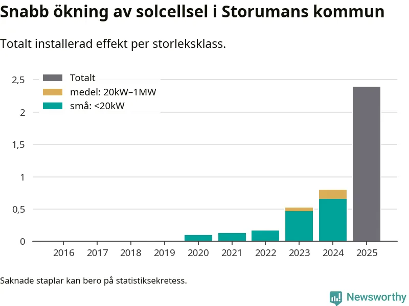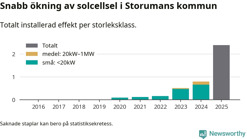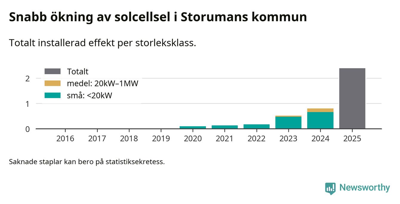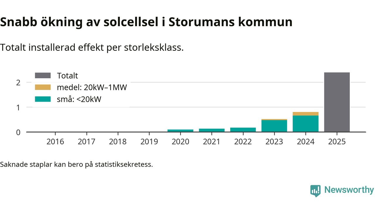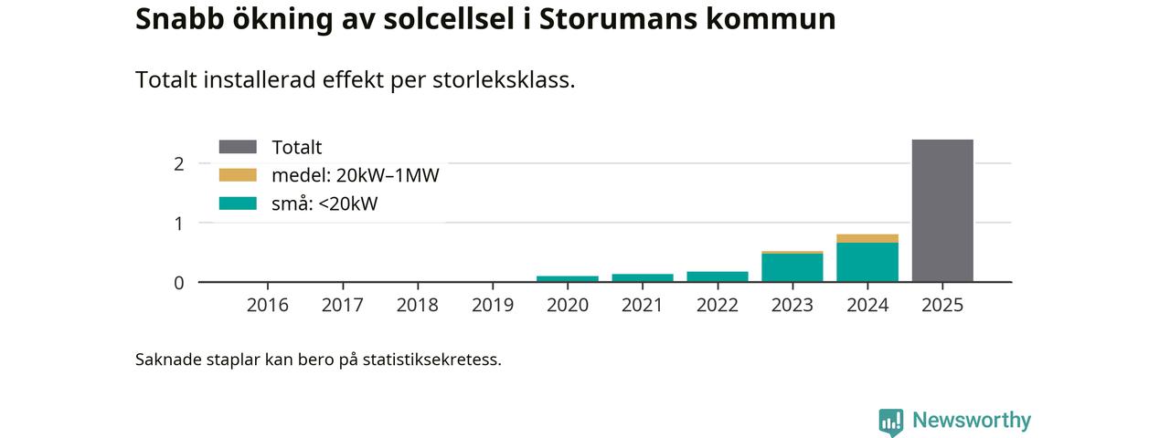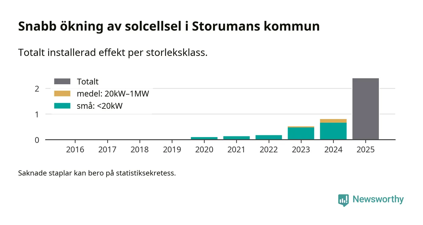 Under 2025 anslöts 1,6 megawatt ny solel till elnätet i Storumans kommun, vilket innebar mer nästan en tredubbling jämfört med året innan.