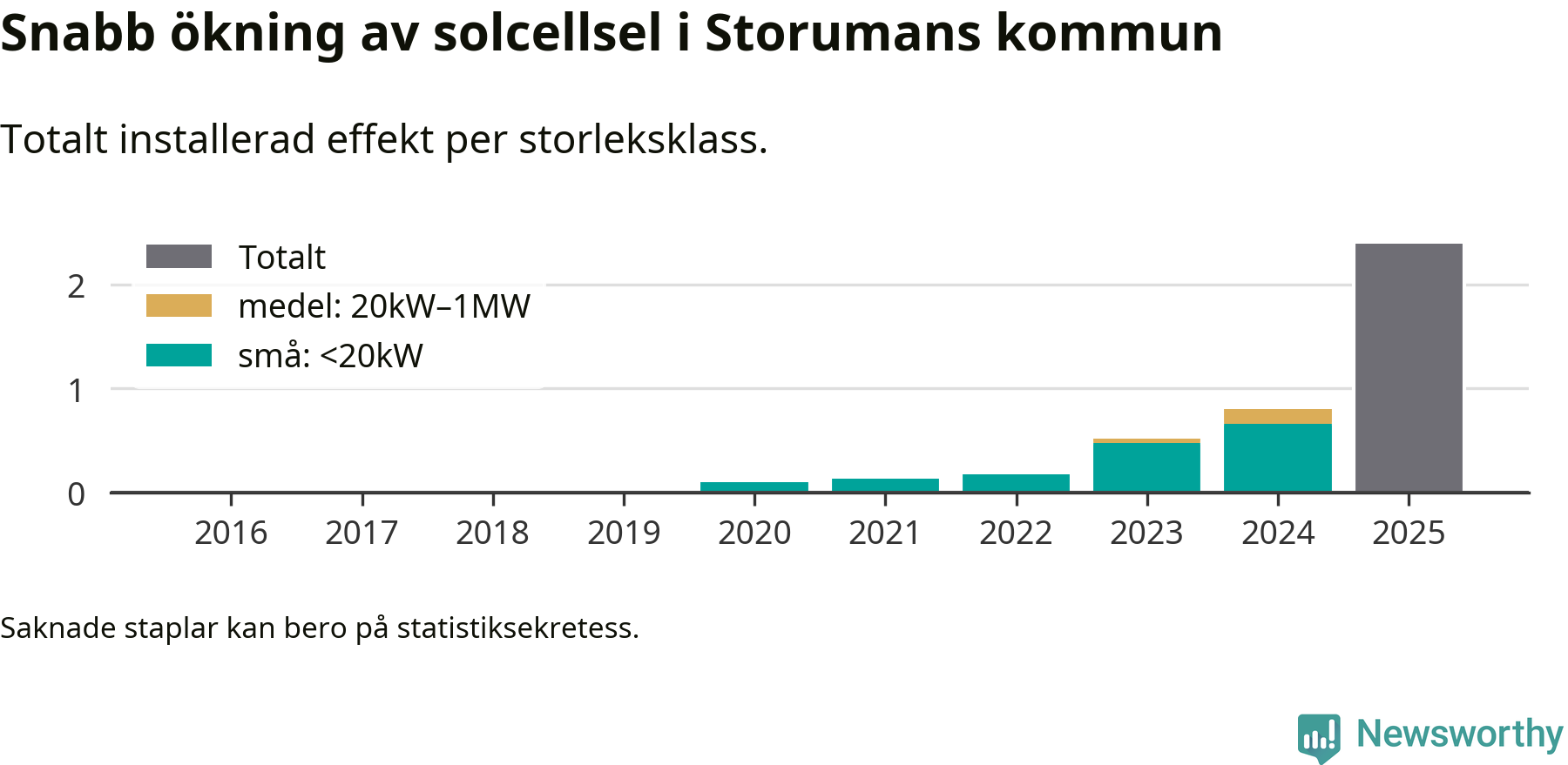 Det är framför allt de stora anläggningarna som driver tillväxten. Småskalig solel dominerar fortfarande produktionen – mer än hälften av effekten finns i anläggningar under 20 kilowatt – men det är bland de stora anläggningarna vi ser den största ökningstakten.