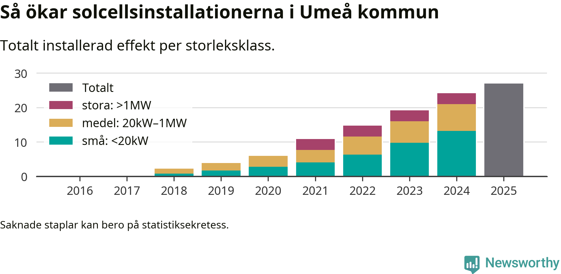 Det är framför allt de stora anläggningarna som driver tillväxten. Småskalig solel dominerar fortfarande produktionen – mer än hälften av effekten finns i anläggningar under 20 kilowatt – men det är bland de stora anläggningarna vi ser den största ökningstakten.