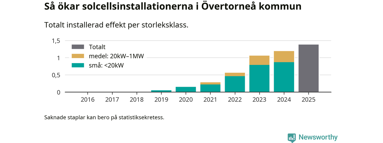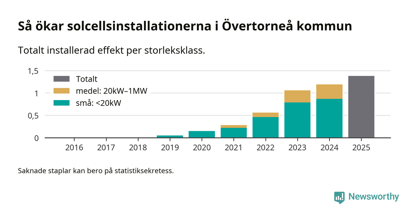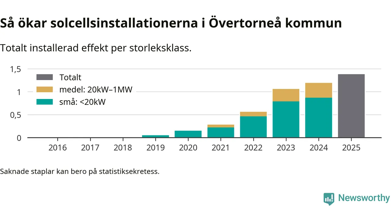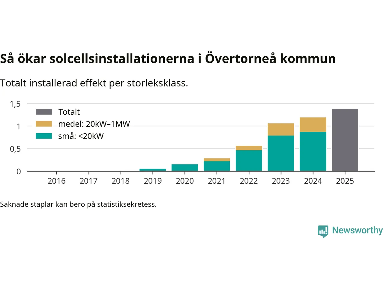 Under 2025 anslöts 190 kilowatt ny solel till elnätet i Övertorneå kommun, en ökning med 16 procent jämfört med året innan.