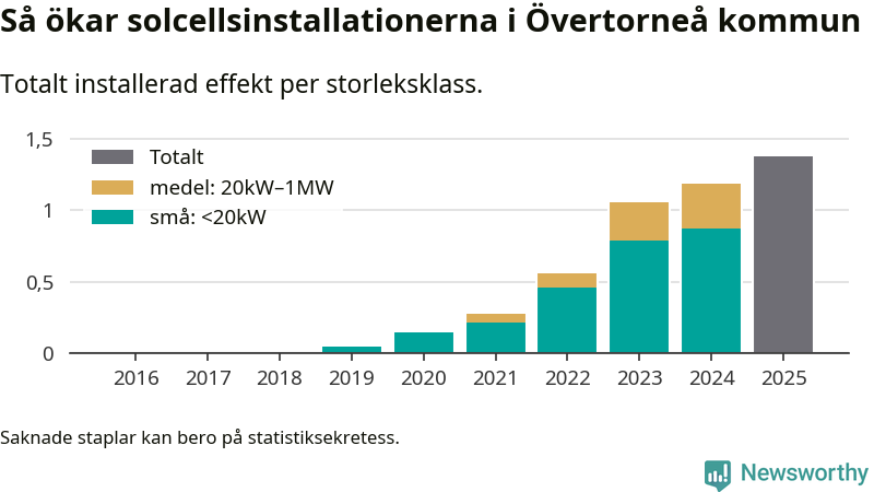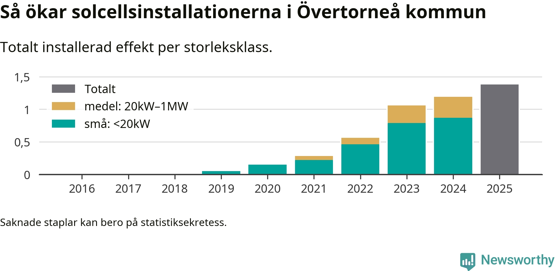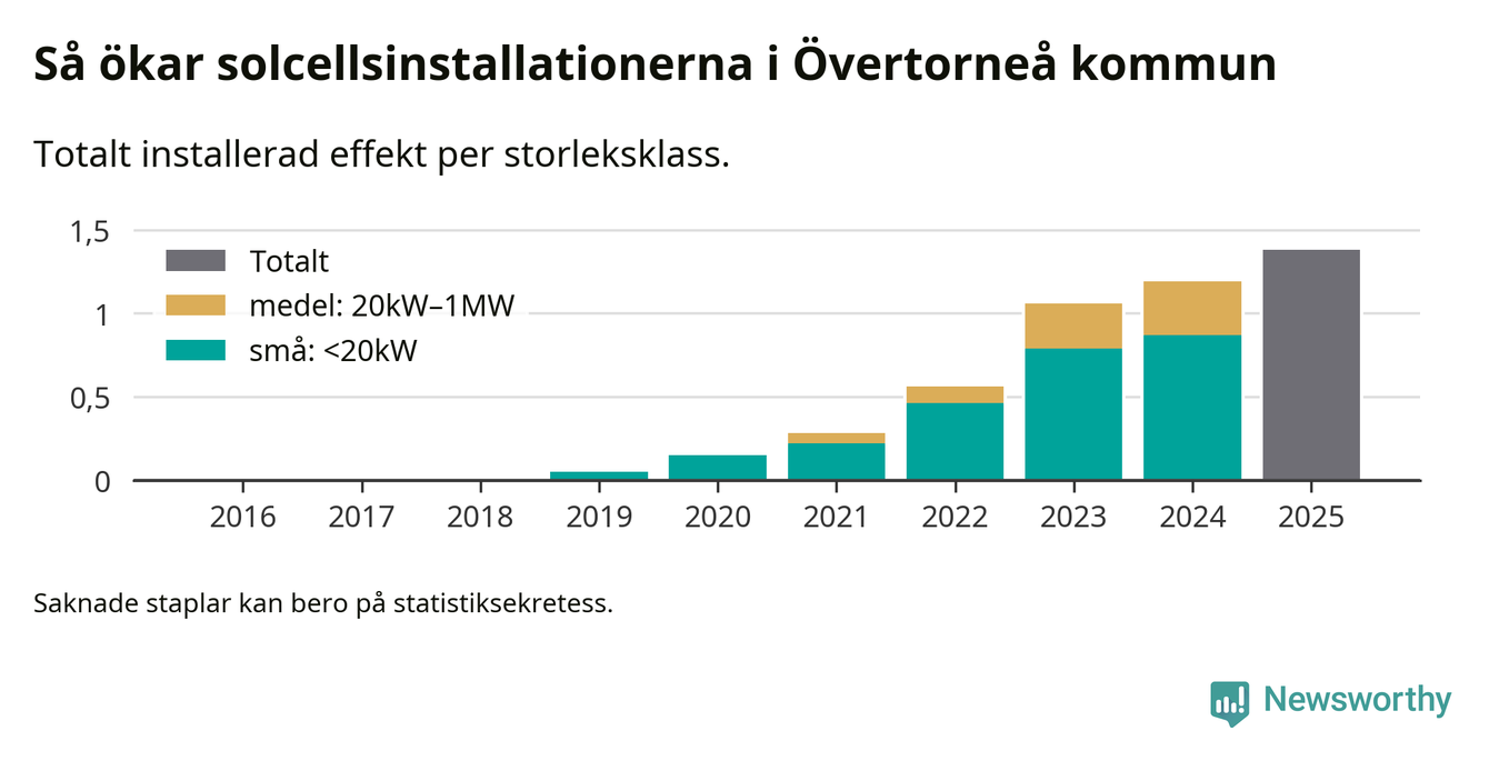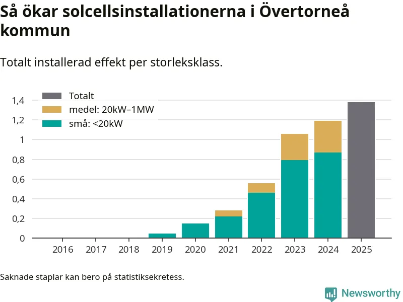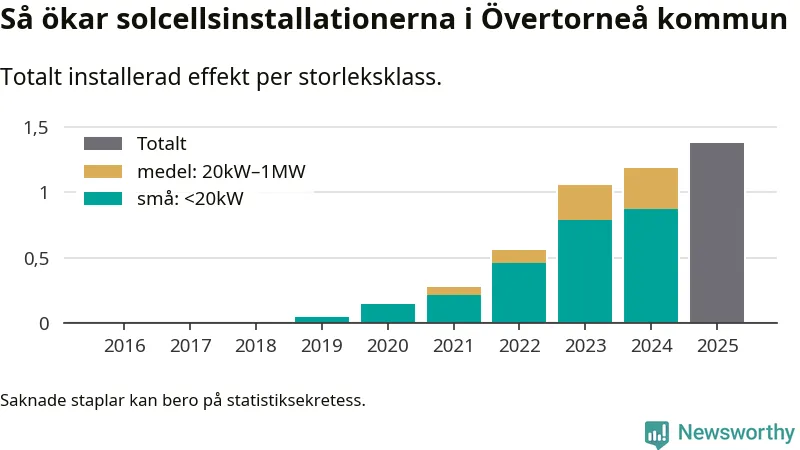 Under 2025 anslöts 190 kilowatt ny solel till elnätet i Övertorneå kommun, en ökning med 16 procent jämfört med året innan.