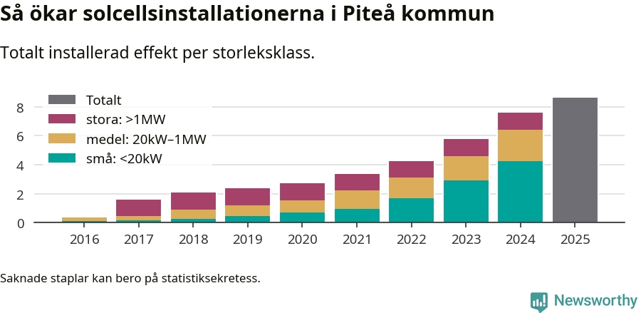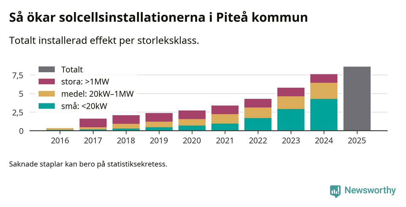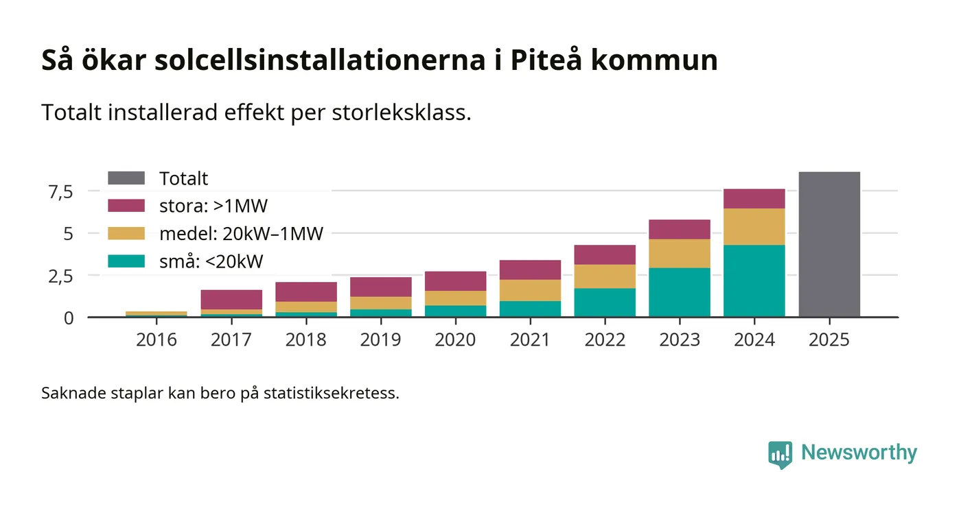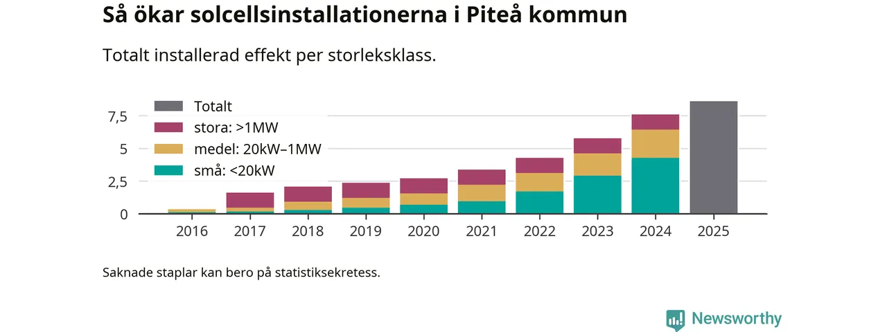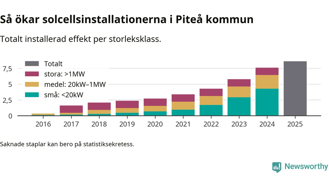 Under 2025 anslöts ett megawatt ny solel till elnätet i Piteå kommun, en ökning med 13 procent jämfört med året innan.