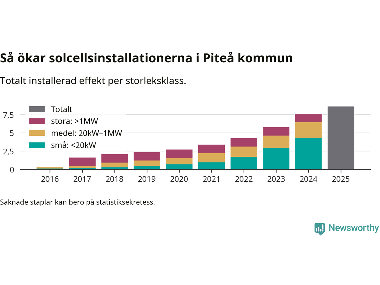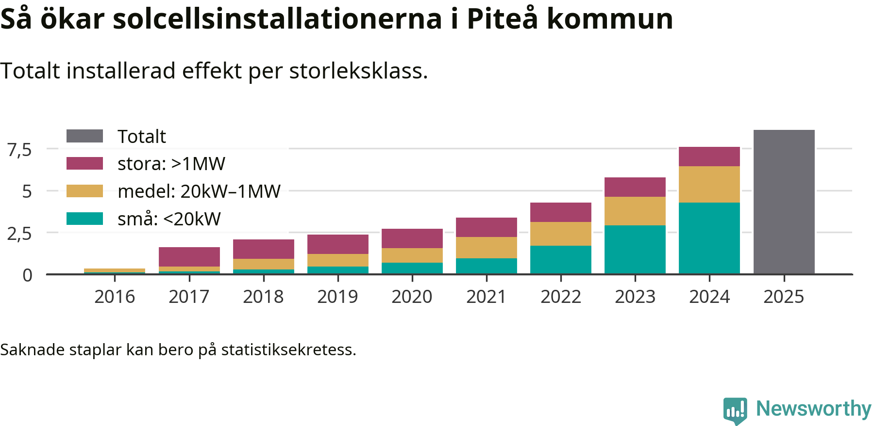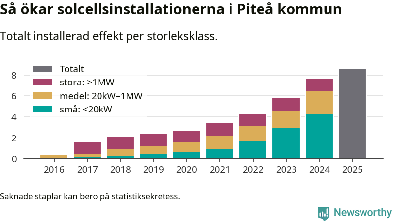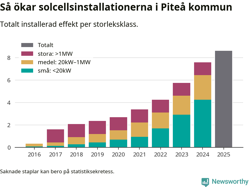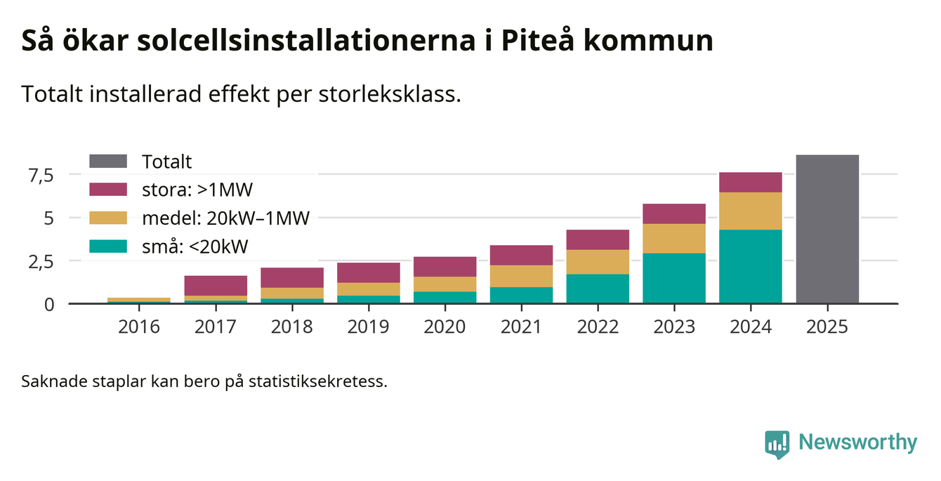 Under 2025 anslöts ett megawatt ny solel till elnätet i Piteå kommun, en ökning med 13 procent jämfört med året innan.