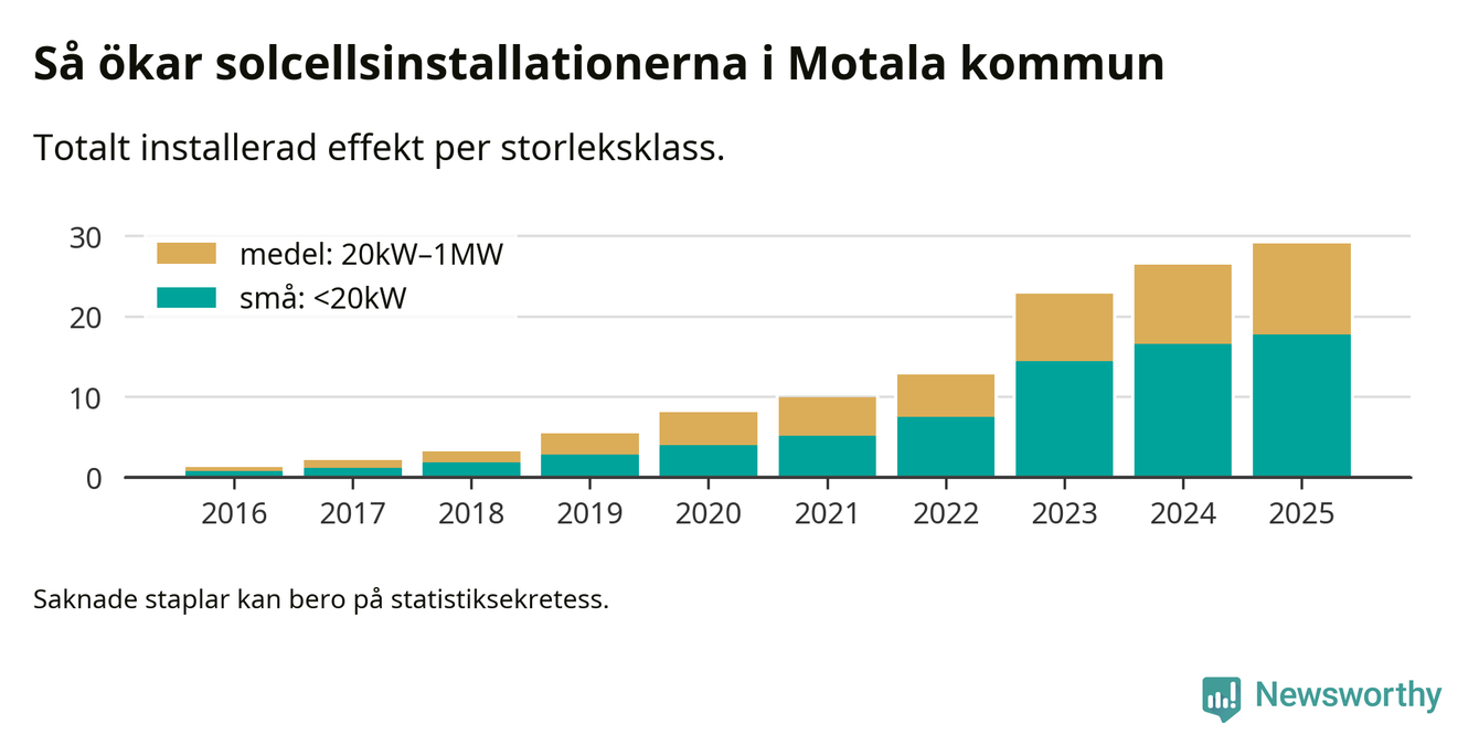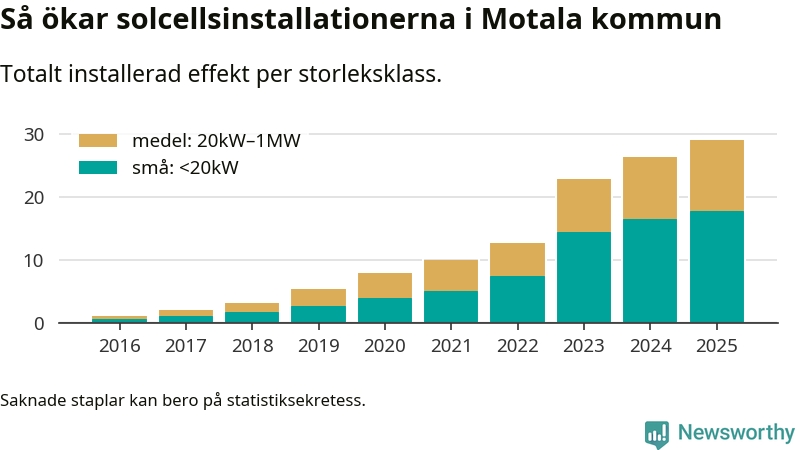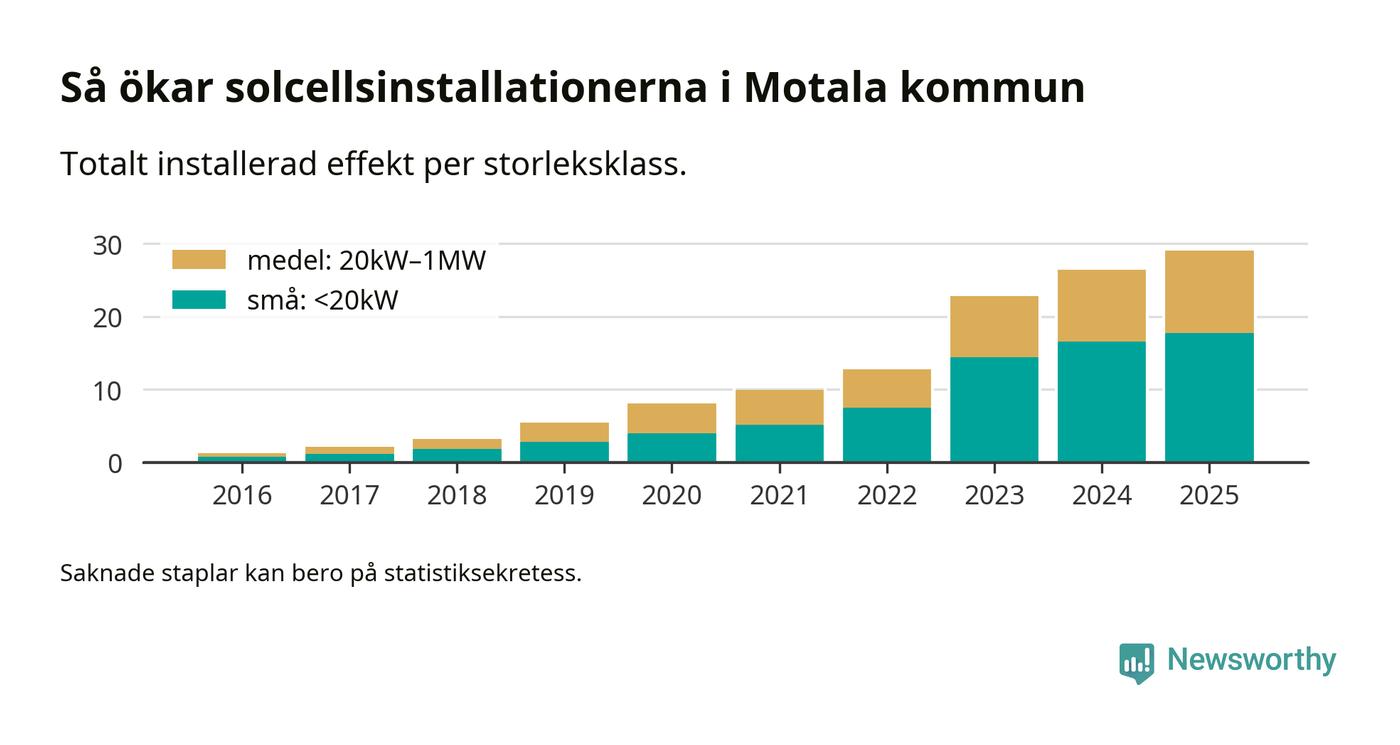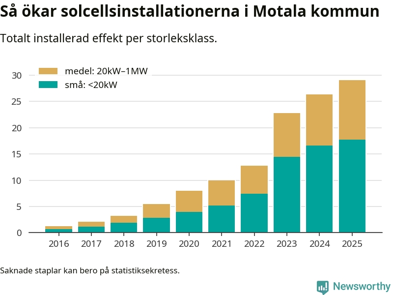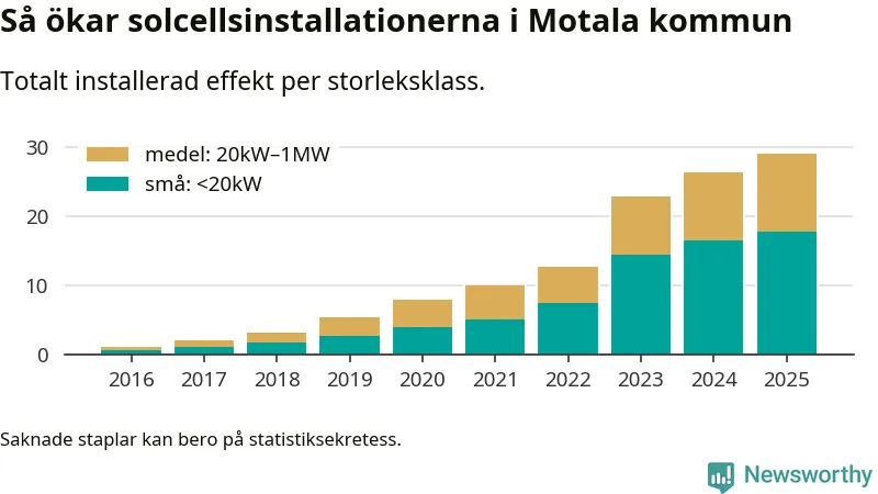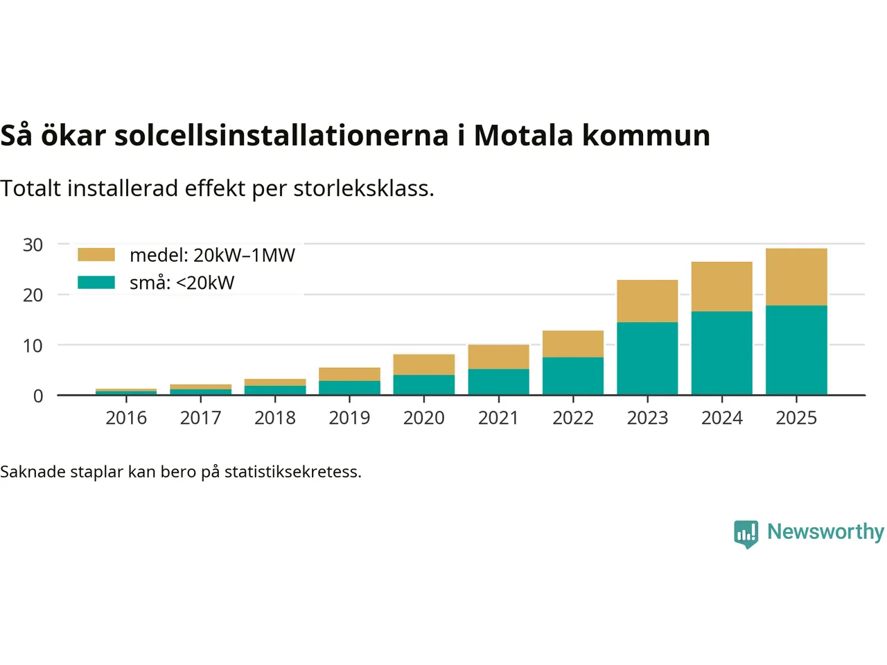 Under 2025 anslöts 2,7 megawatt ny solel till elnätet i Motala kommun, en ökning med 10 procent jämfört med året innan.