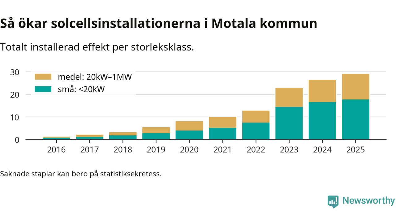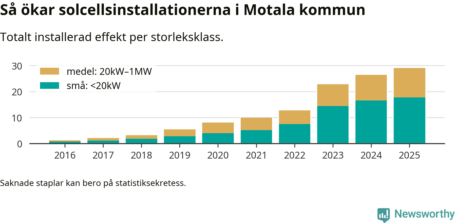 Den största delen av solelen i Motala, 61 procent, kommer från småskaliga anläggningar, totalt 1 710 stycken. Det påminner om hur det ser ut i riket som helhet. I hela Sverige står anläggningar under 20 kilowatt för mer än hälften av den installerade effekten. Generellt är deras andel störst i kommuner med många villahushåll, medan större anläggningar dominerar i tätbefolkade kommuner med fler flerfamiljsbostäder – och förstås i de småkommuner som har någon av landets stora markanläggningar för solel.