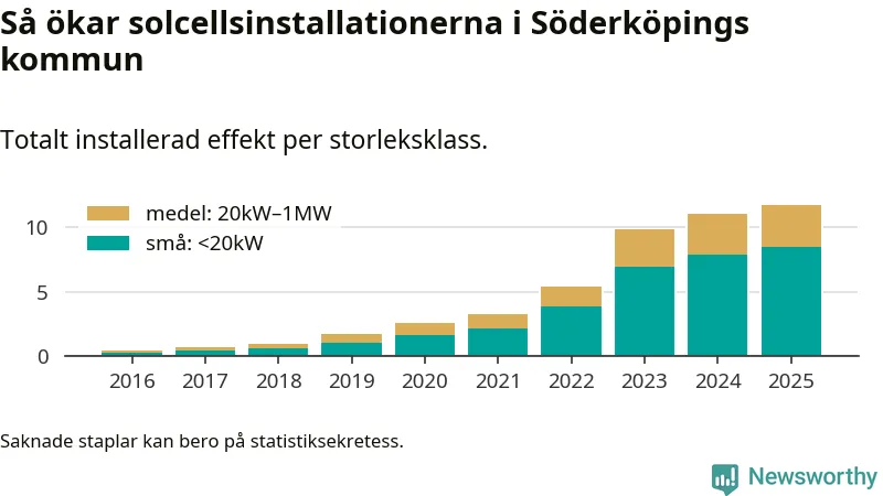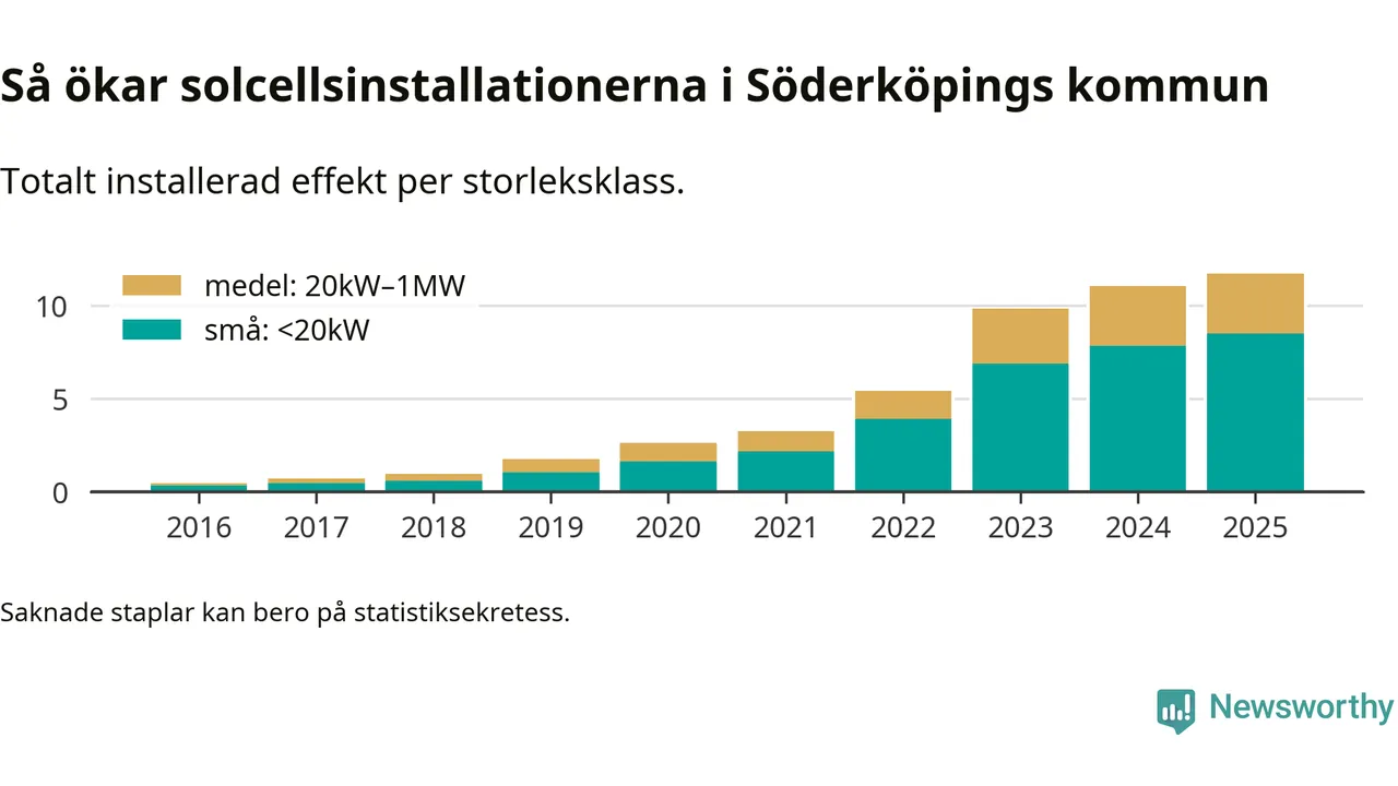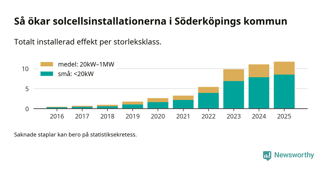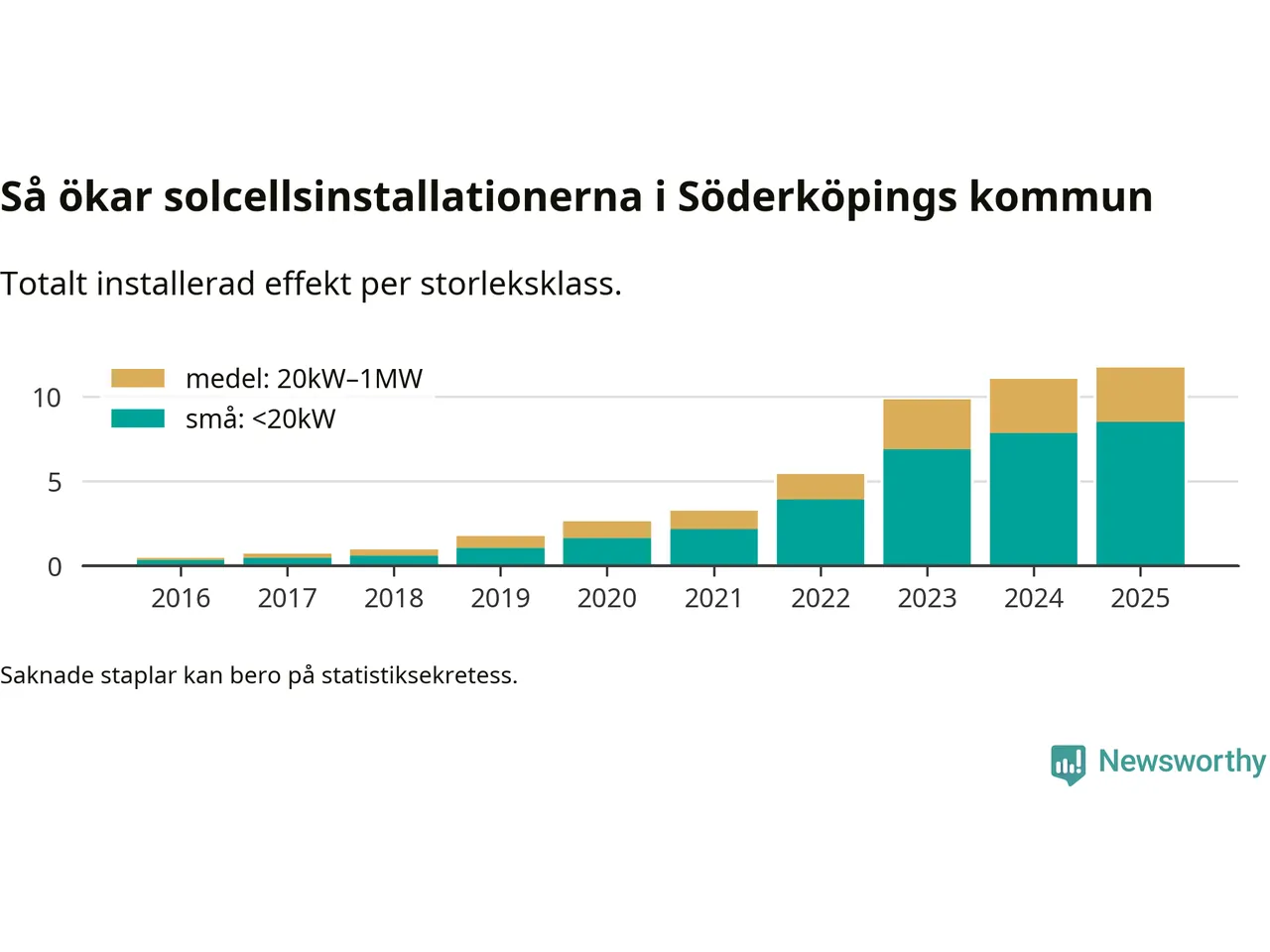Under 2025 anslöts 0,7 megawatt ny solel till elnätet i Söderköpings kommun, en ökning med 6 procent jämfört med året innan.