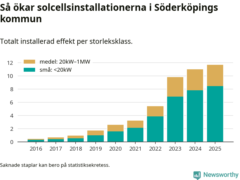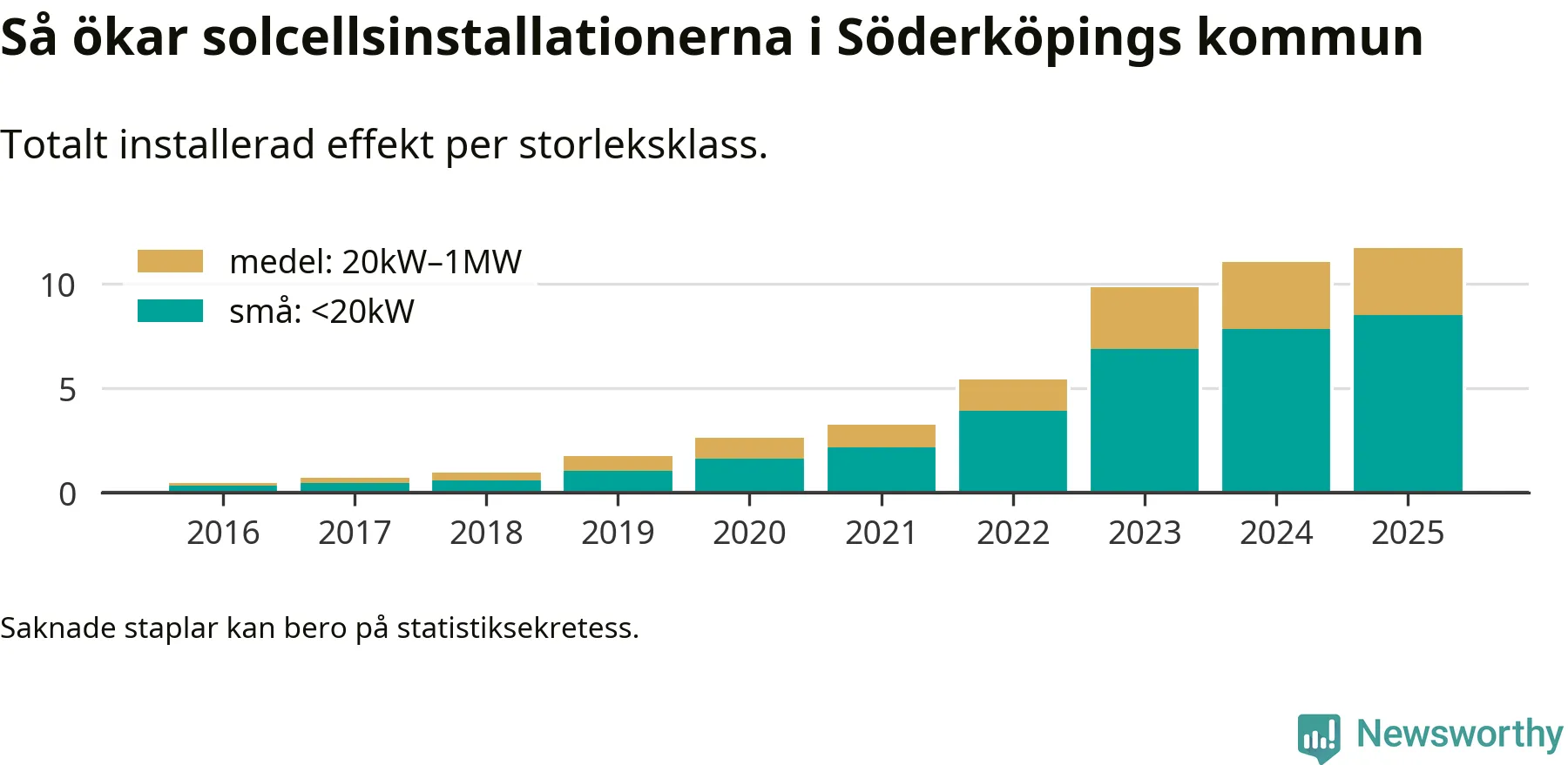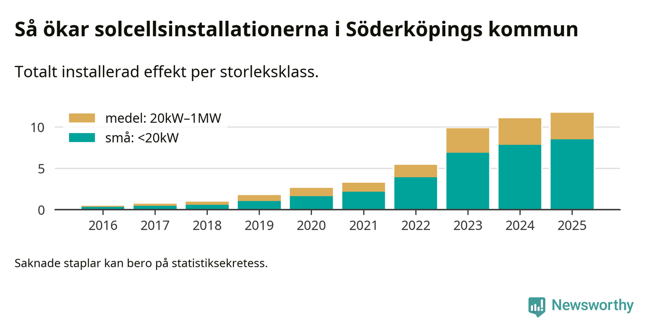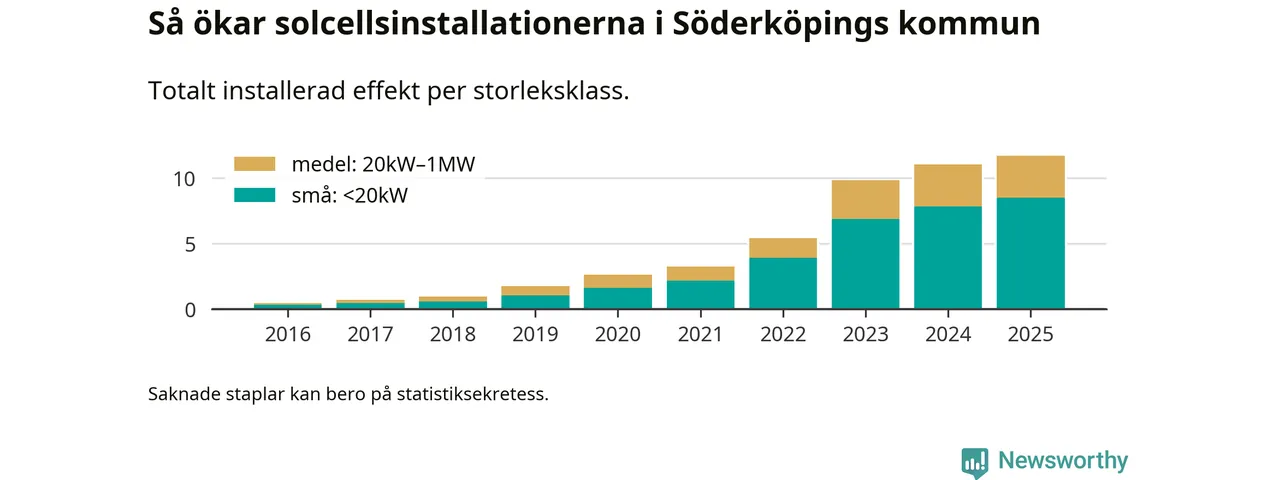 Under 2025 anslöts 0,7 megawatt ny solel till elnätet i Söderköpings kommun, en ökning med 6 procent jämfört med året innan.