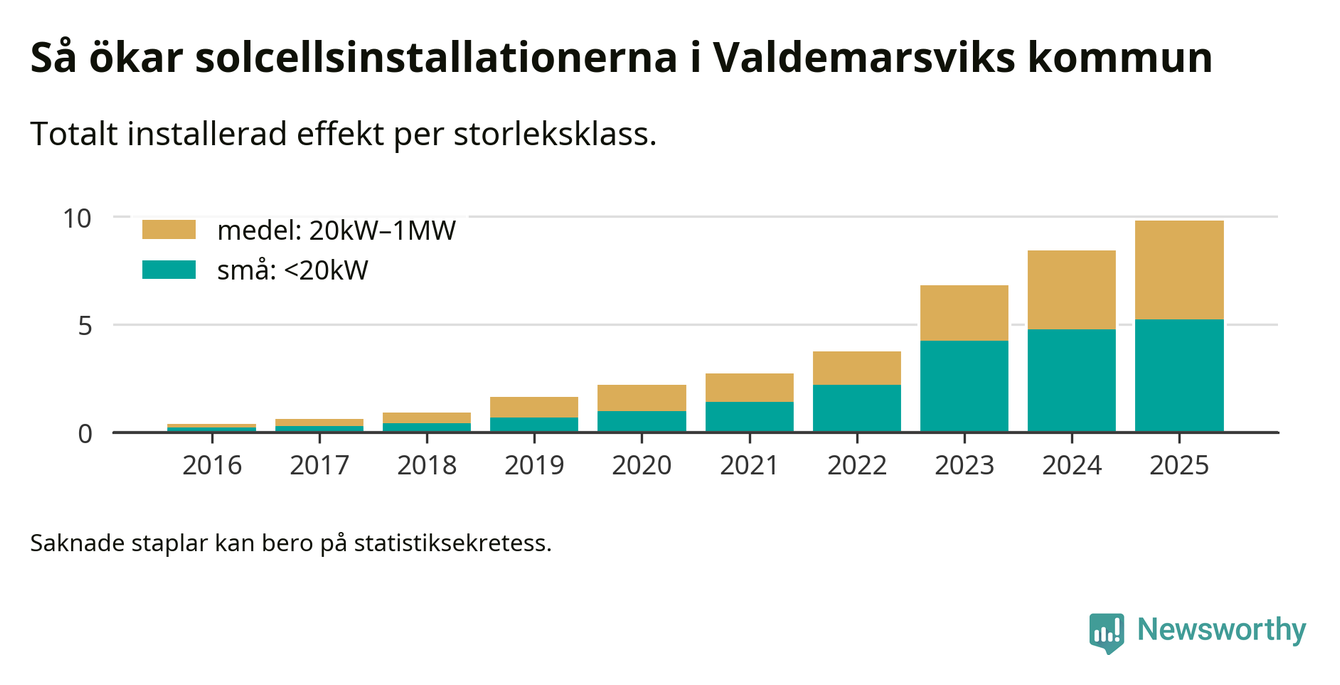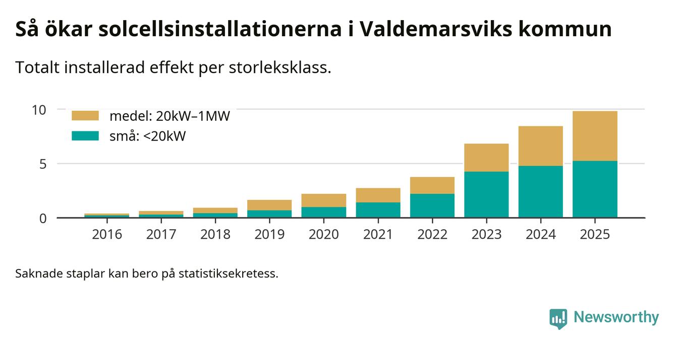 Totalt finns 582 nätanslutna anläggningar, om sammanlagt 9,8 megawatt i kommunen. Det motsvarar, i runda tal, en elproduktion på någonstans mellan 20 och 22 procent av vad hushållen i Valdemarsvik förbrukar per år.1