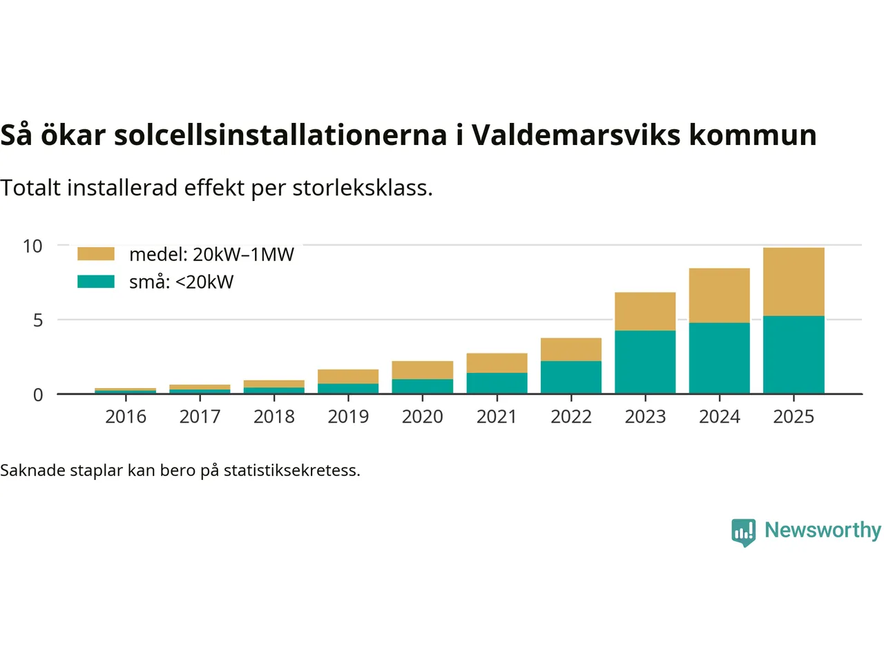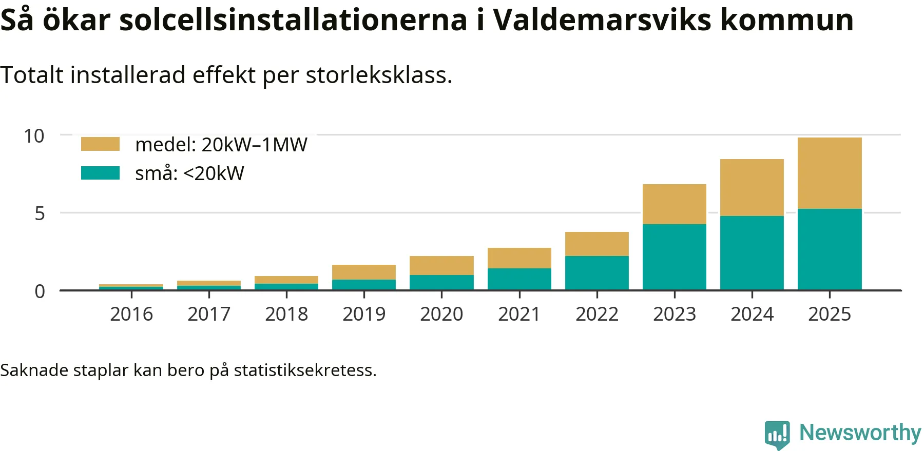 Det är framför allt de stora anläggningarna som driver tillväxten. Småskalig solel dominerar fortfarande produktionen – mer än hälften av effekten finns i anläggningar under 20 kilowatt – men det är bland de stora anläggningarna vi ser den största ökningstakten.