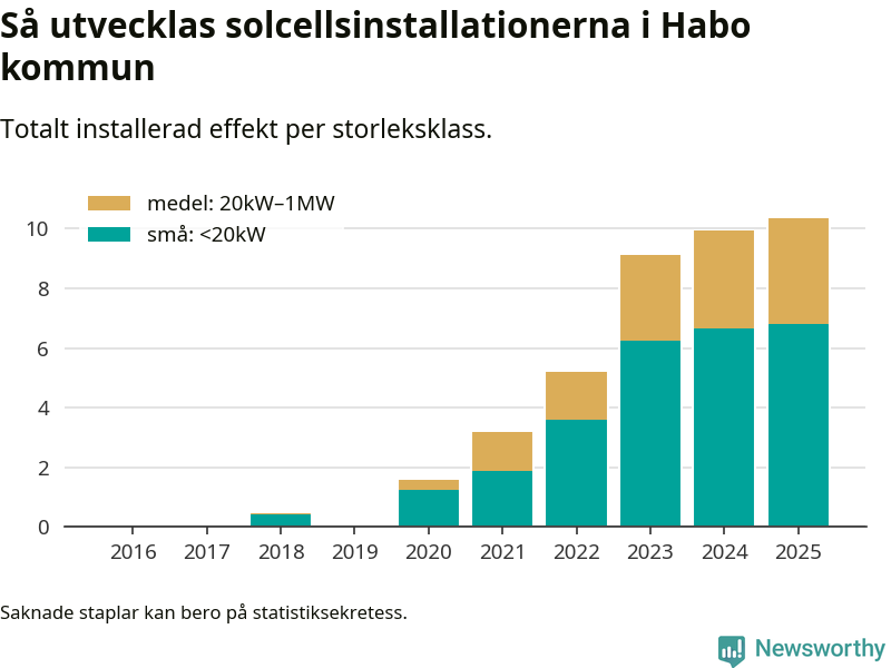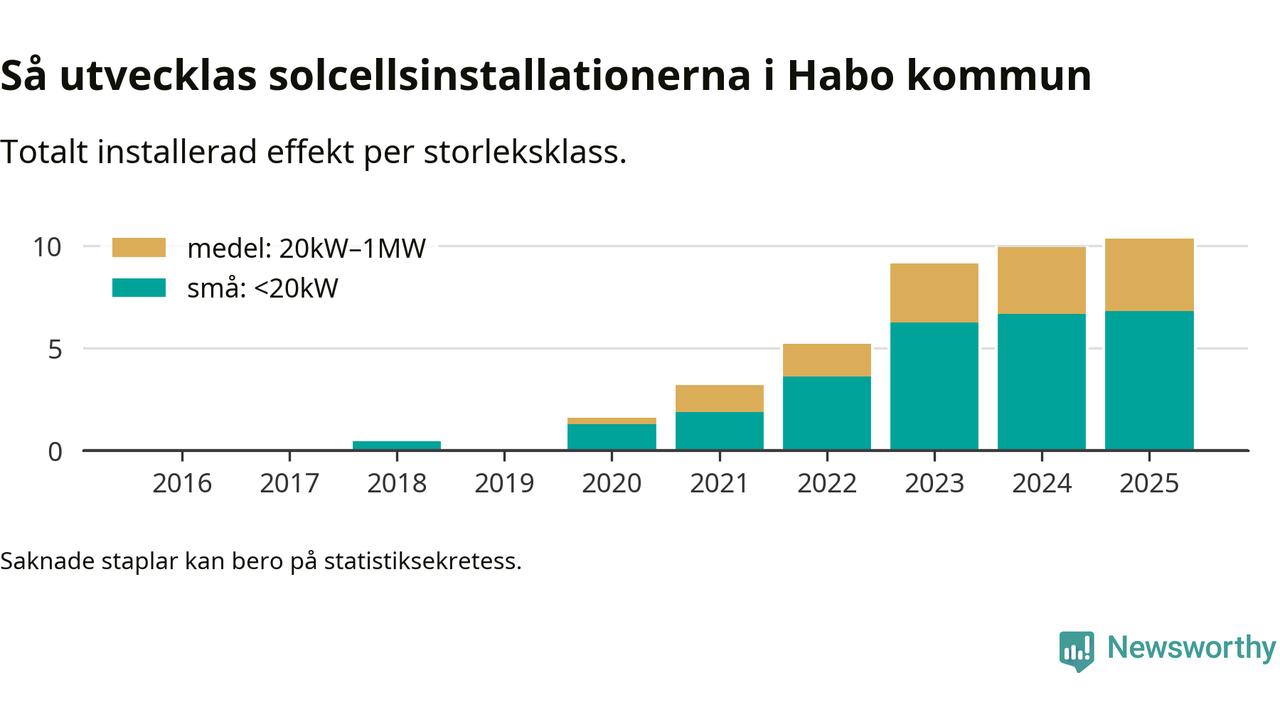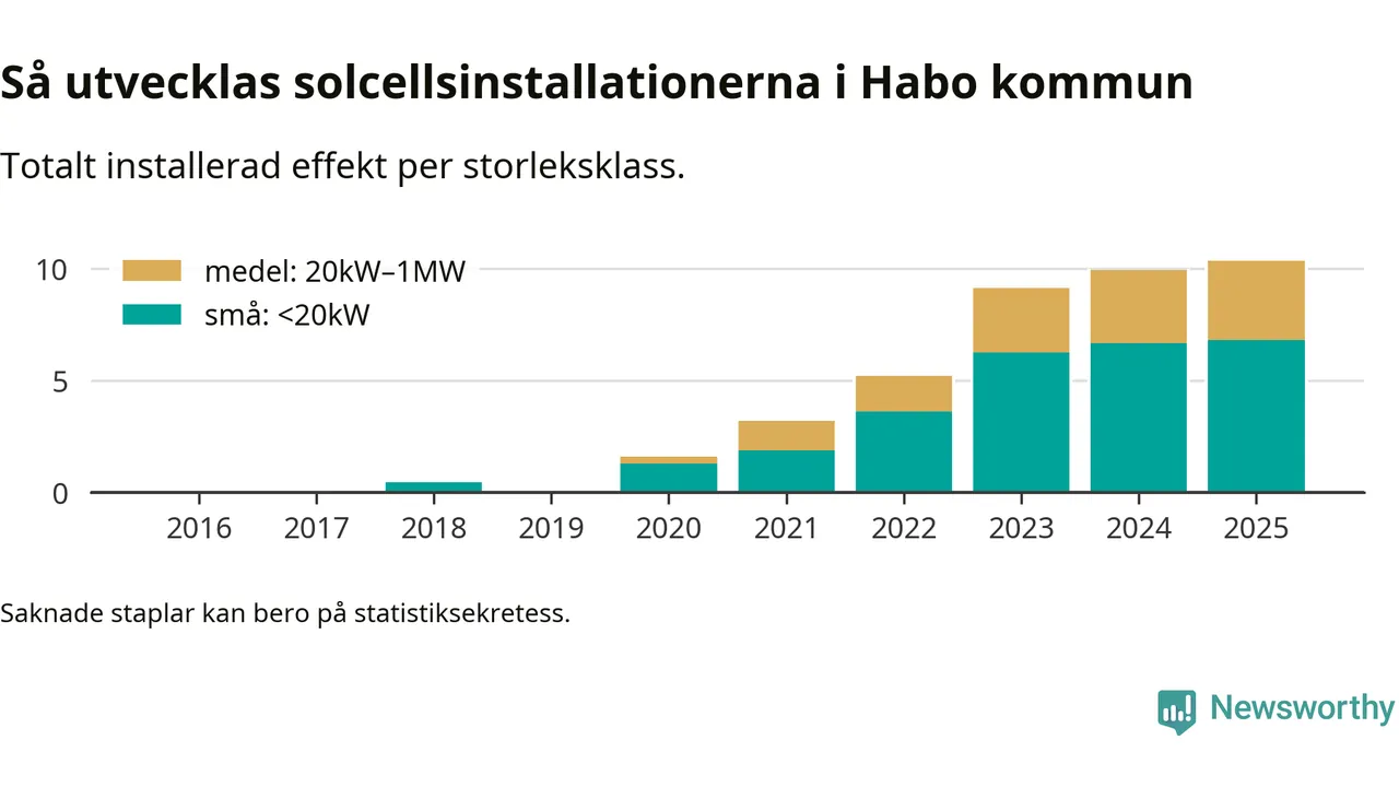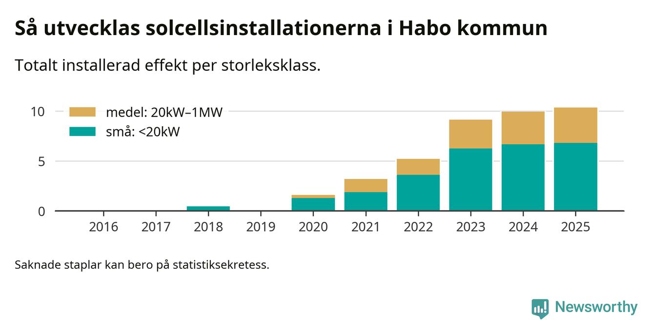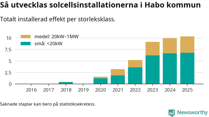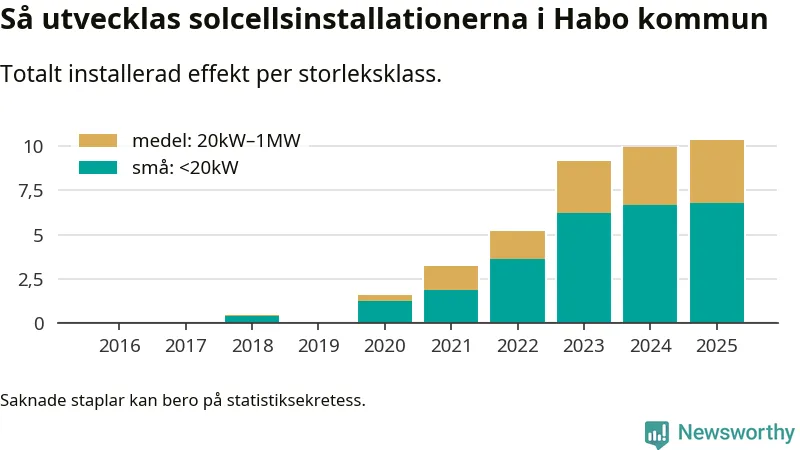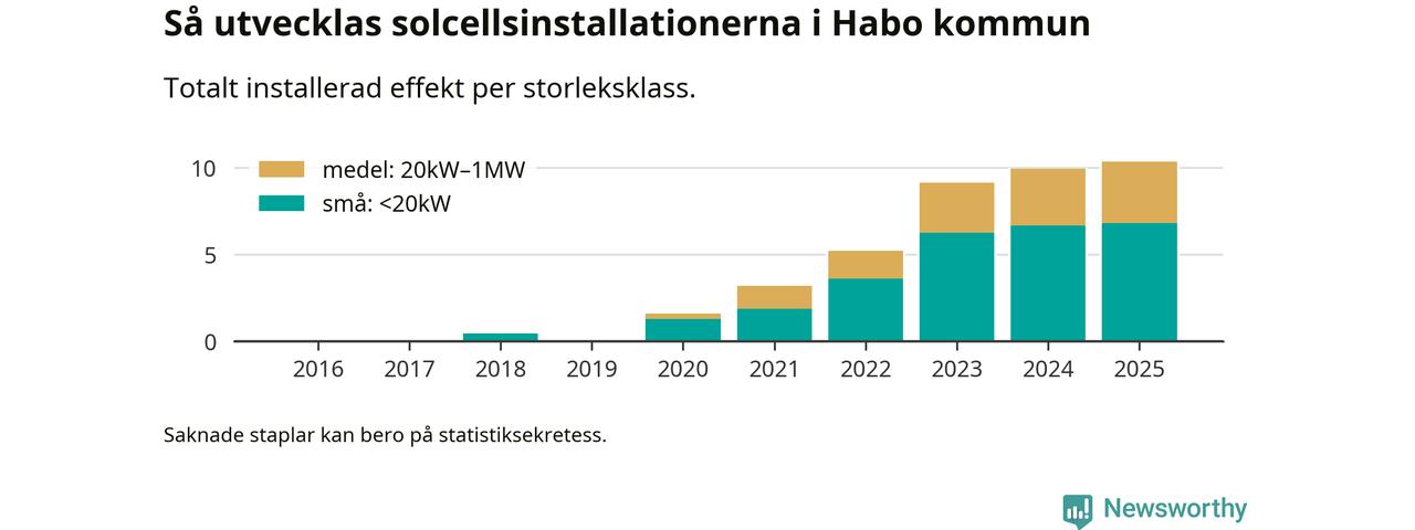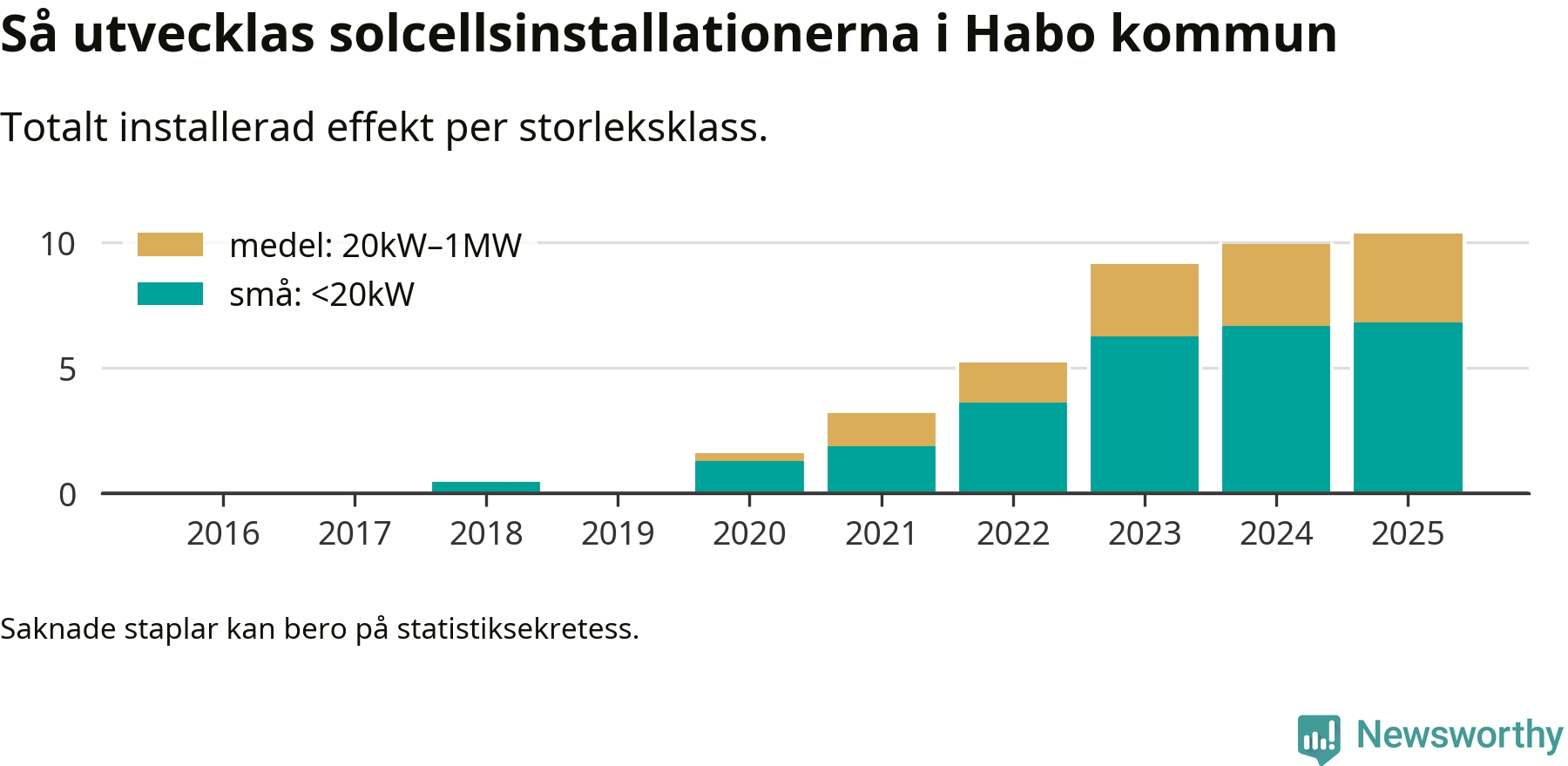 Den största delen av solelen i Habo, 66 procent, kommer från småskaliga anläggningar, totalt 641 stycken. Det påminner om hur det ser ut i riket som helhet. I hela Sverige står anläggningar under 20 kilowatt för mer än hälften av den installerade effekten. Generellt är deras andel störst i kommuner med många villahushåll, medan större anläggningar dominerar i tätbefolkade kommuner med fler flerfamiljsbostäder – och förstås i de småkommuner som har någon av landets stora markanläggningar för solel.