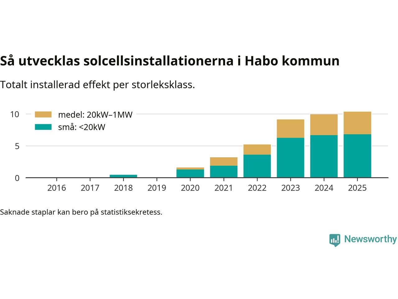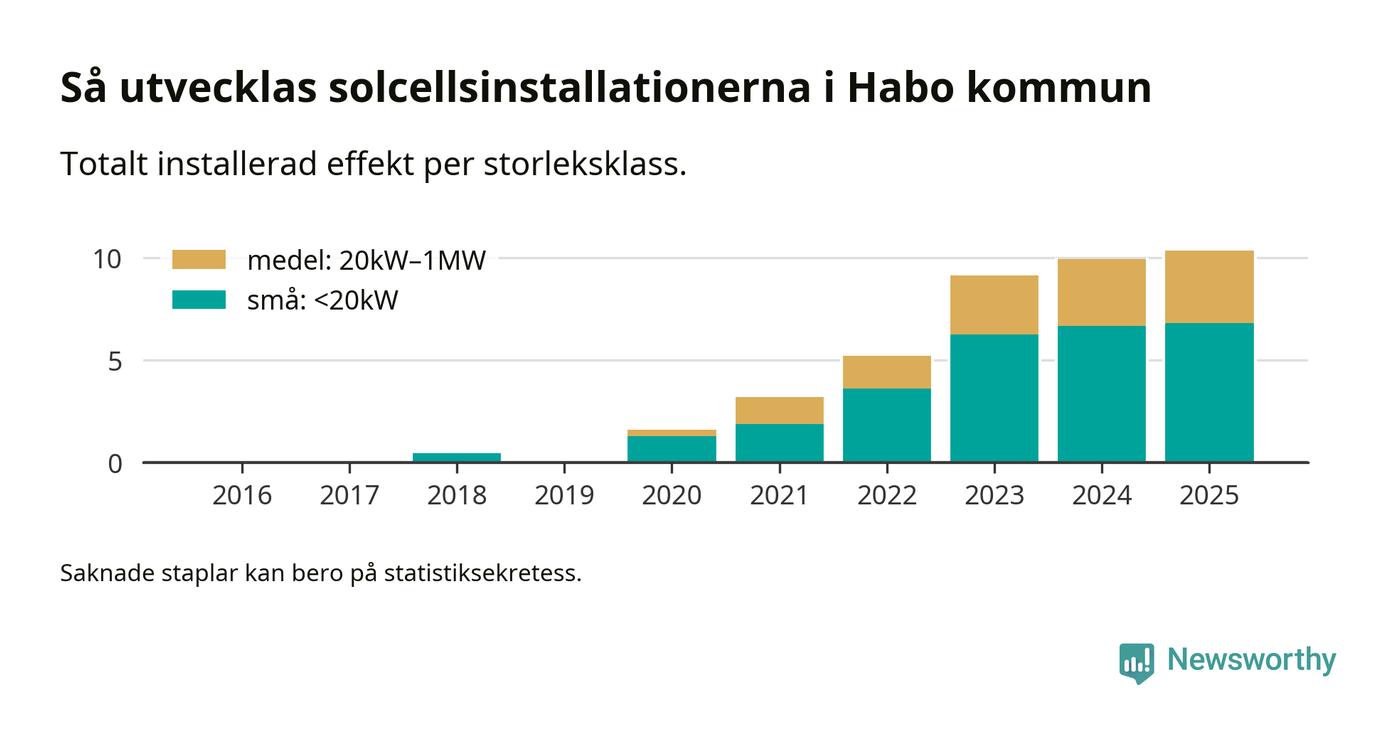 Totalt finns 704 nätanslutna anläggningar, om sammanlagt 10,3 megawatt i kommunen. Det motsvarar, i runda tal, en elproduktion på någonstans mellan 17 och 20 procent av vad hushållen i Habo förbrukar per år.1